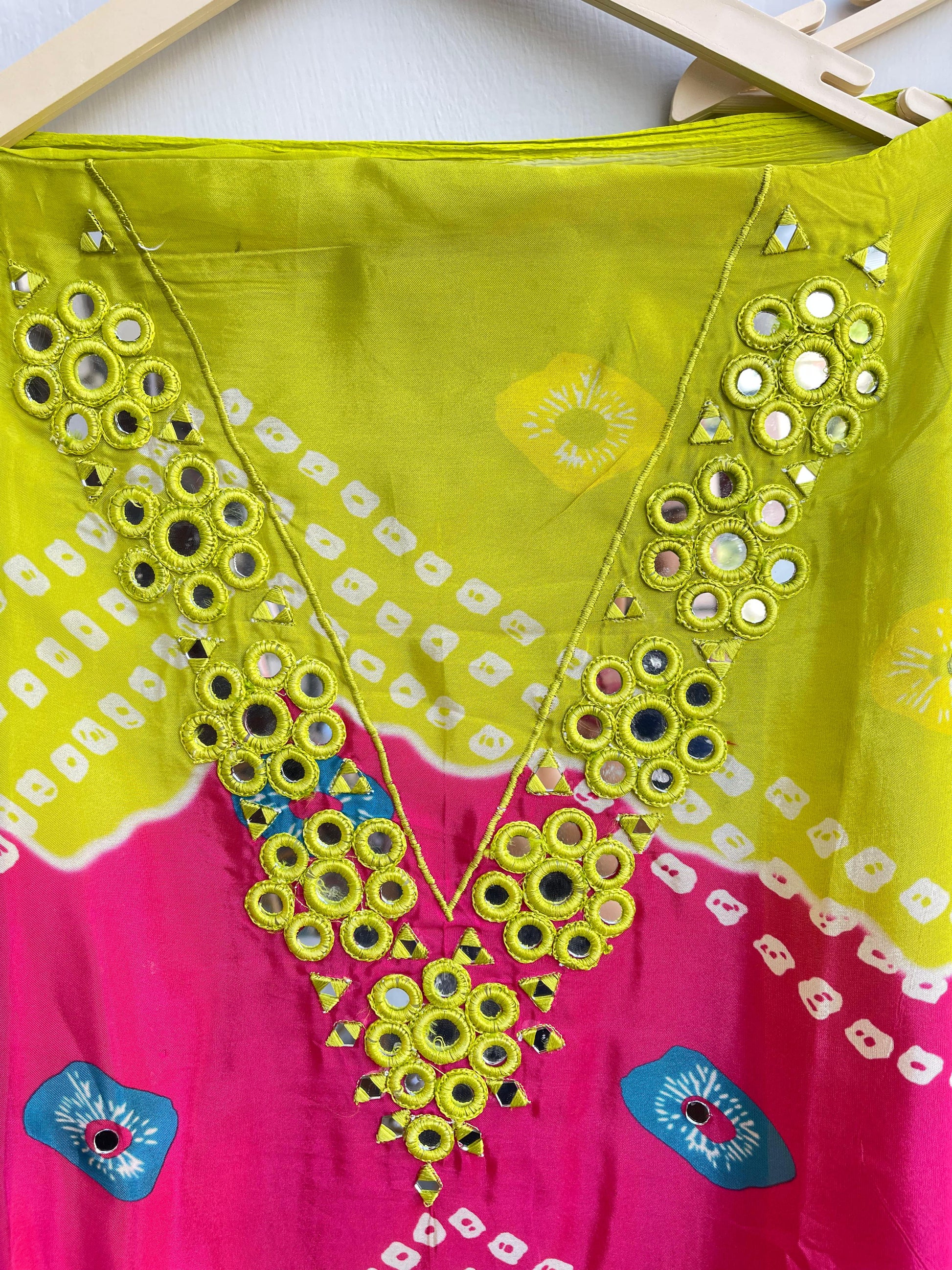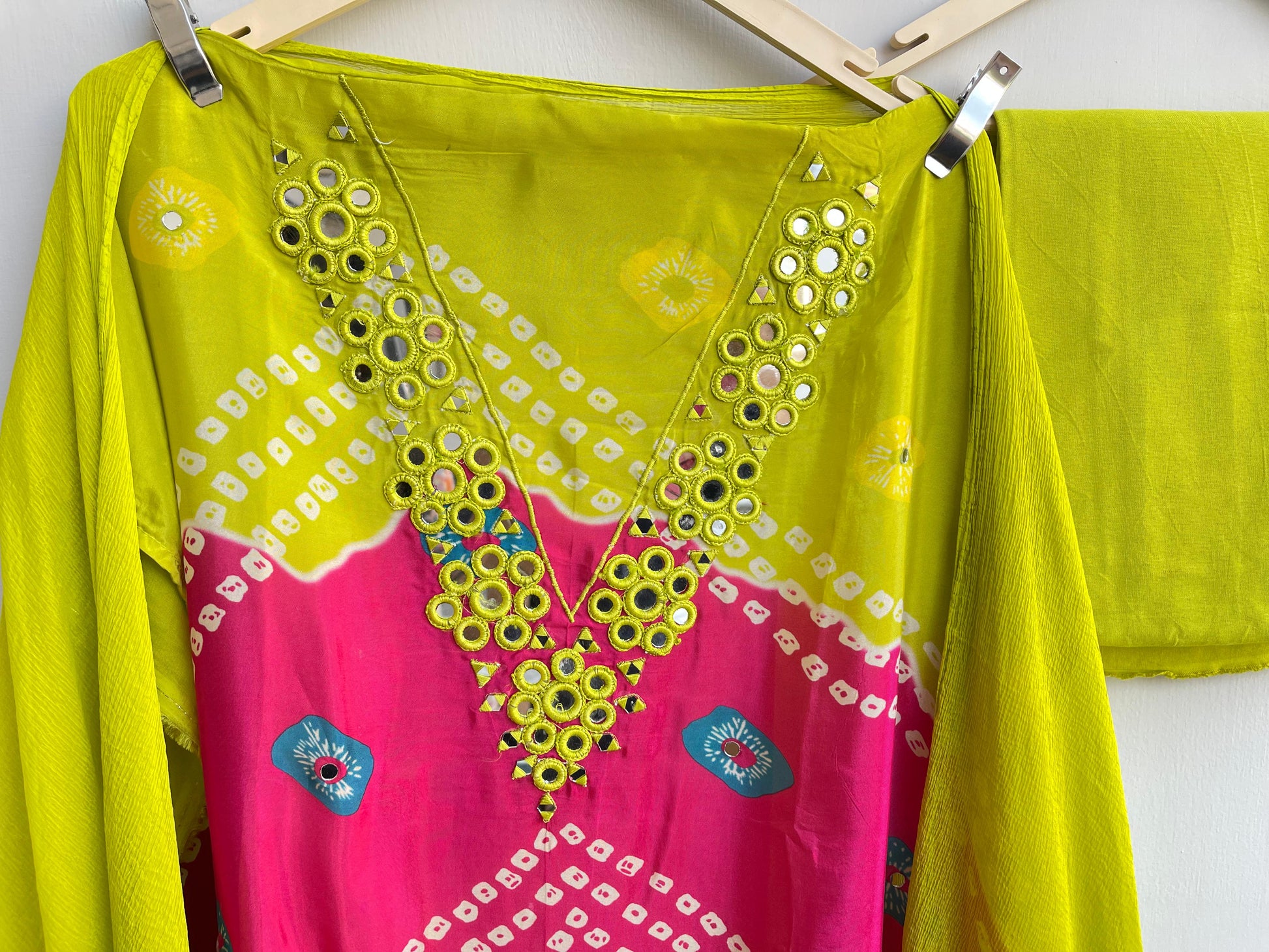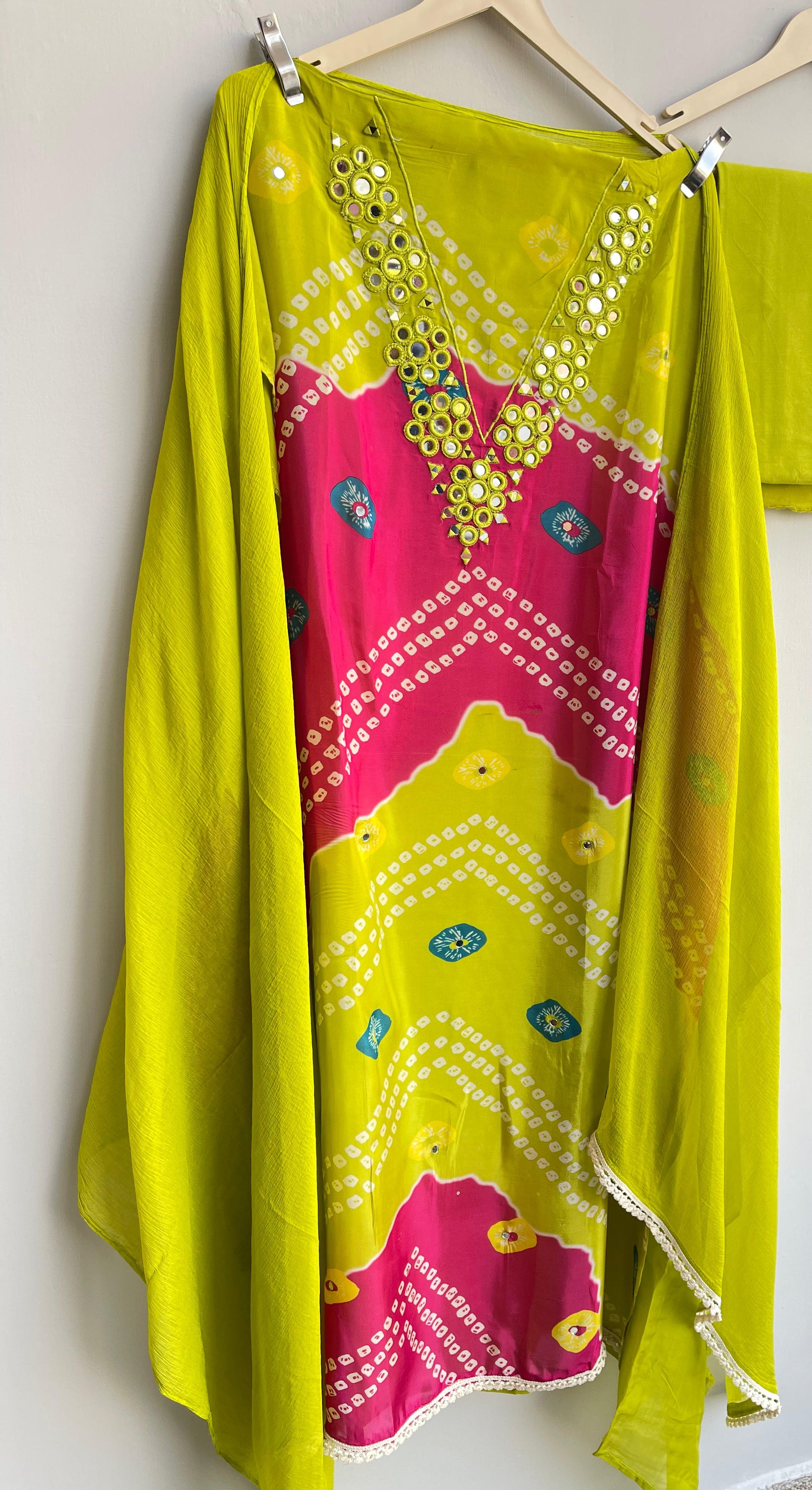 ๐glass organza bandni printed fabric unstitched shirt with actual mirror work resham embroidery and crotia ghera lace