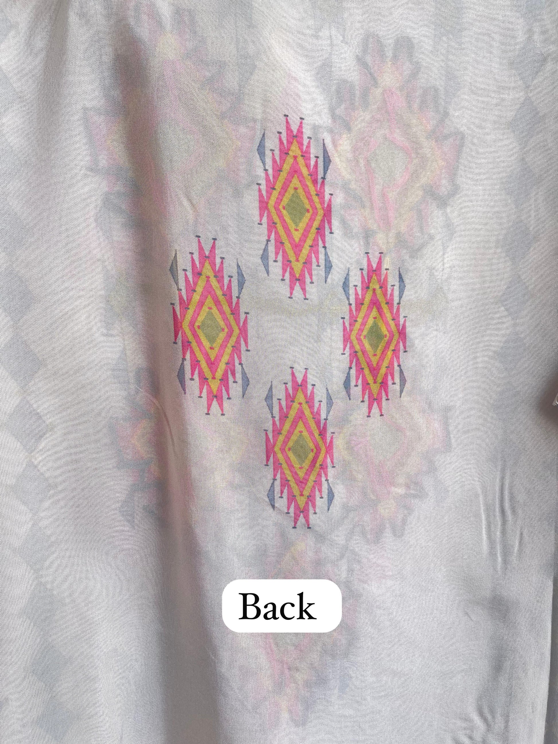 π pure organza printed fabric unstitched shirt with resham highlighting and pearl embroidery and front tassels