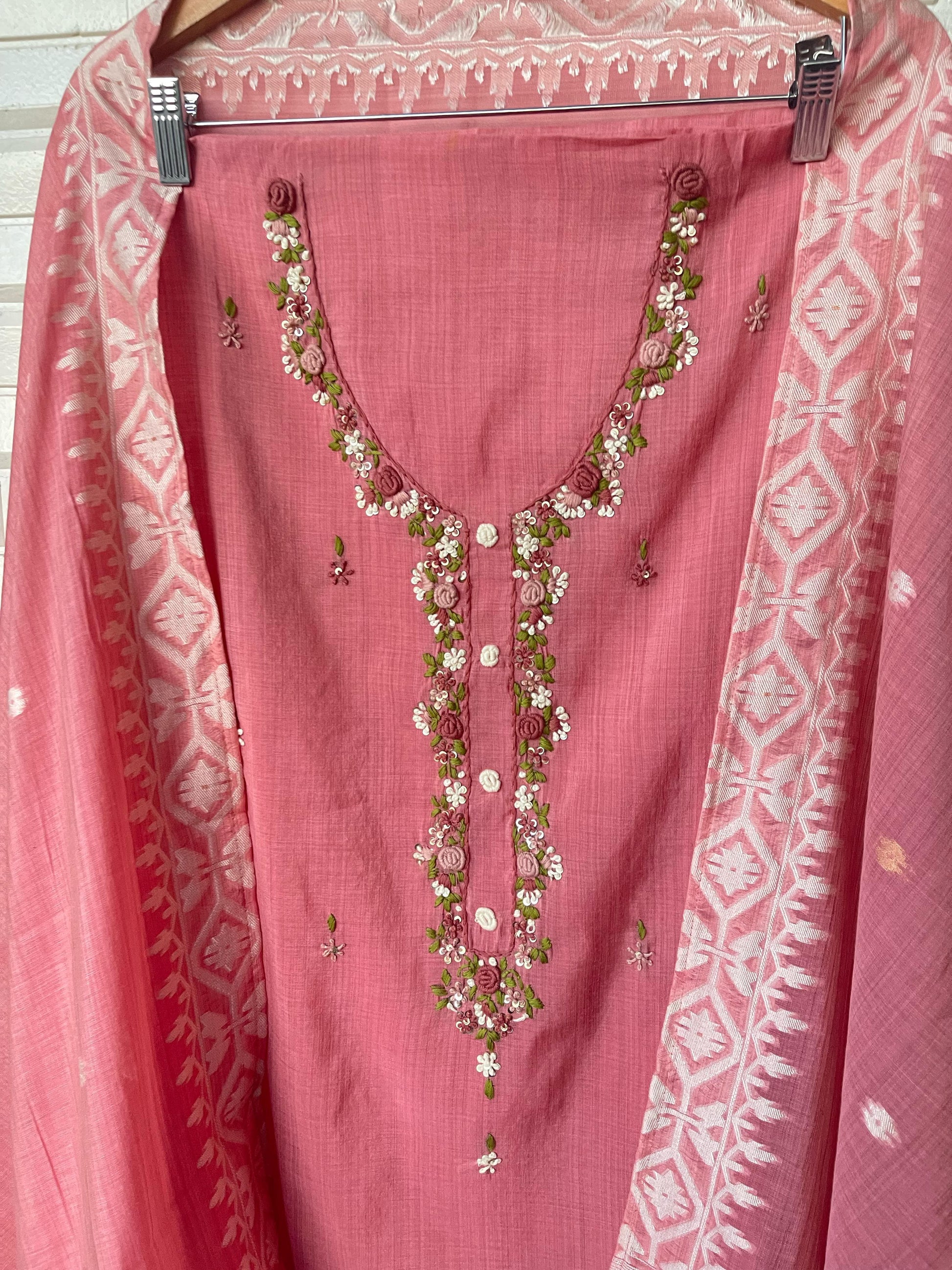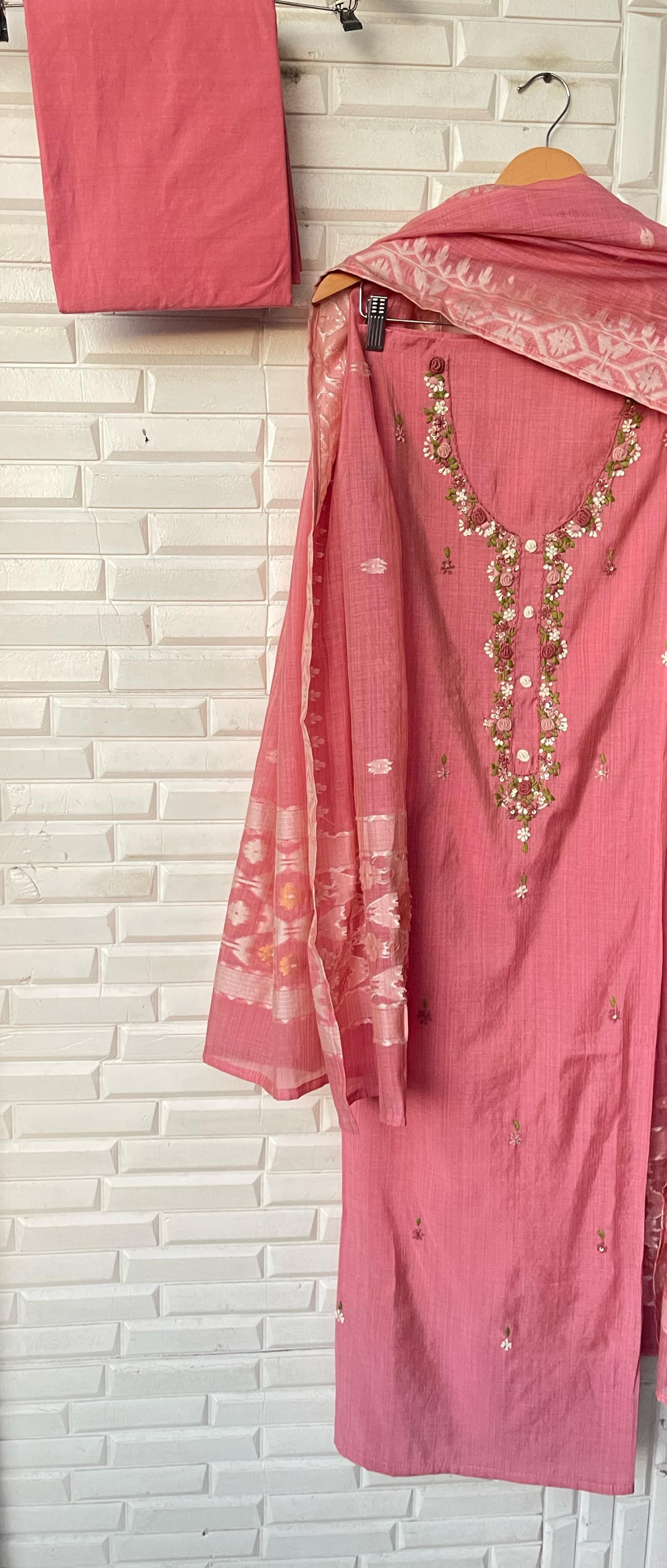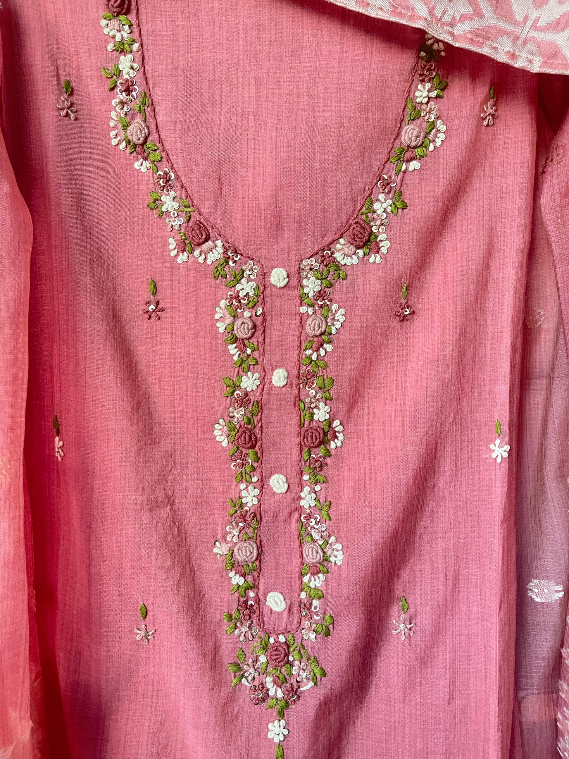 đ Jamshani linen printed fabric unstitched shirt with resham knots sequence embroideryÂ