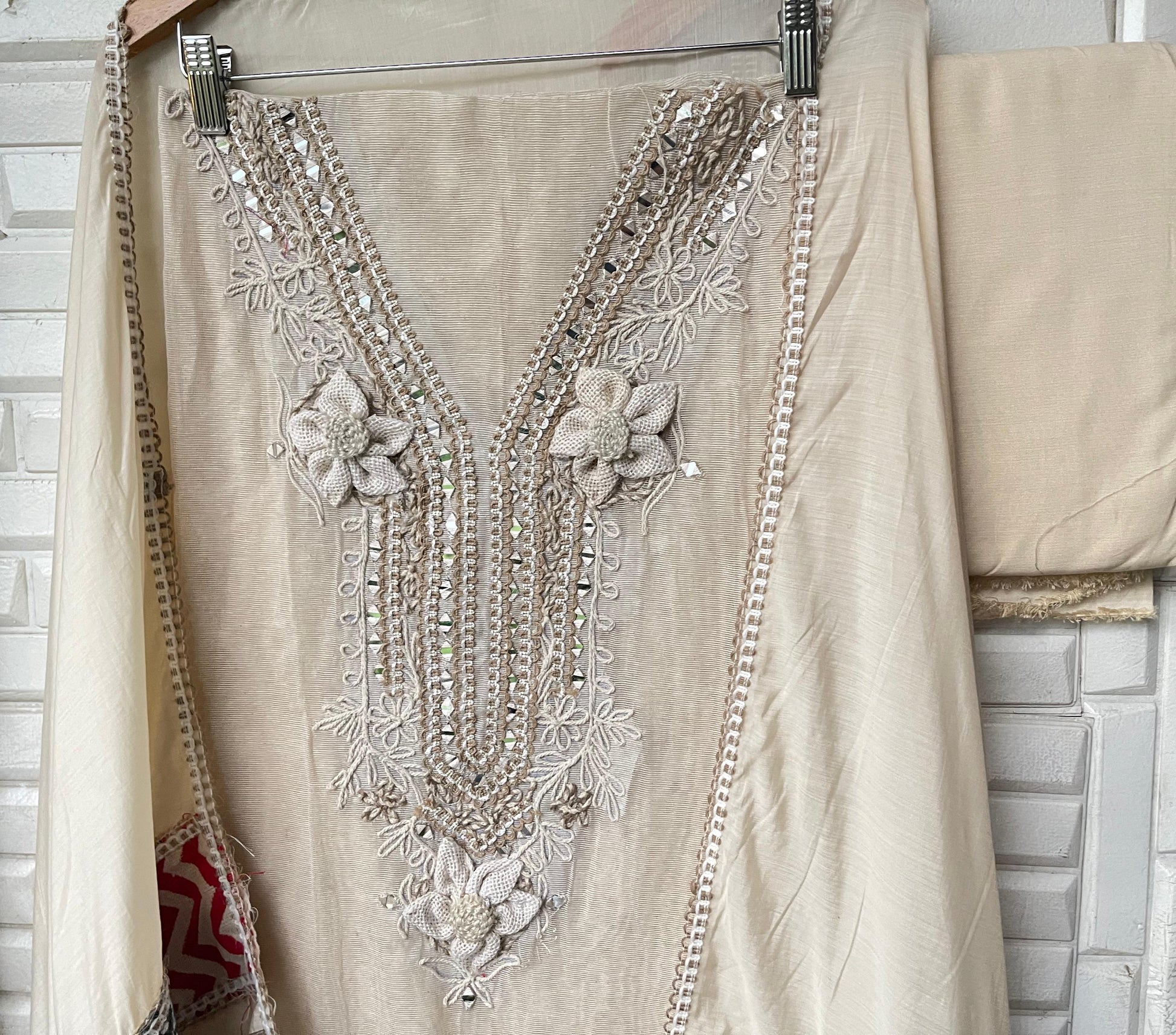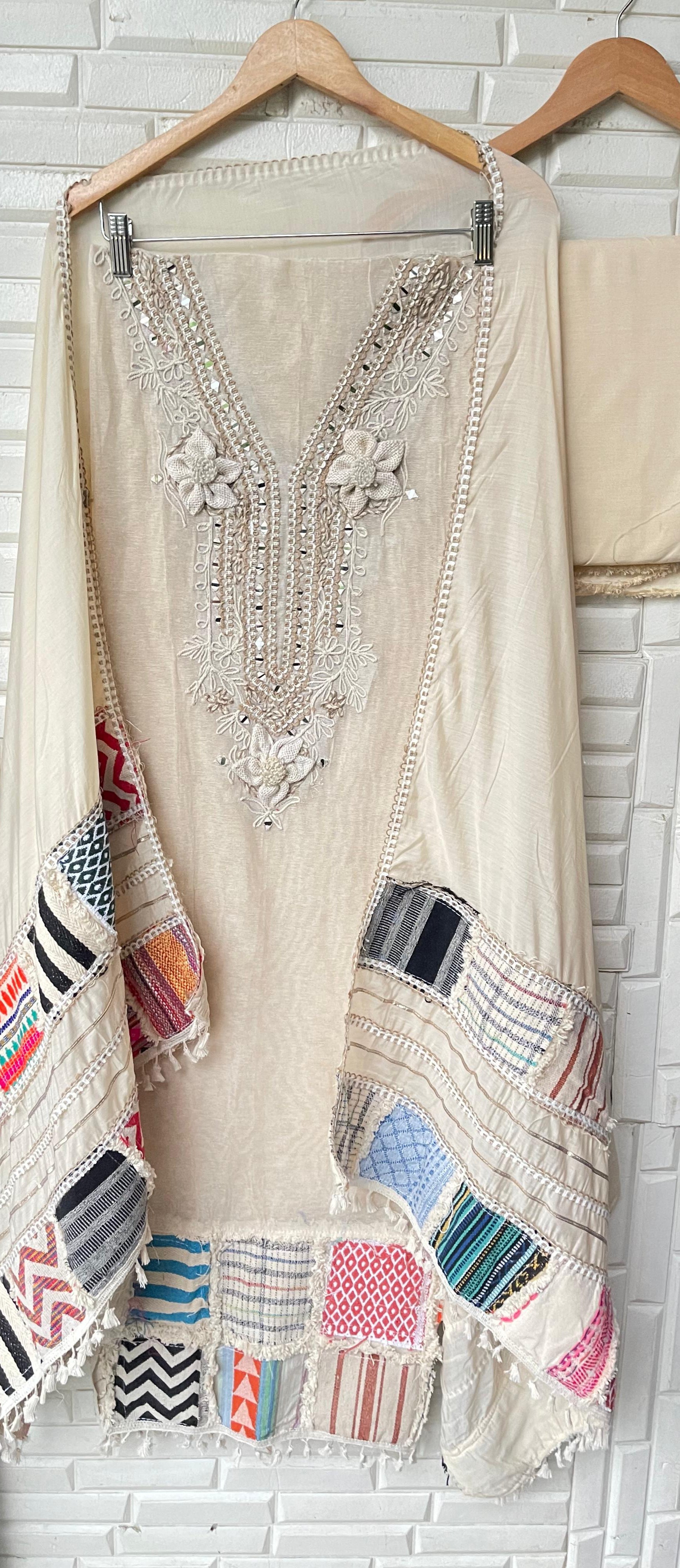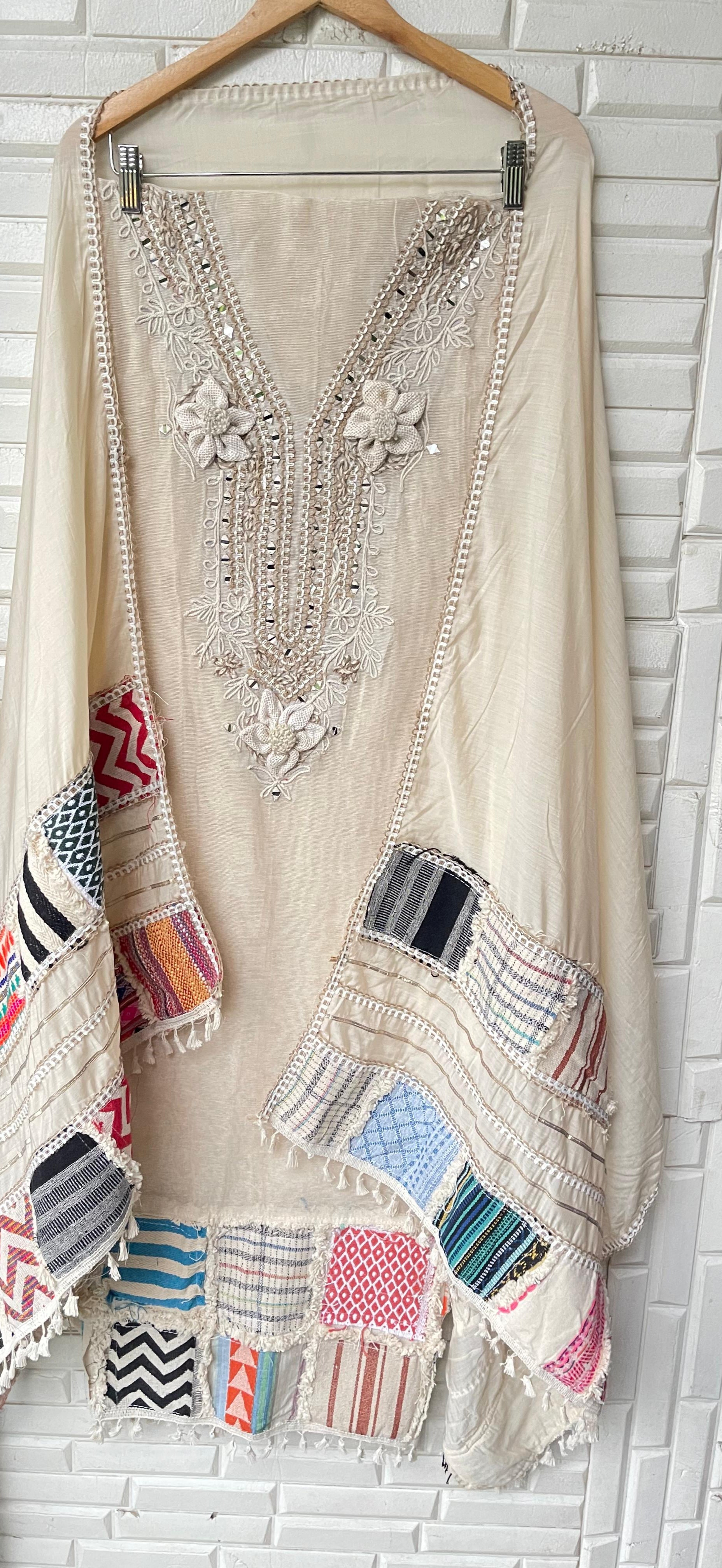 π jute fabric unstitched shirt with box patchwork and resham knots mirror work embroidery and 3D flowers