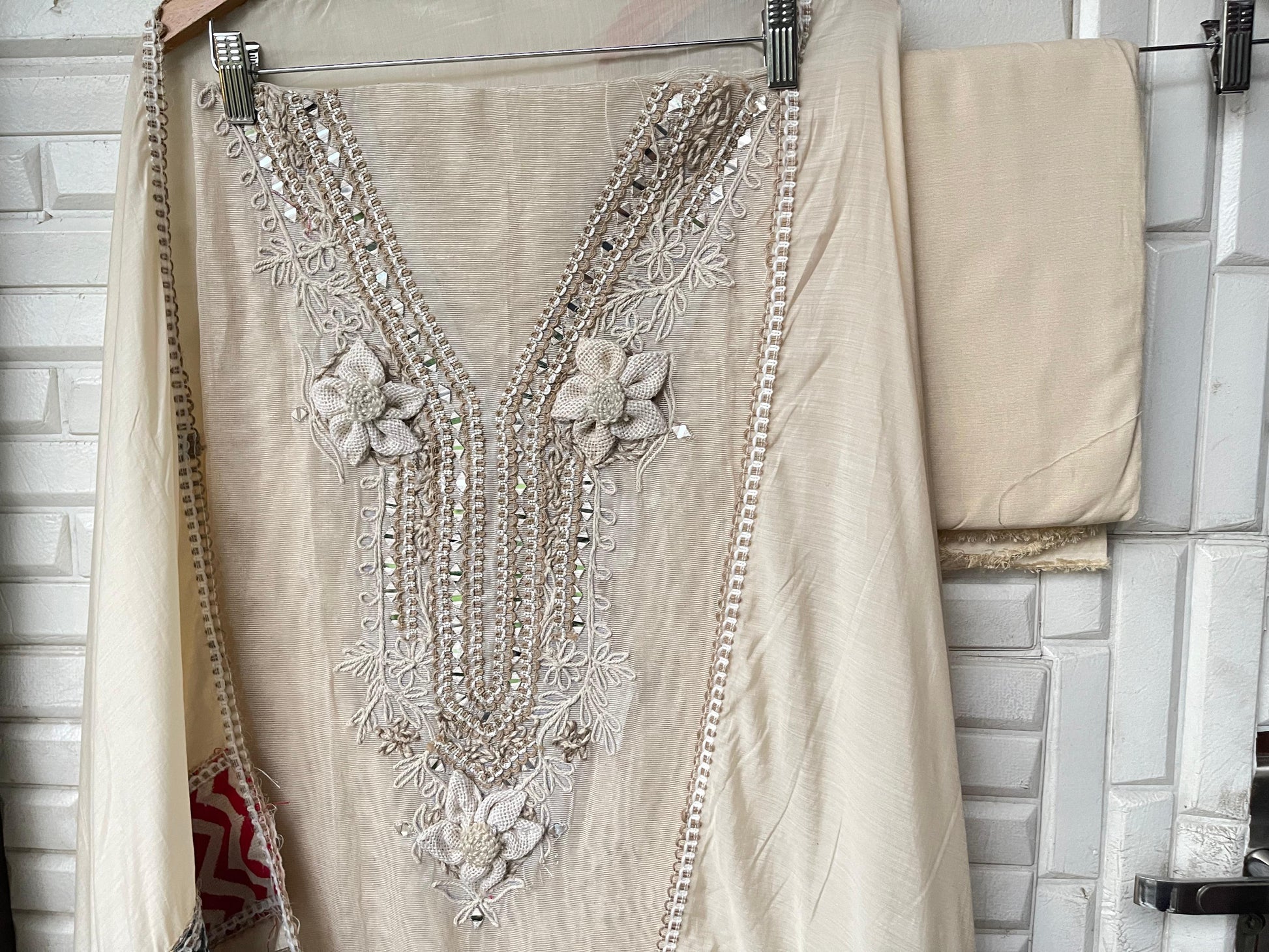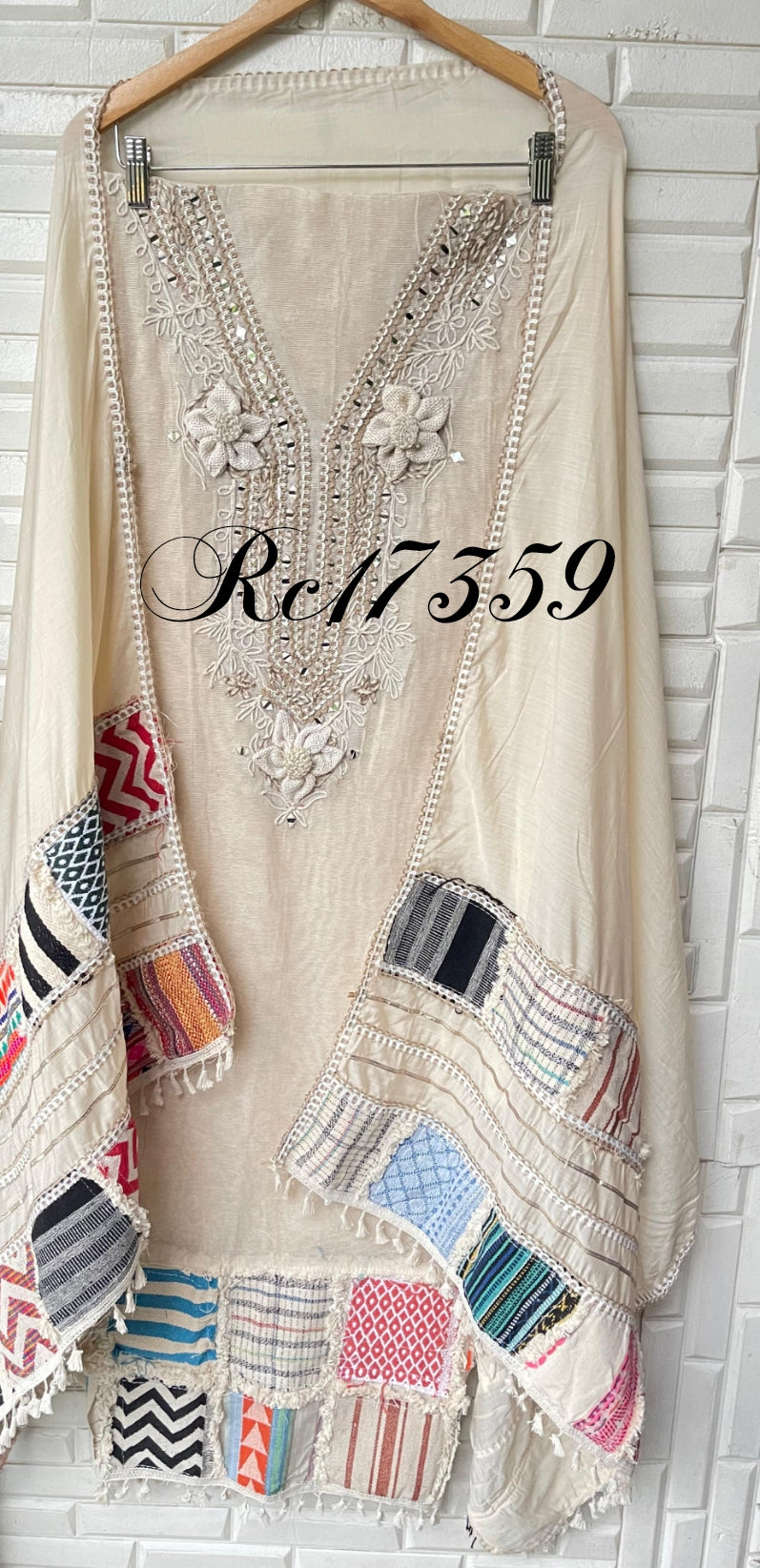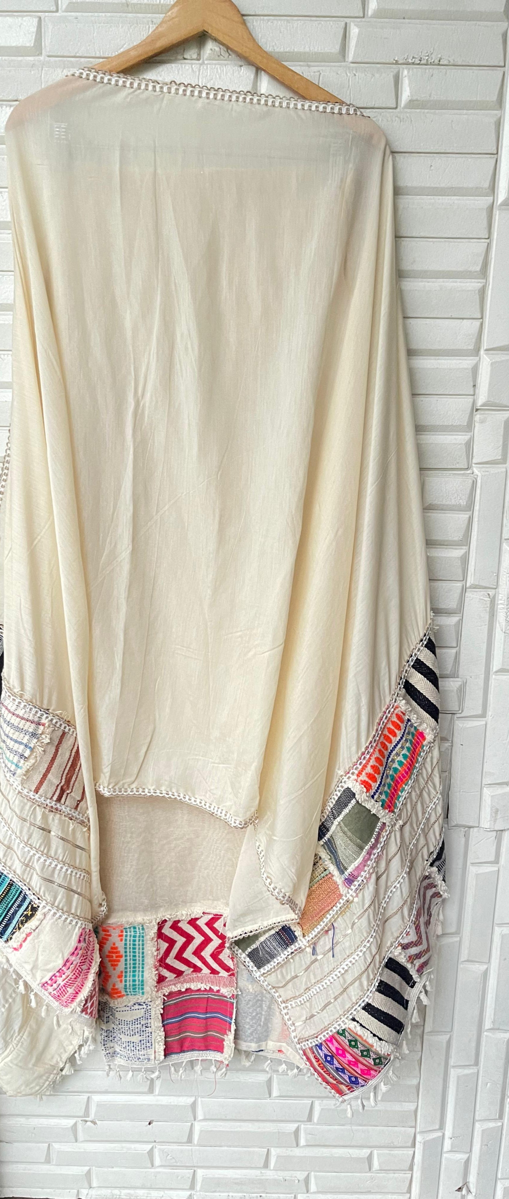 π jute fabric unstitched shirt with box patchwork and resham knots mirror work embroidery and 3D flowers