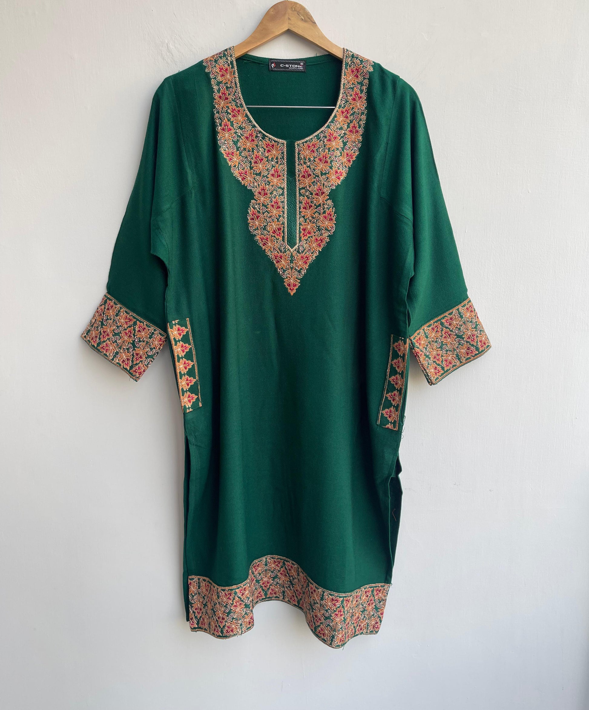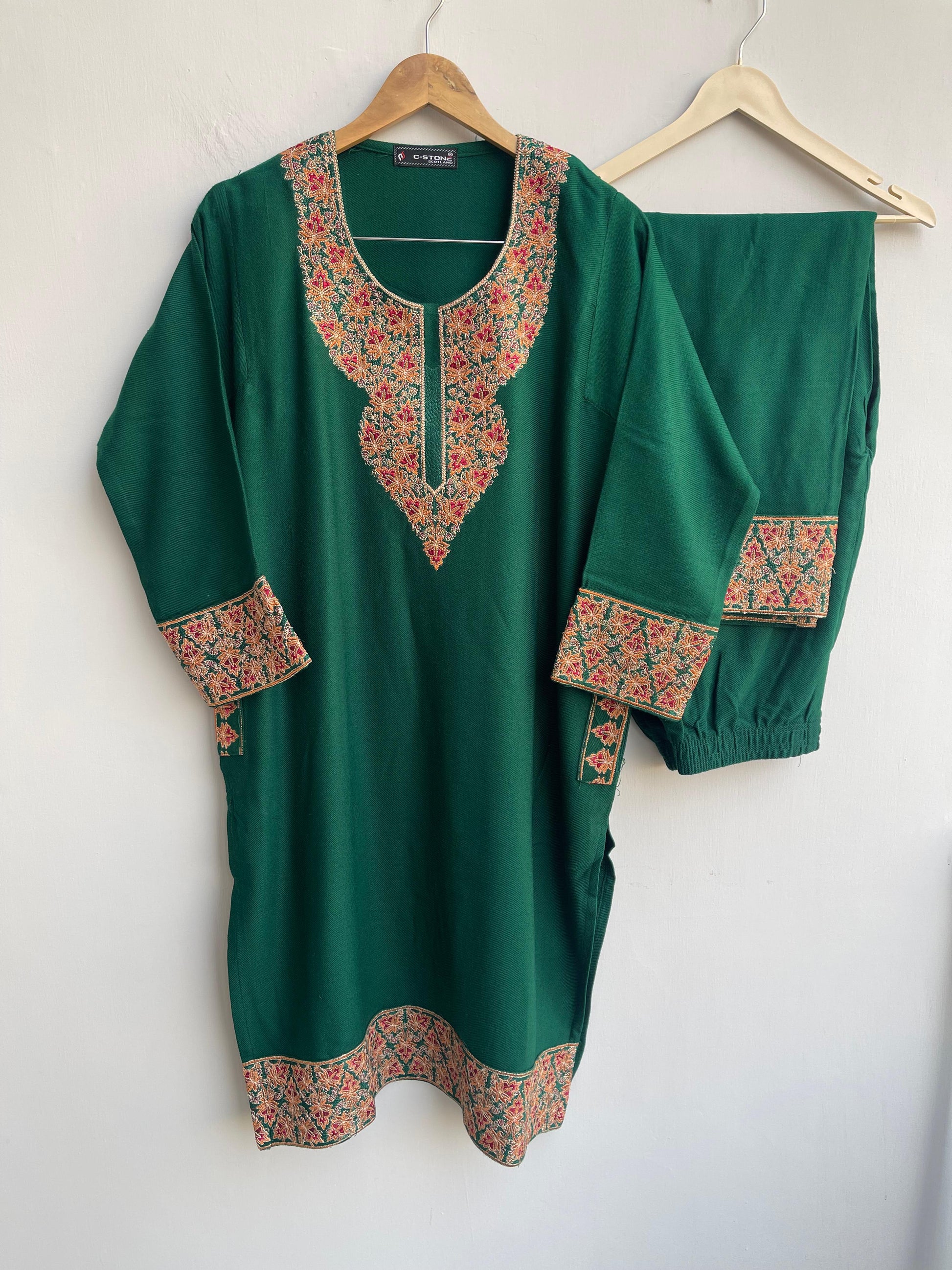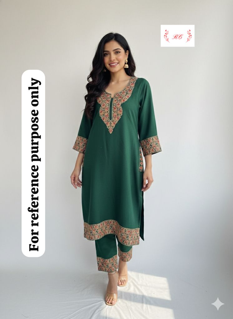Stunning woollen embroidered pheran coord set for winter with resham embroidery