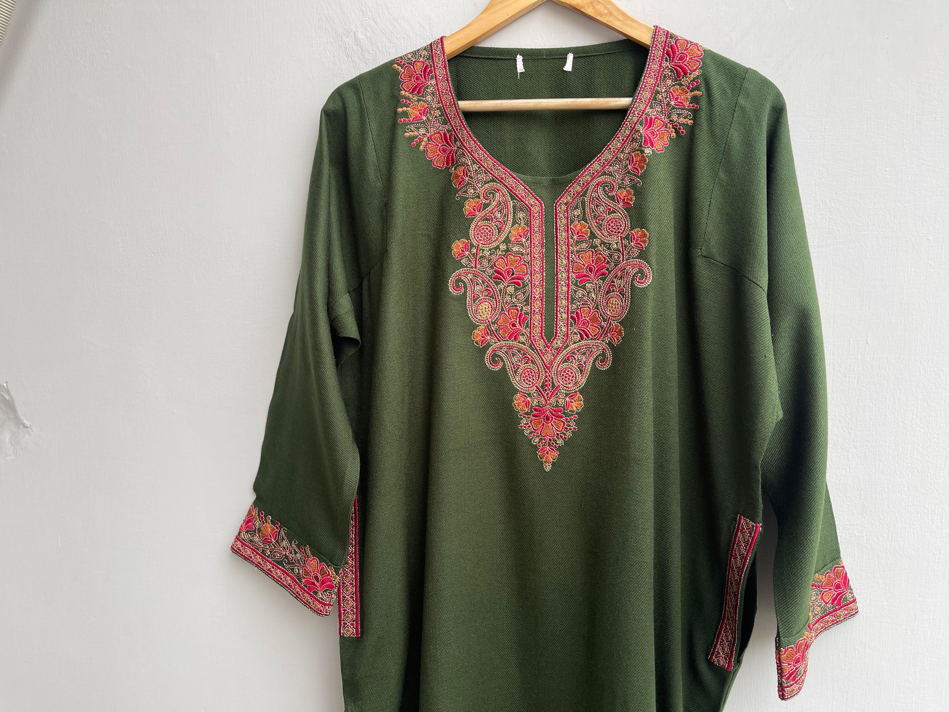 Stunning woollen embroidered pheran coord set for winter with resham embroidery