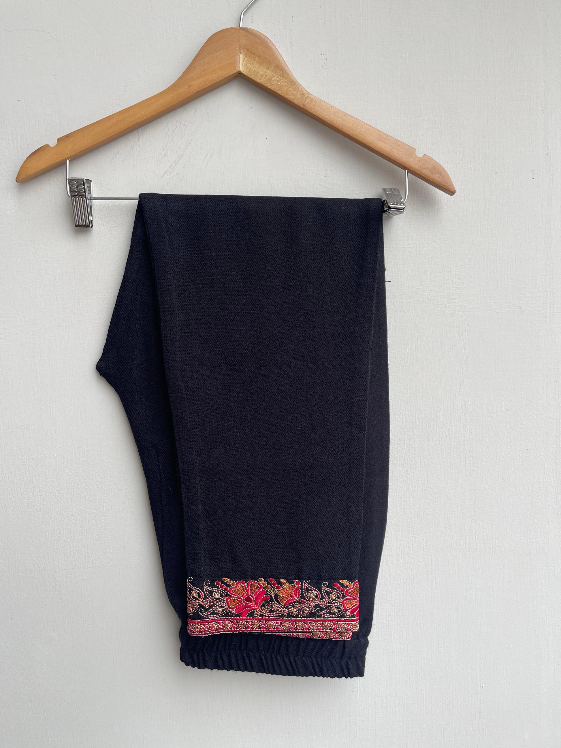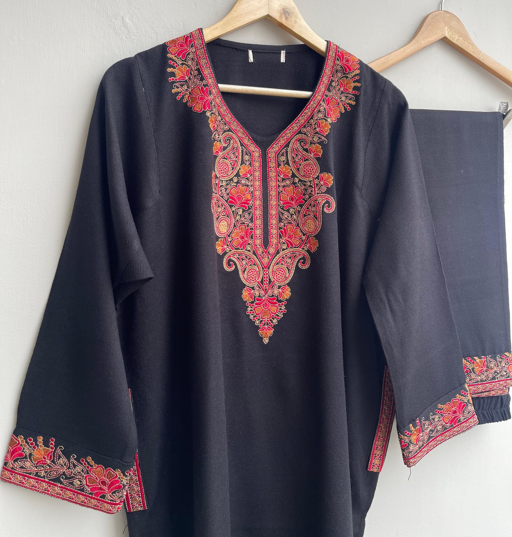 Stunning woollen embroidered pheran coord set for winter with resham embroidery