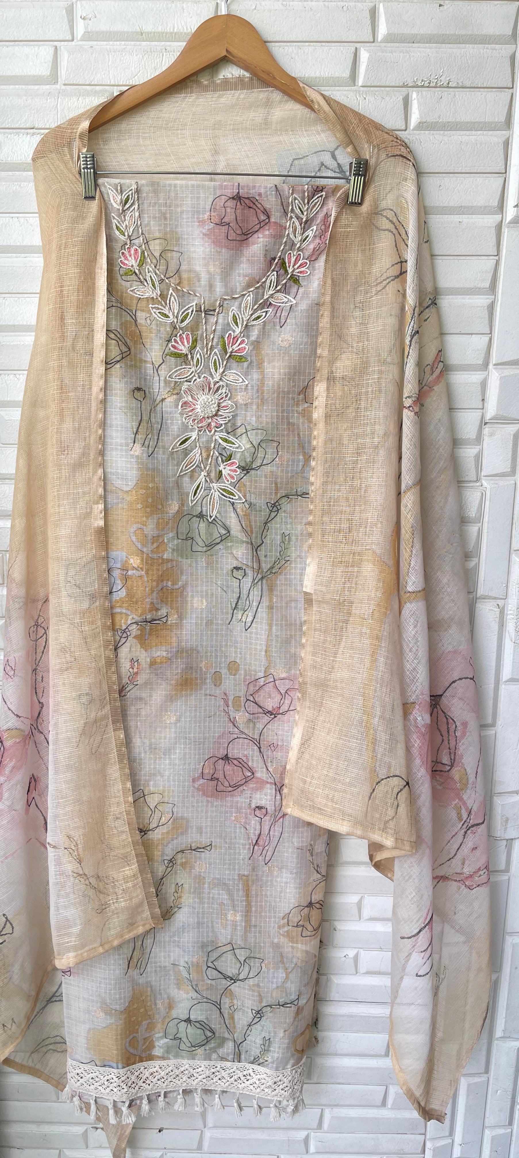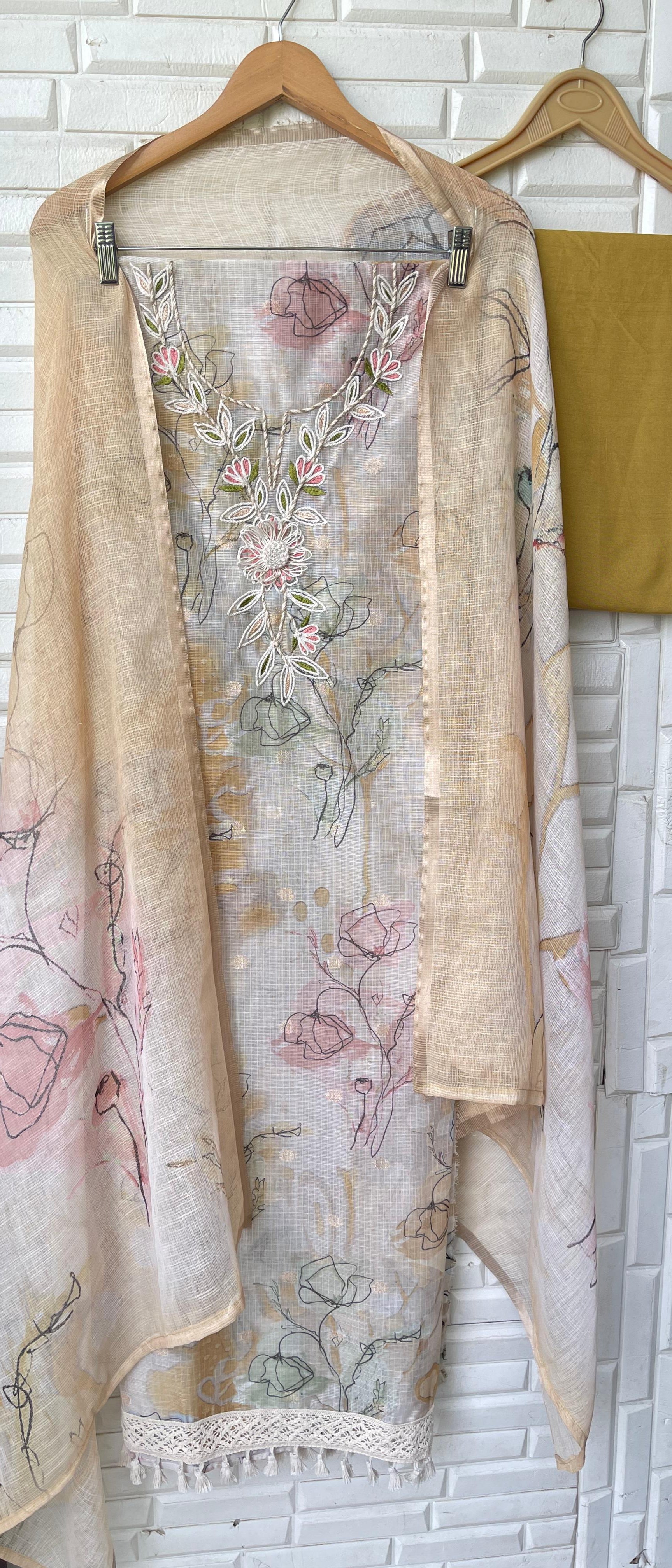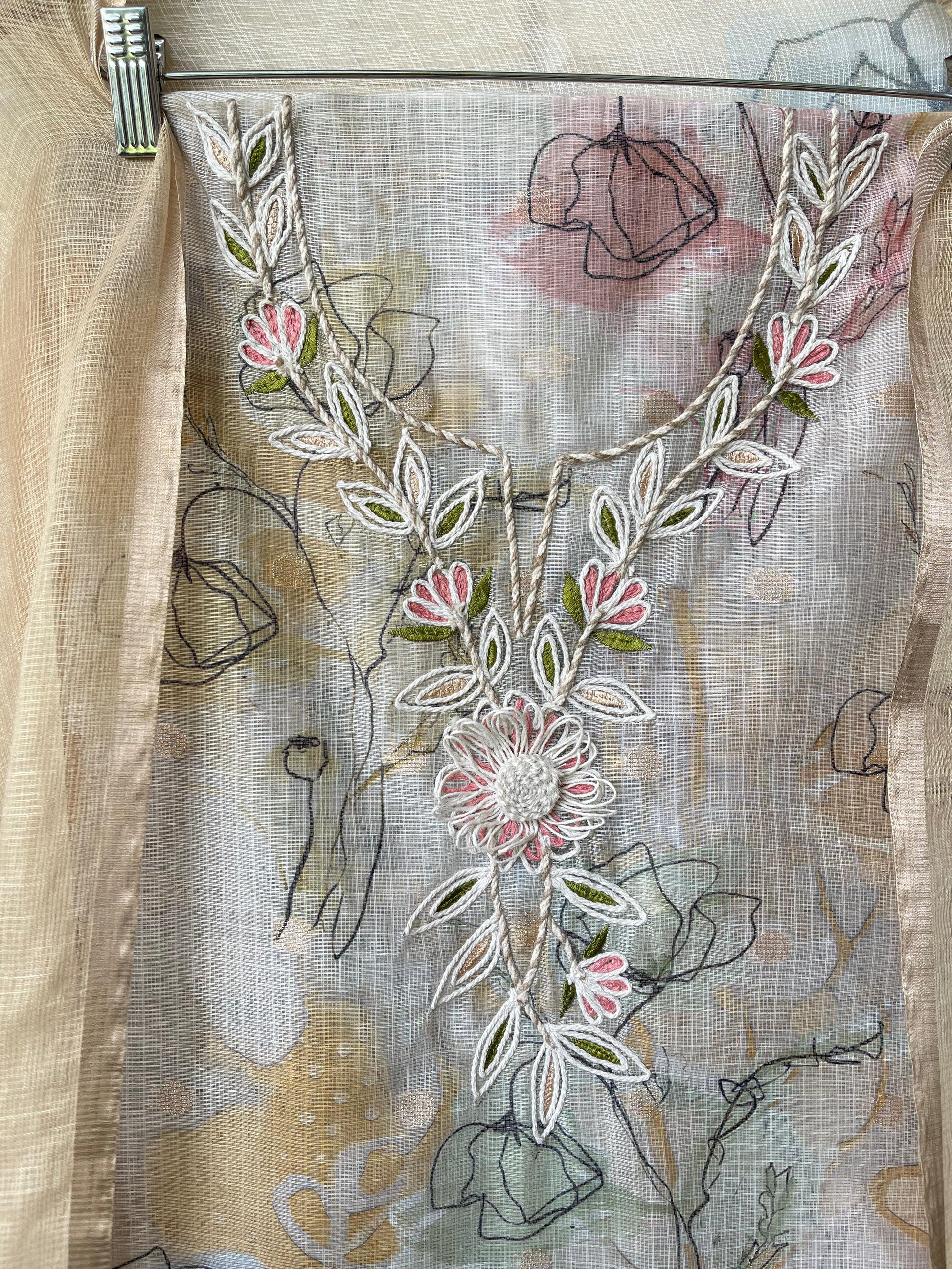 😊 Banarsi kota doriya brush painted fabric unstitched shirt with jute resham knots embroidery, 3D flowers and crotia ghera pom pom lace