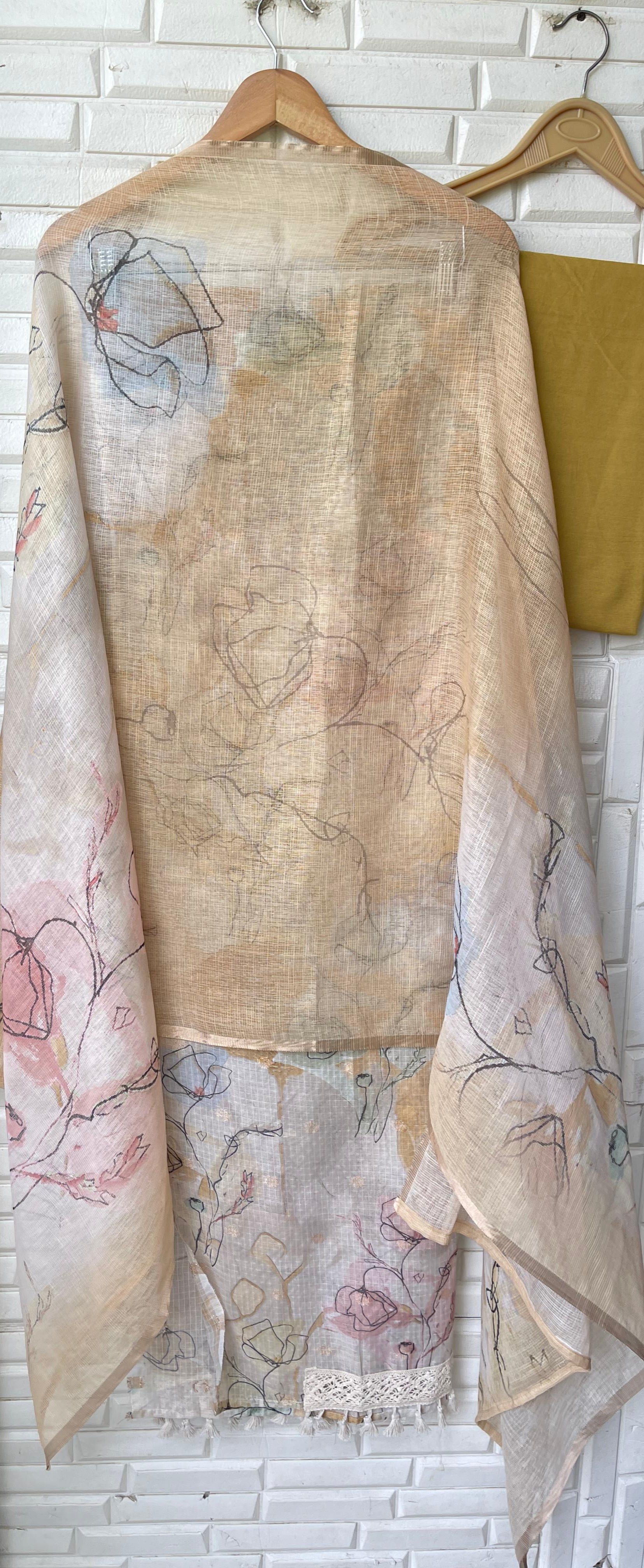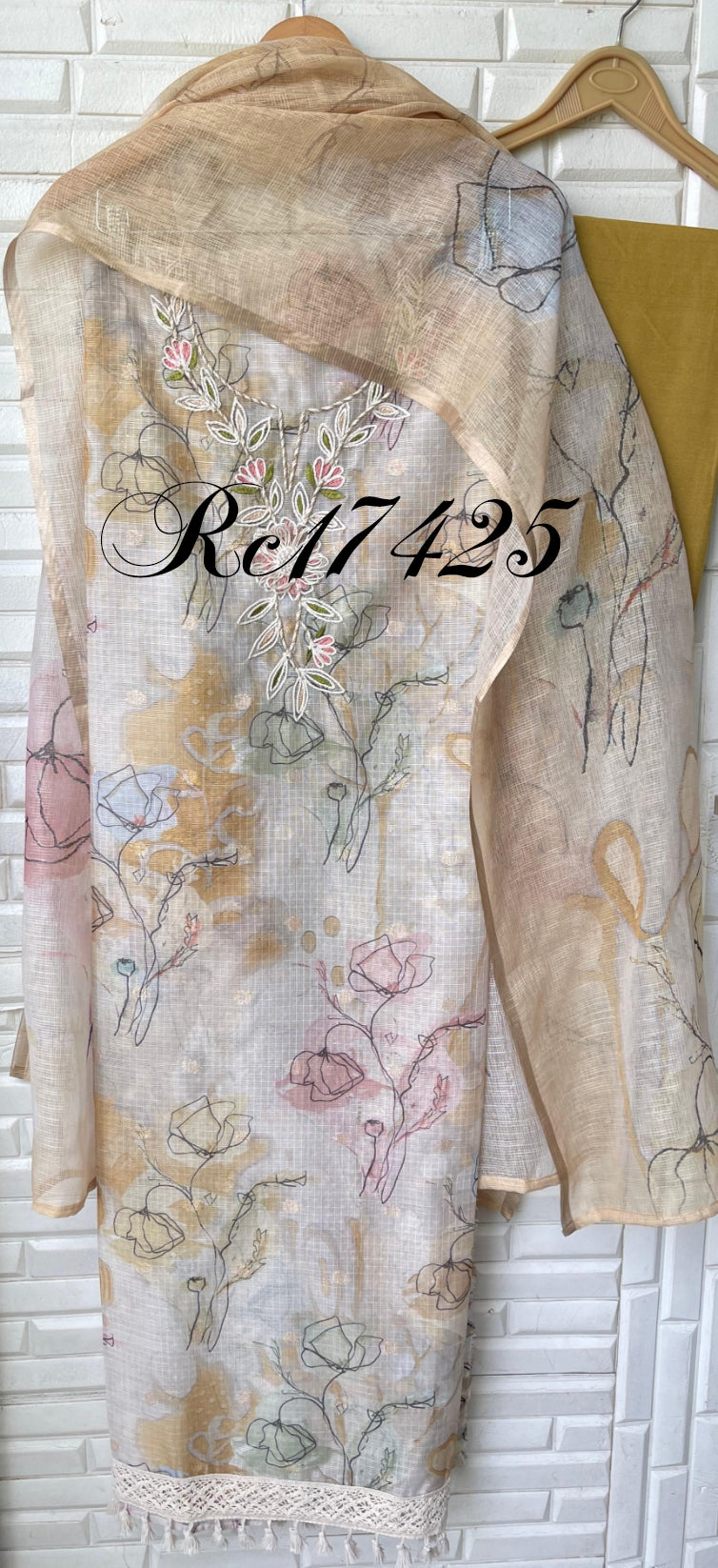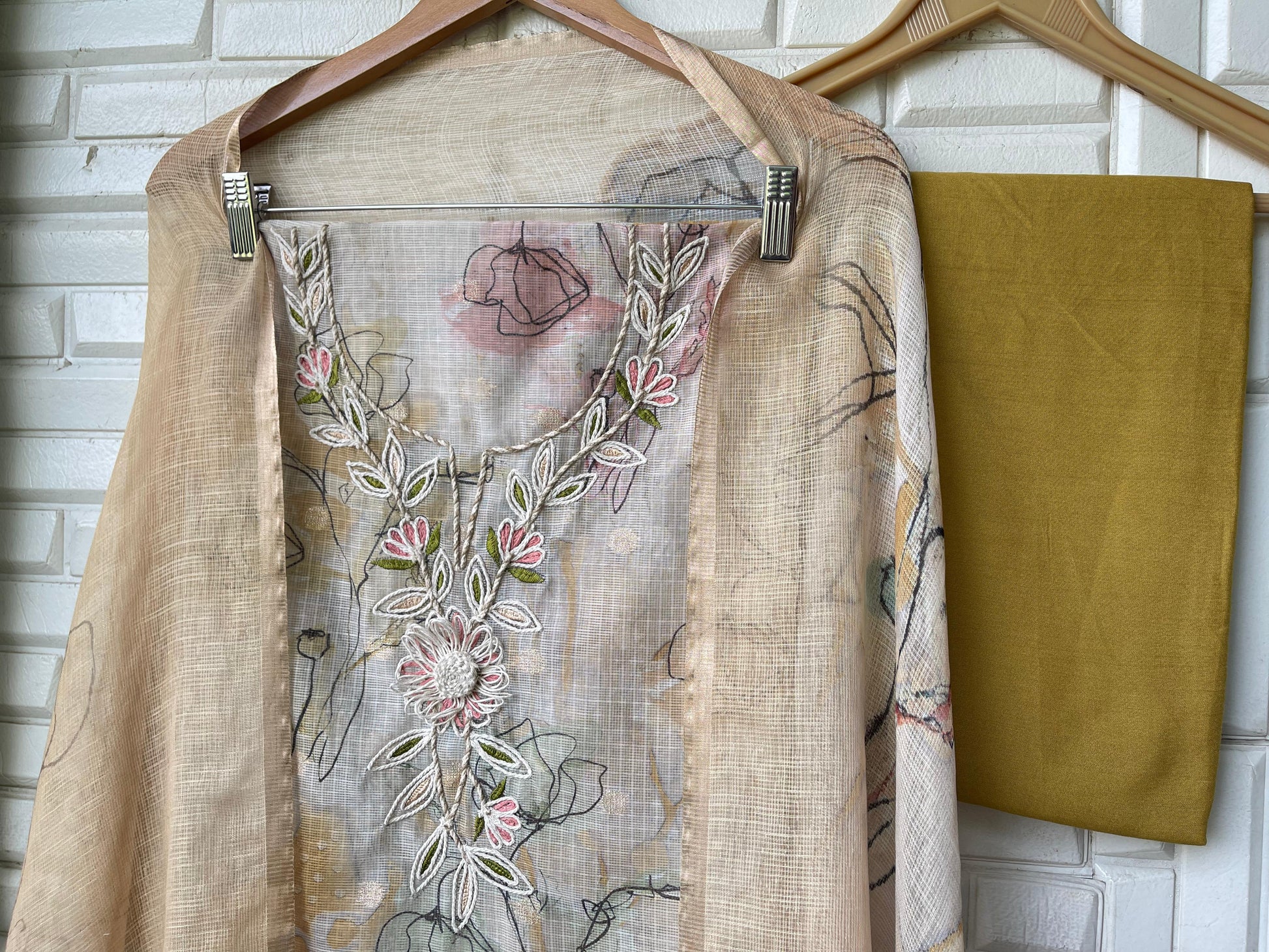 😊 Banarsi kota doriya brush painted fabric unstitched shirt with jute resham knots embroidery, 3D flowers and crotia ghera pom pom lace