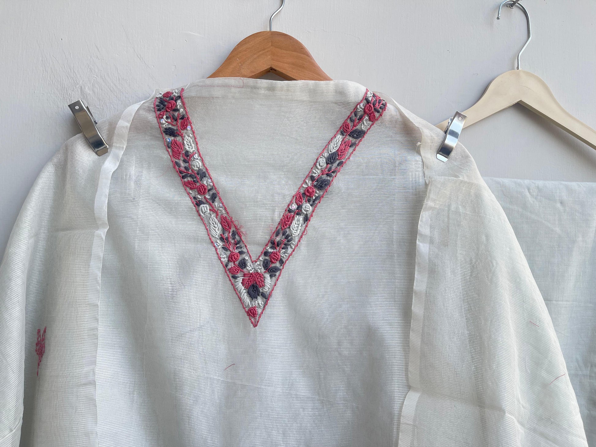π kota doriya fabric unstitched shirt with brush paint plus resham sequence embroidery and crotia ghera lace