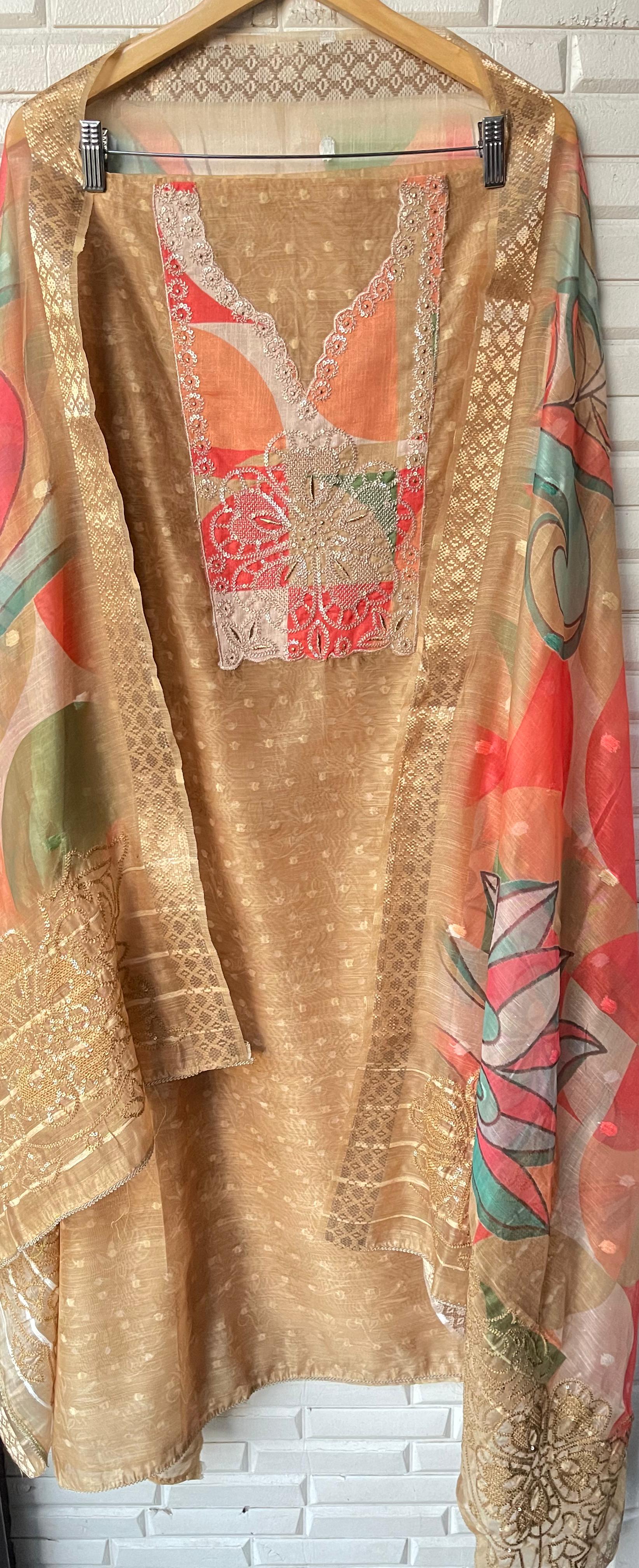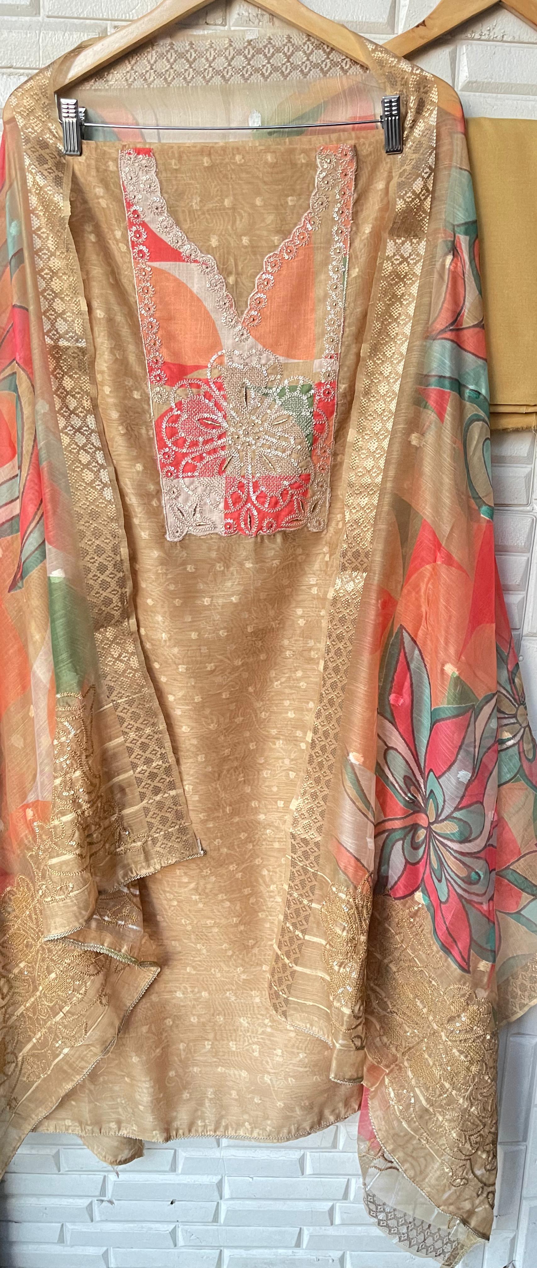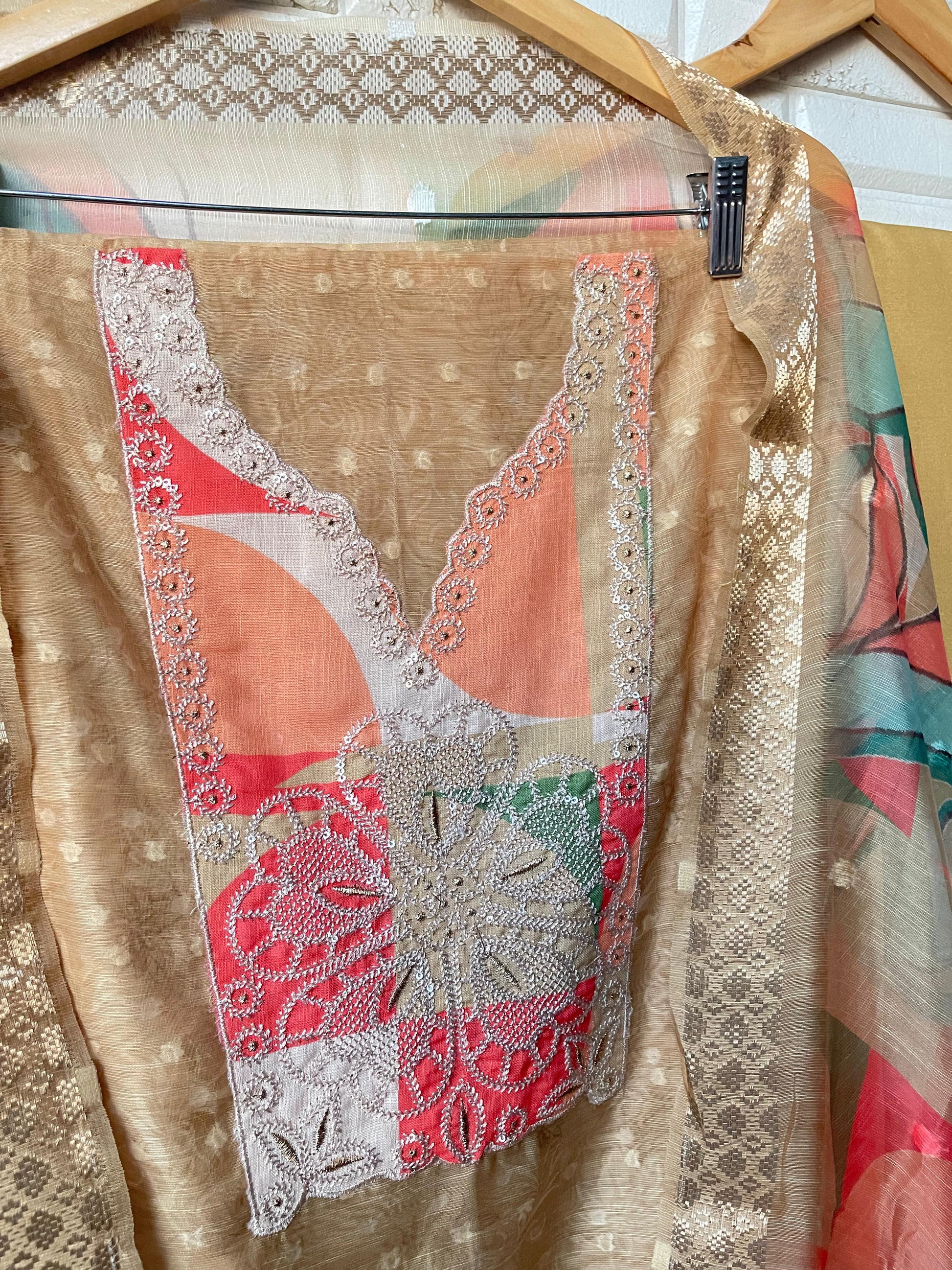 😊 self linen Chanderi printed fabric unstitched shirt with zari sequence resham embroidery