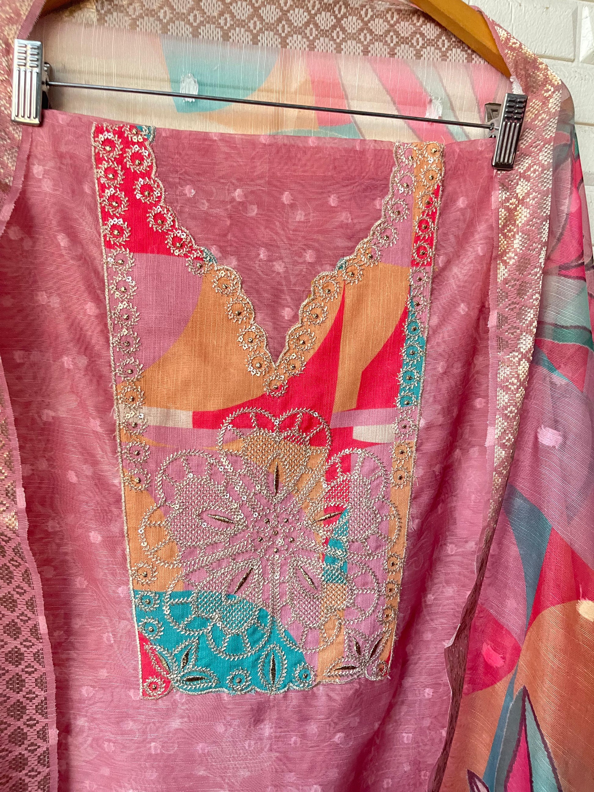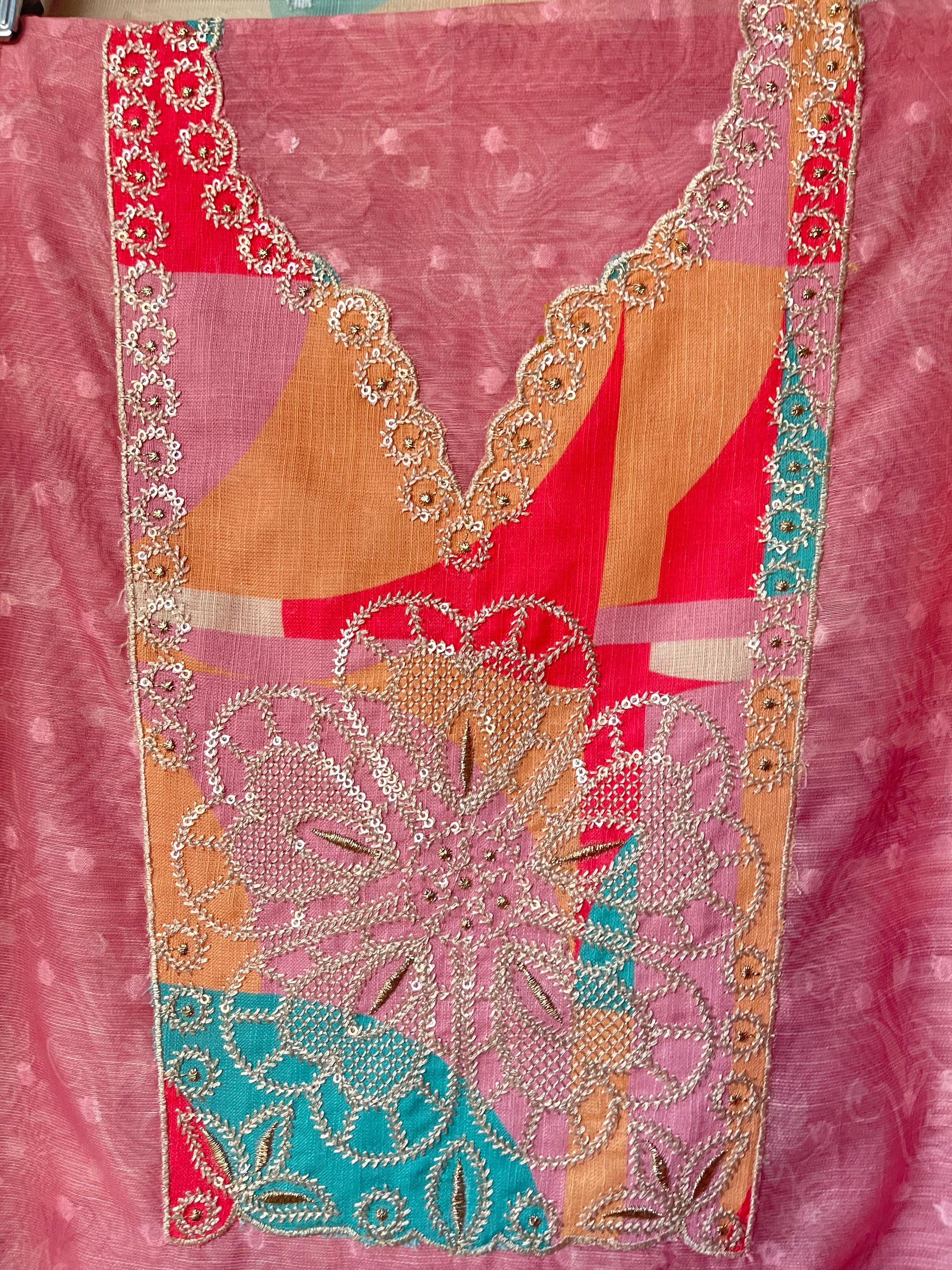 😊 self linen Chanderi printed fabric unstitched shirt with zari sequence resham embroidery
