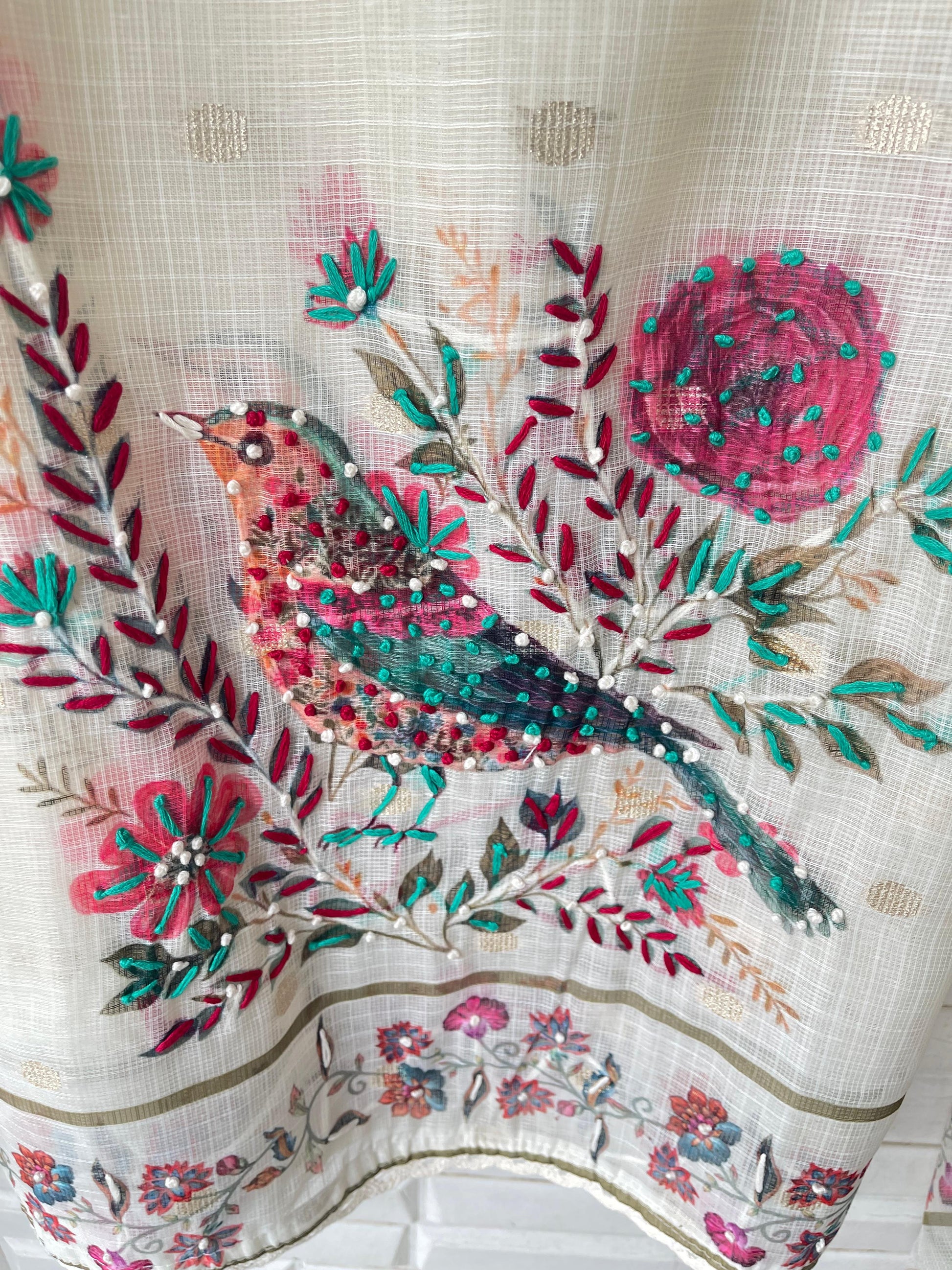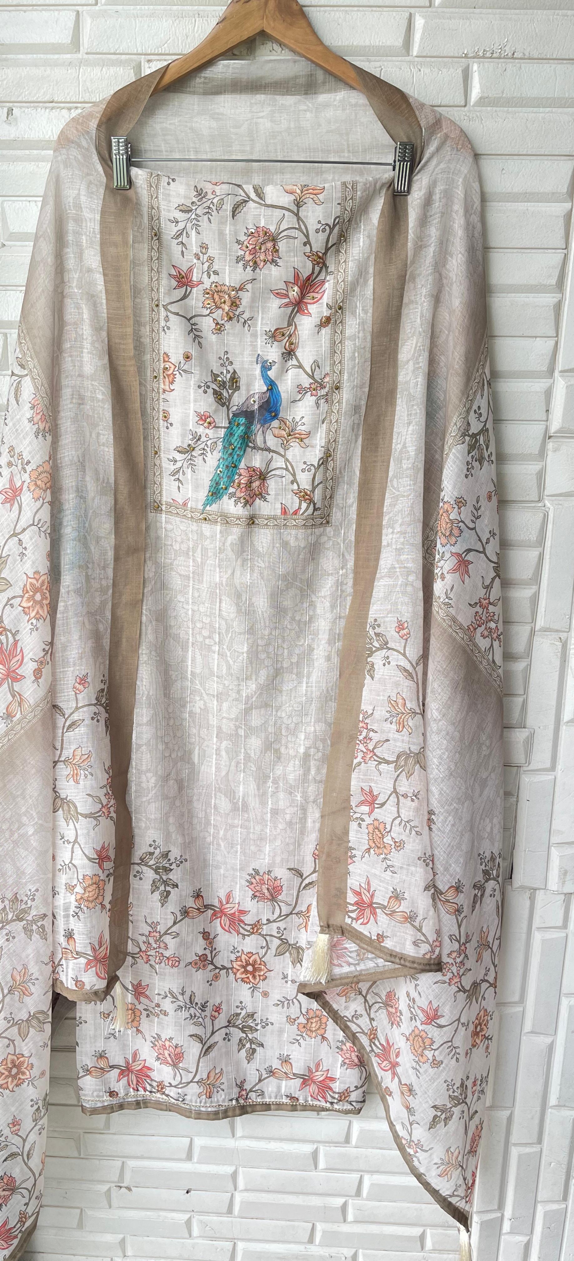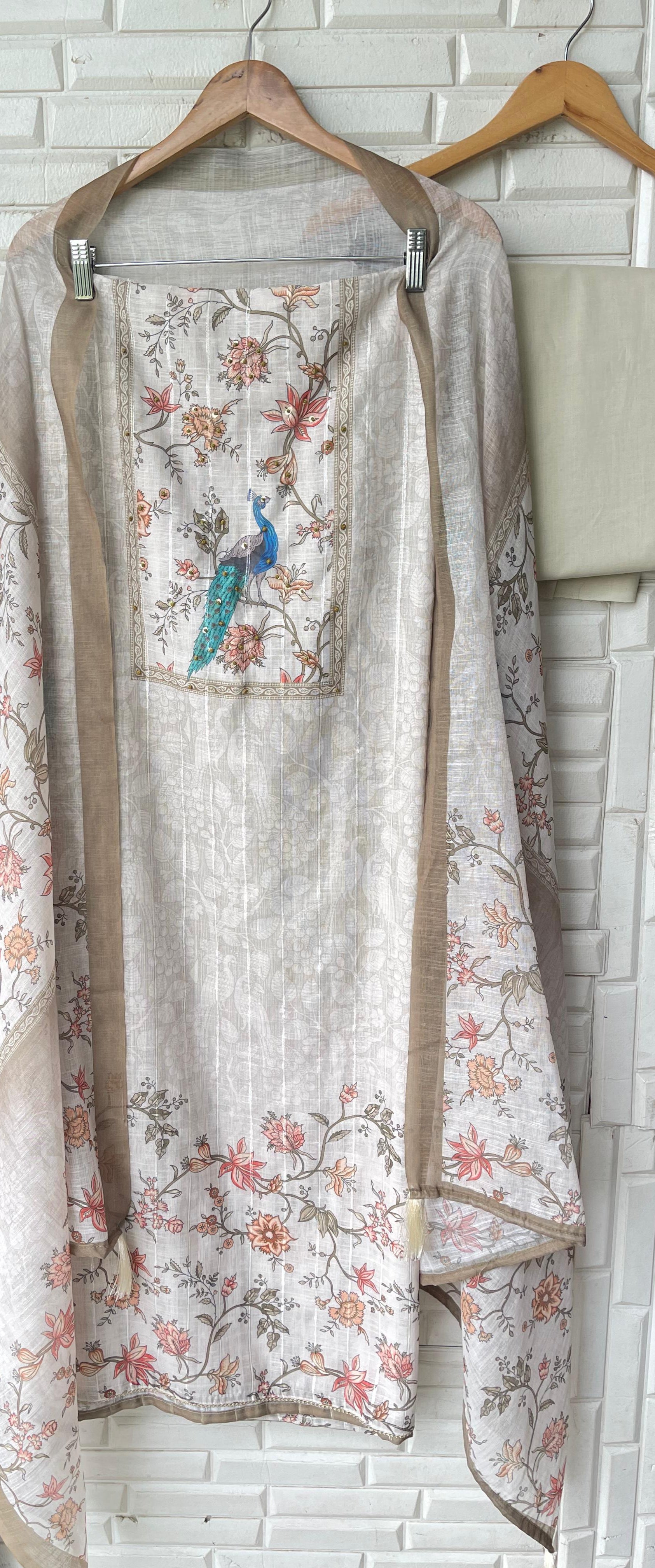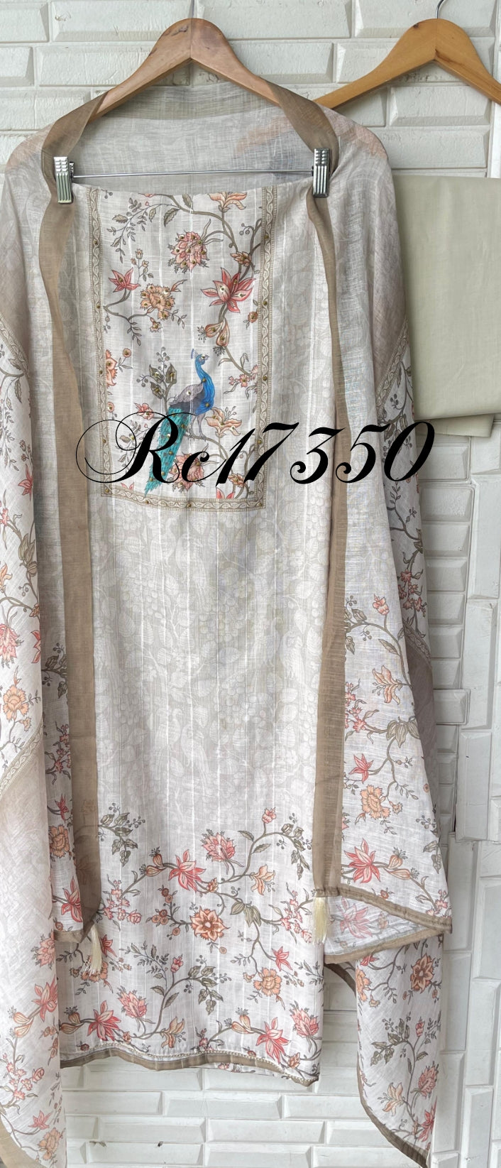 π soft linen cotton printed fabric unstitched shirt with sequence resham knots embroidery and zari weaving