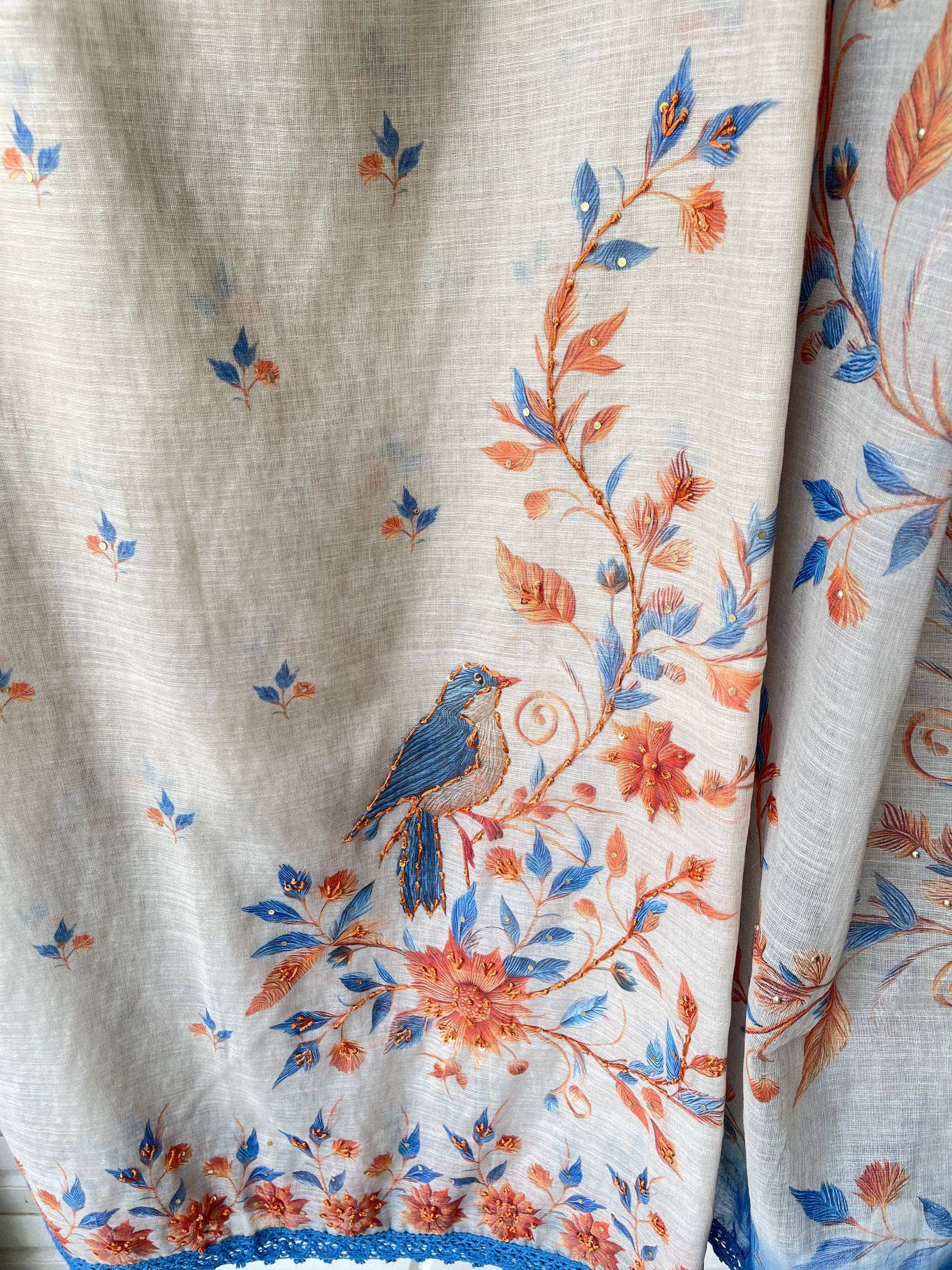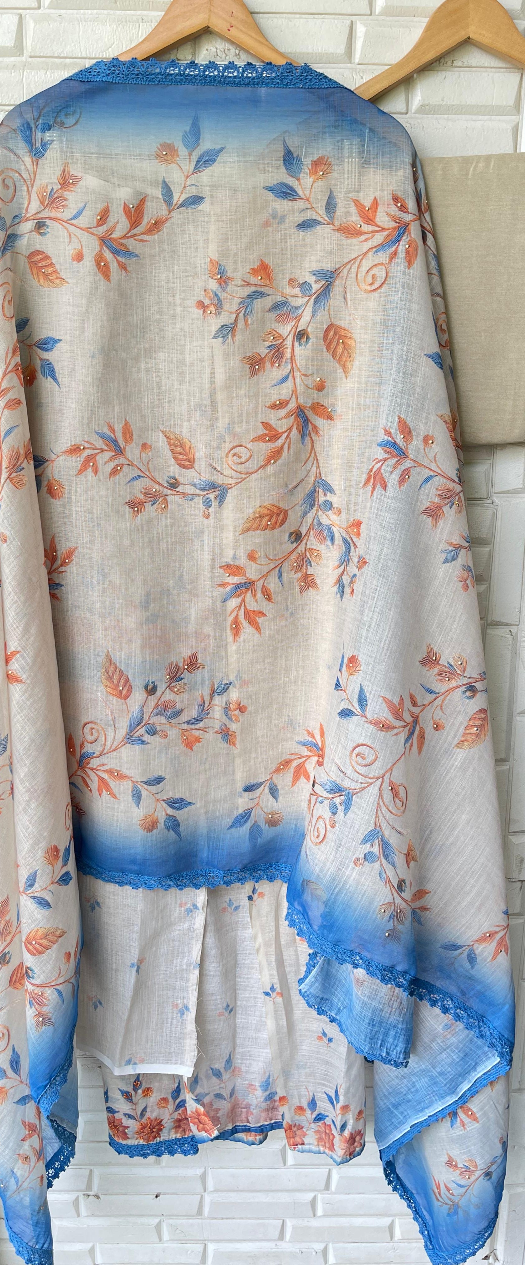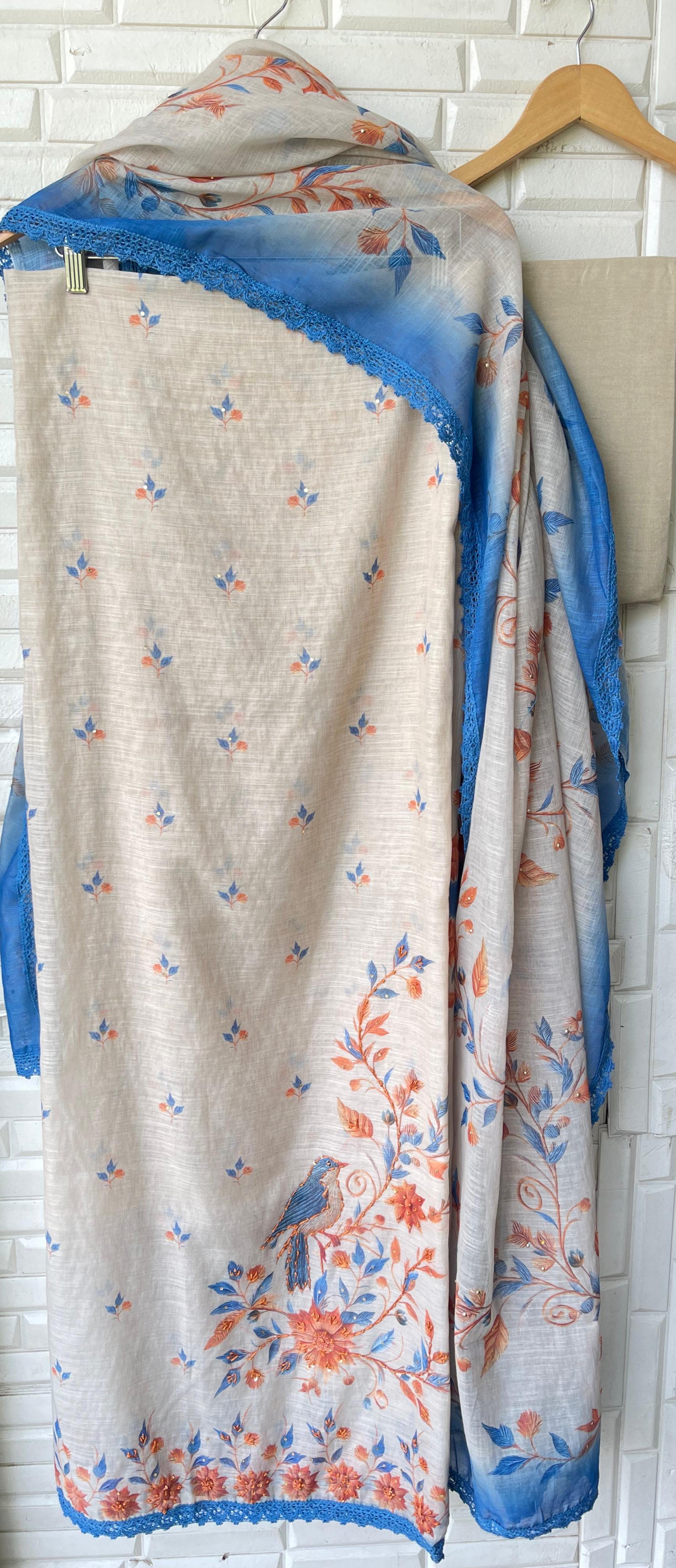 😊 soft linen cotton printed fabric unstitched shirt with resham knots sequence embroidery and crotia ghera lace