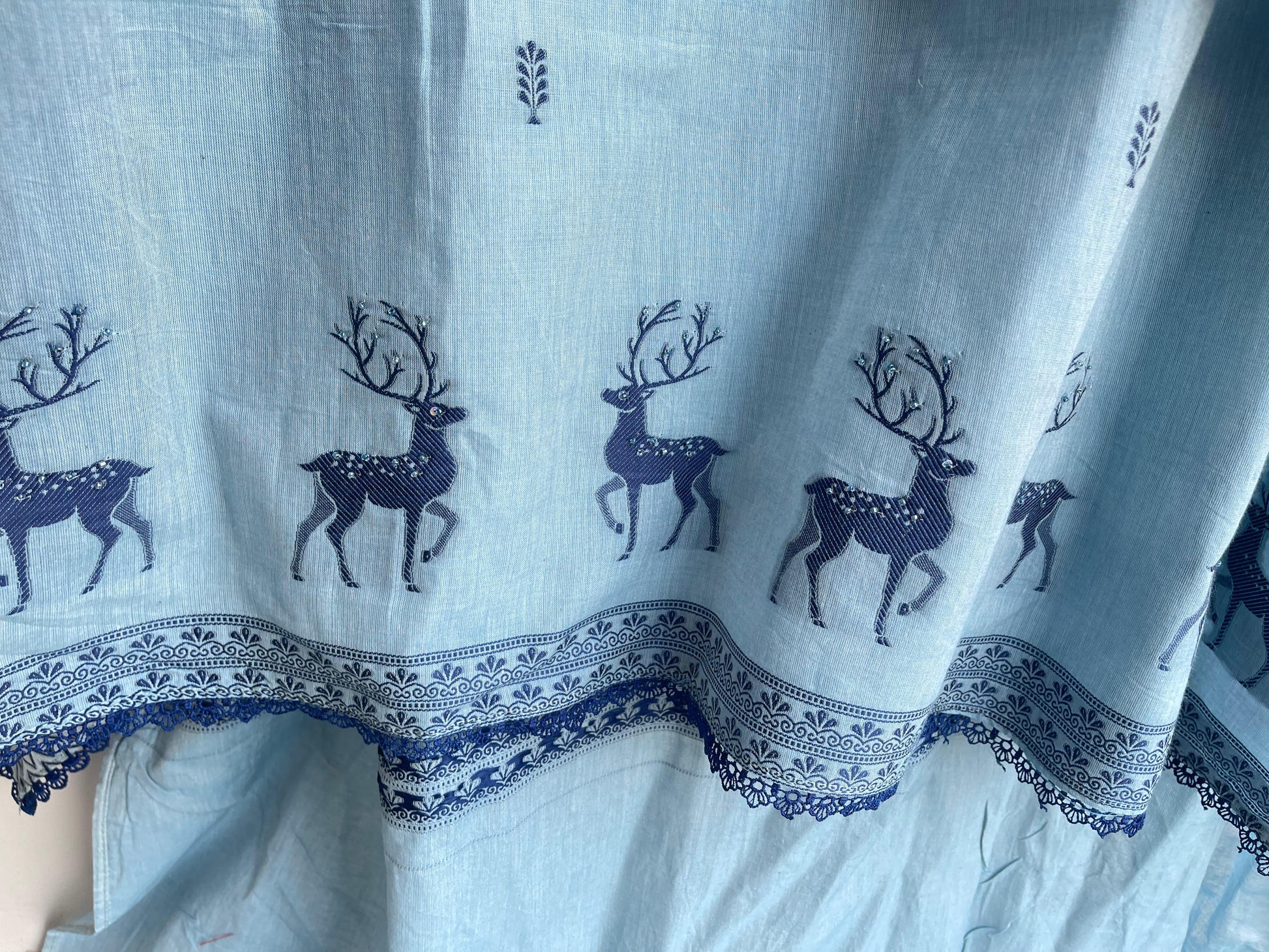 ๐linen fabric unstitched shirt with pearl sequence beads embroidery and crotia ghera lace plus weaving all over