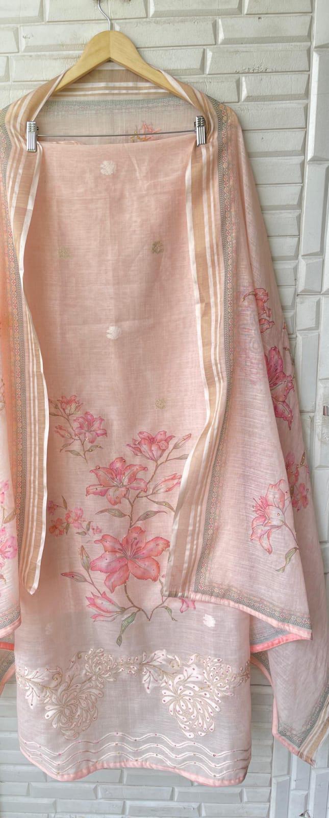 π banarsi linen Kora self cotton printed fabric un stitched shirt with sequence beads embroidery