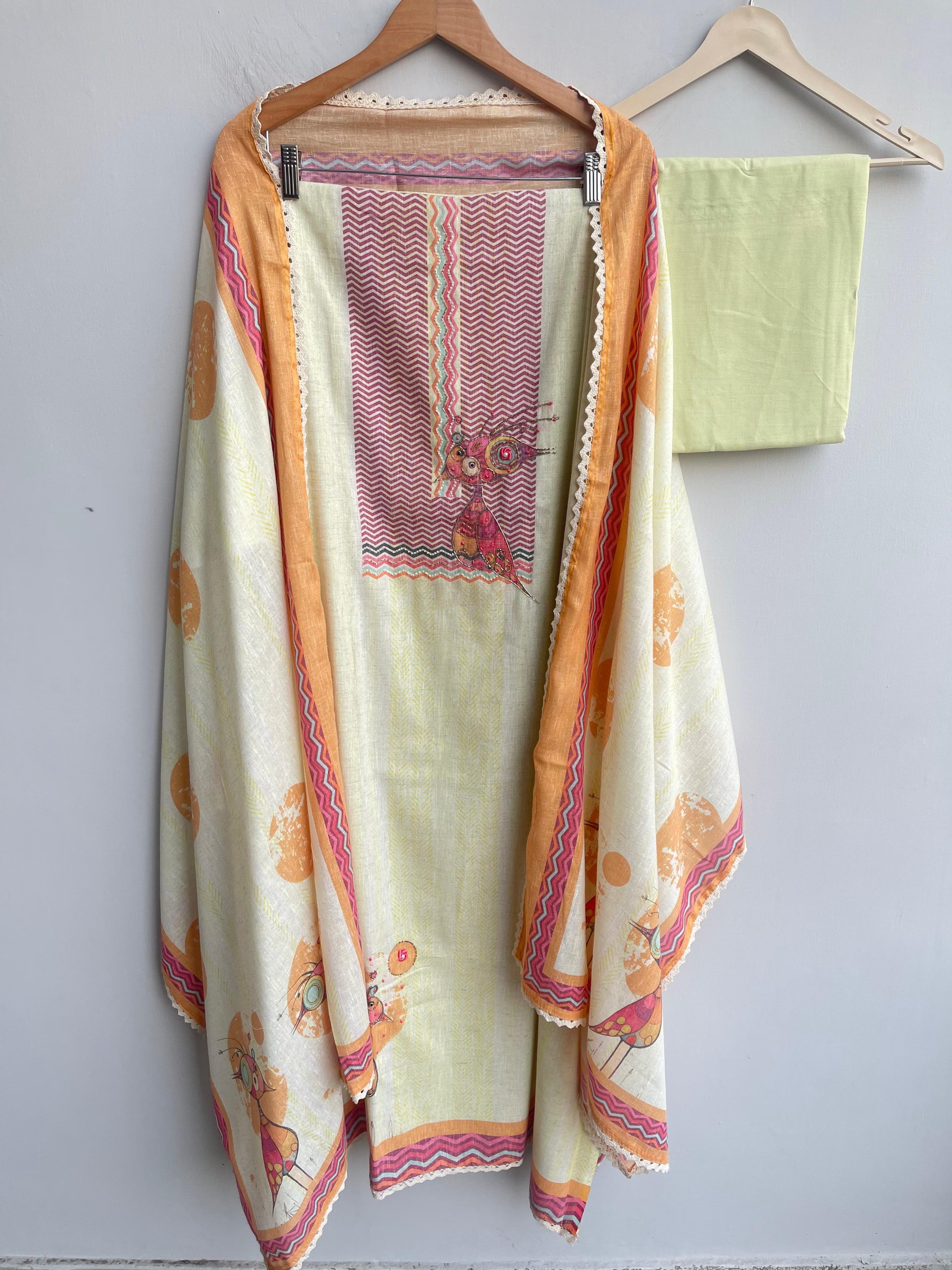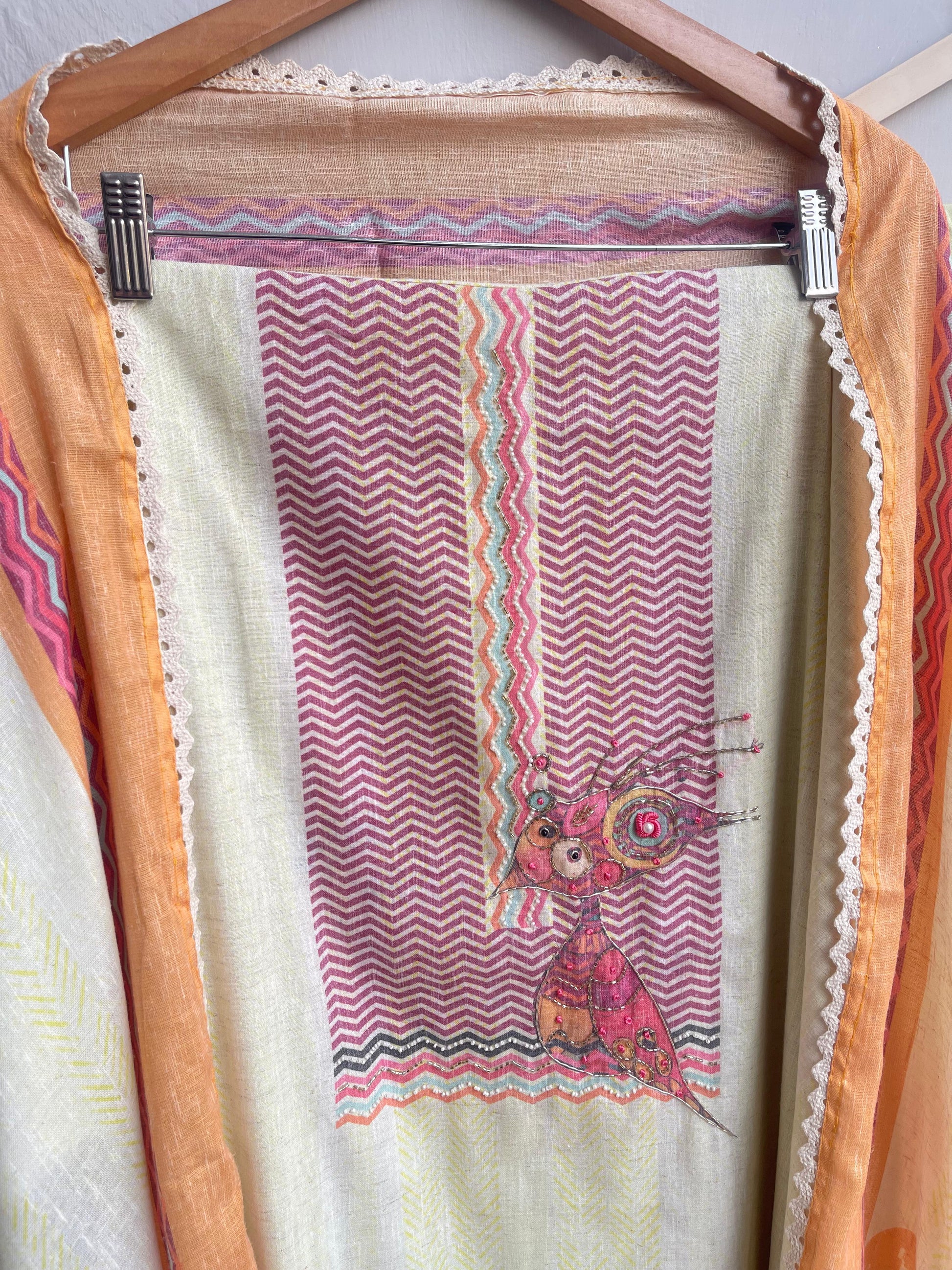 π linen printed fabric unstitched shirt with kutdanna resham Dabka knots Moti