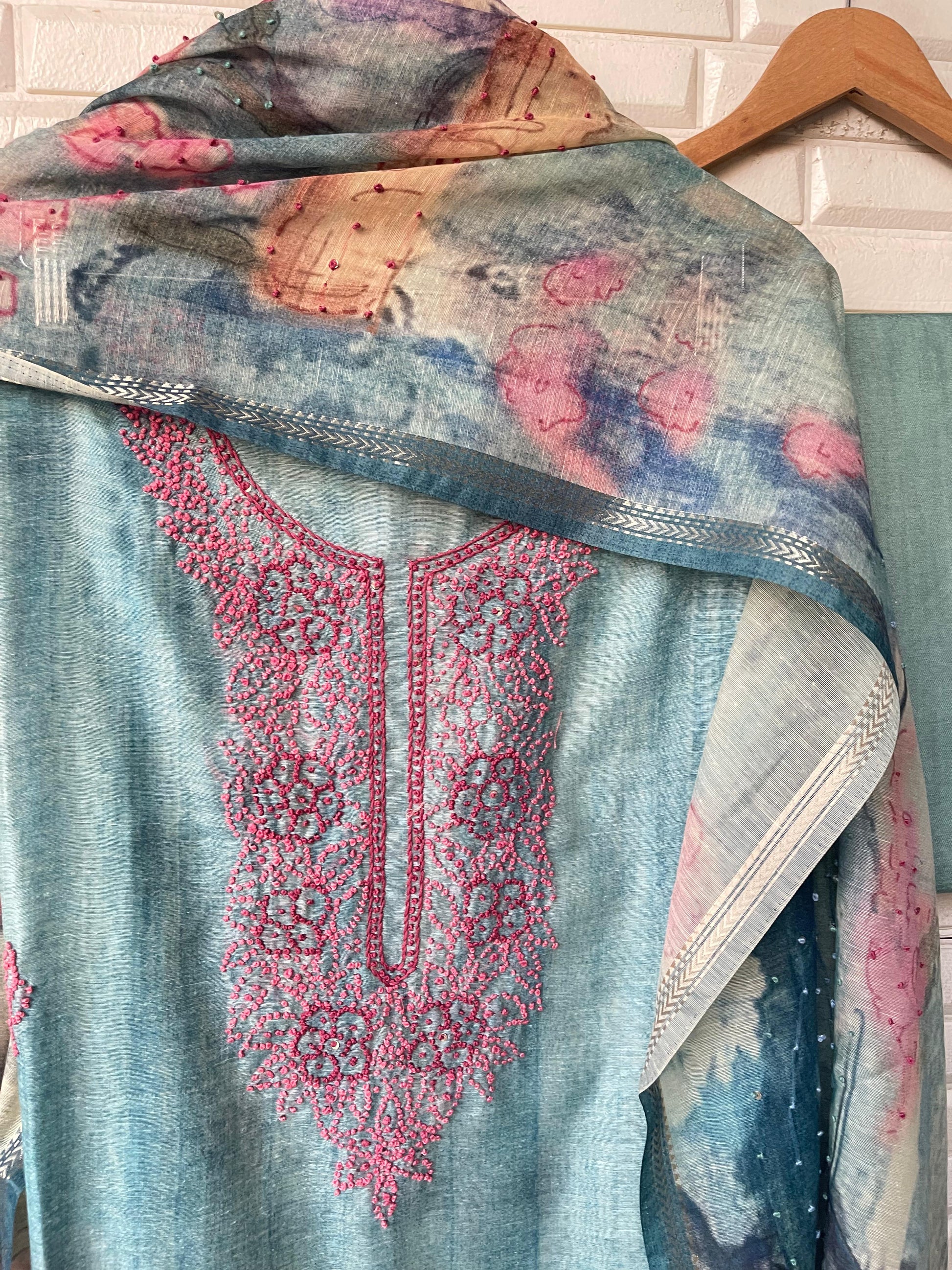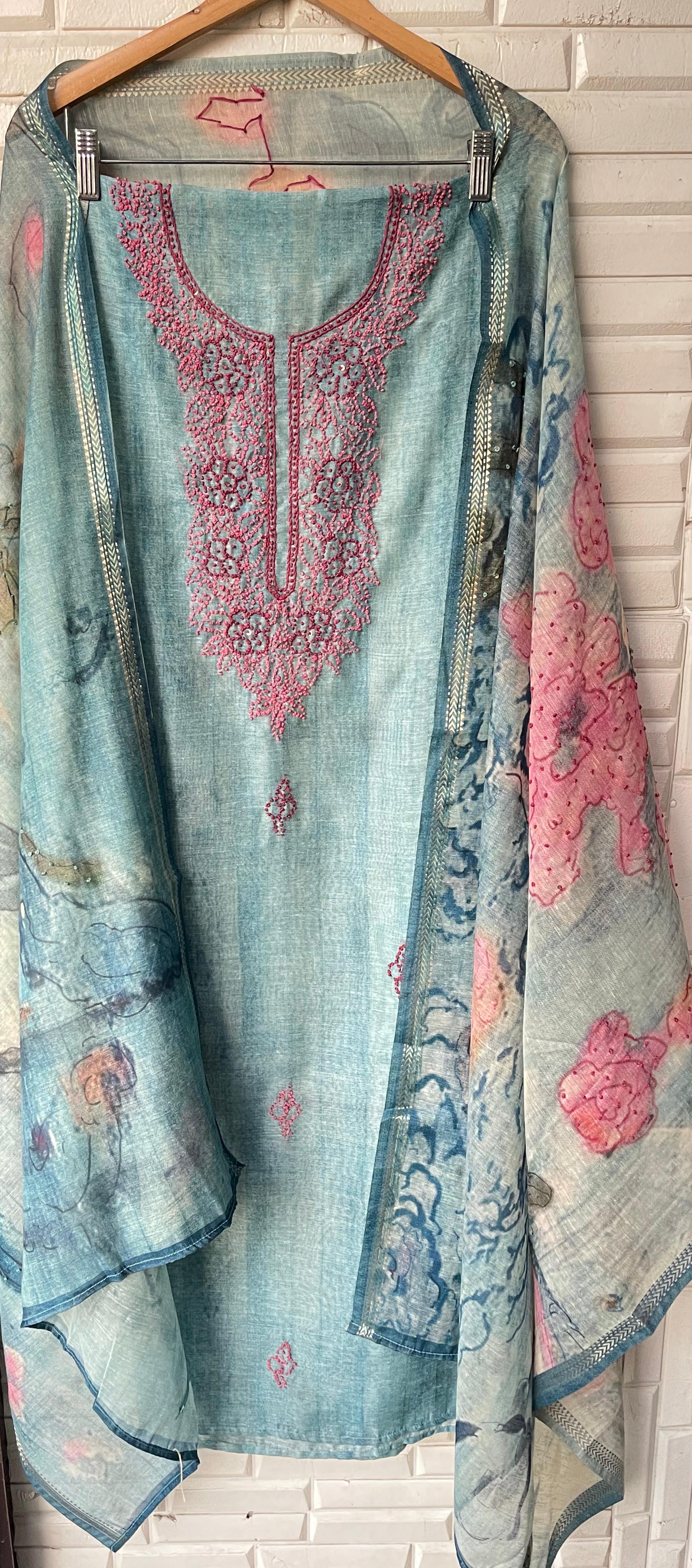 😊 linen silk printed fabric unstitched shirt with intricate resham sequence embroidery