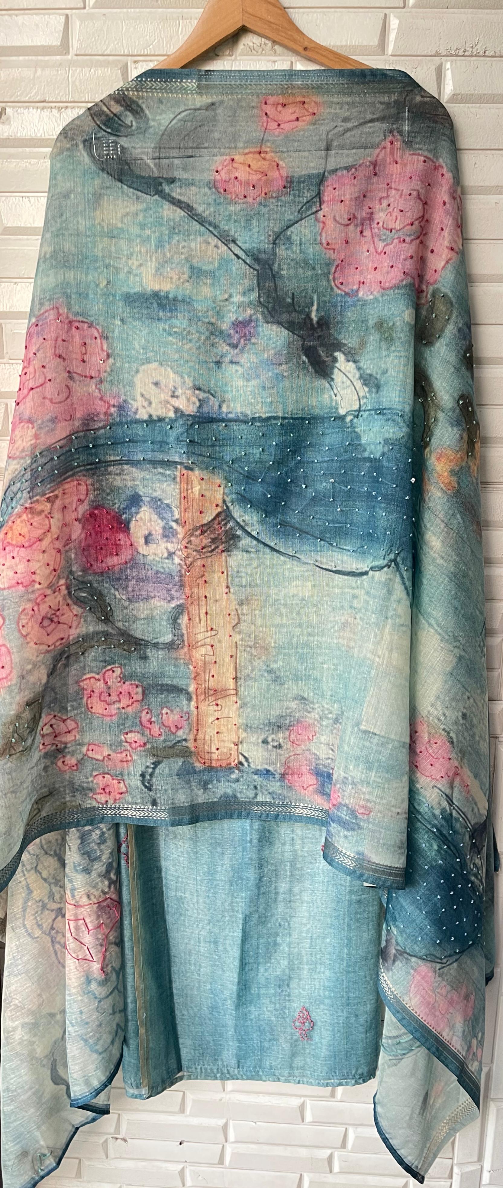 😊 linen silk printed fabric dupatta with resham knots sequence embroidery