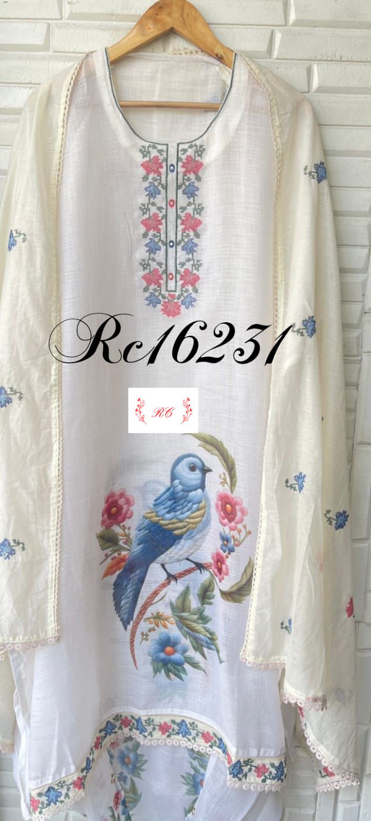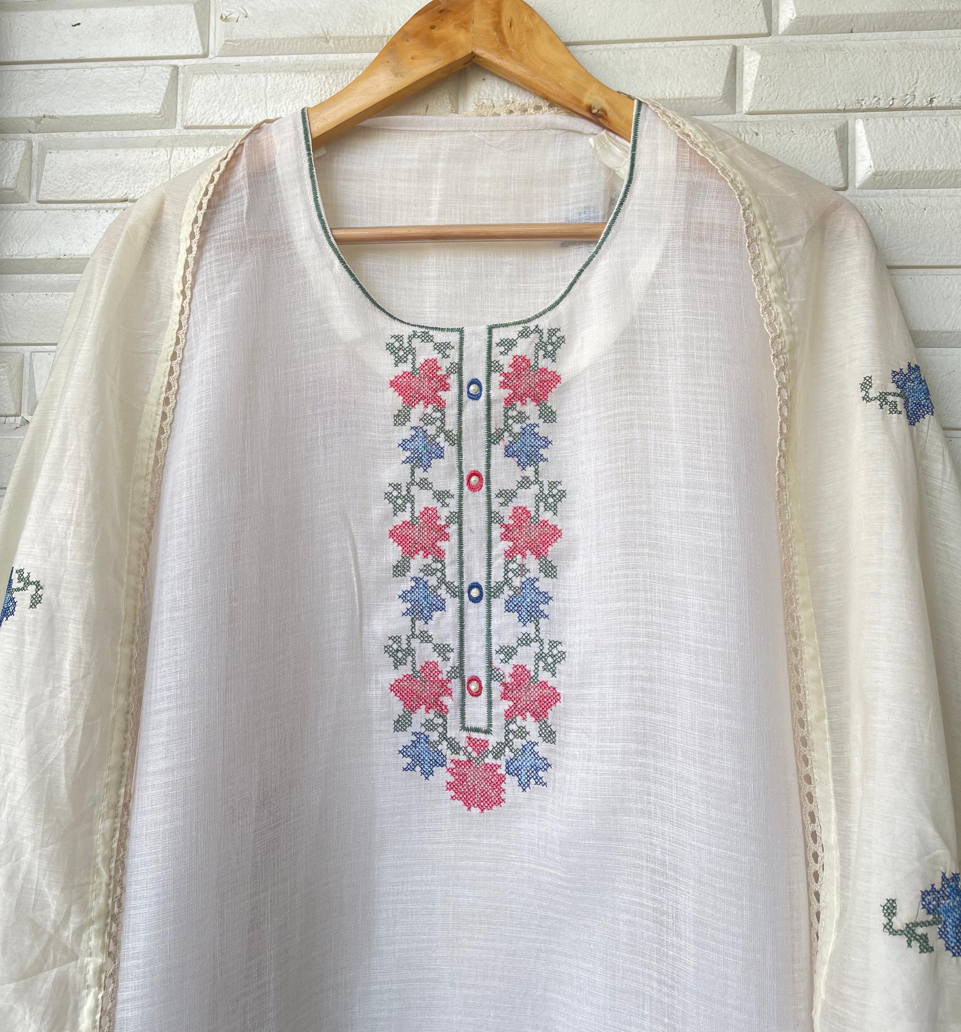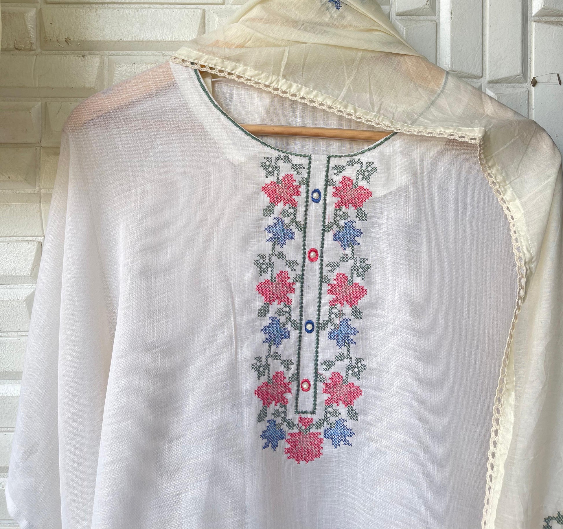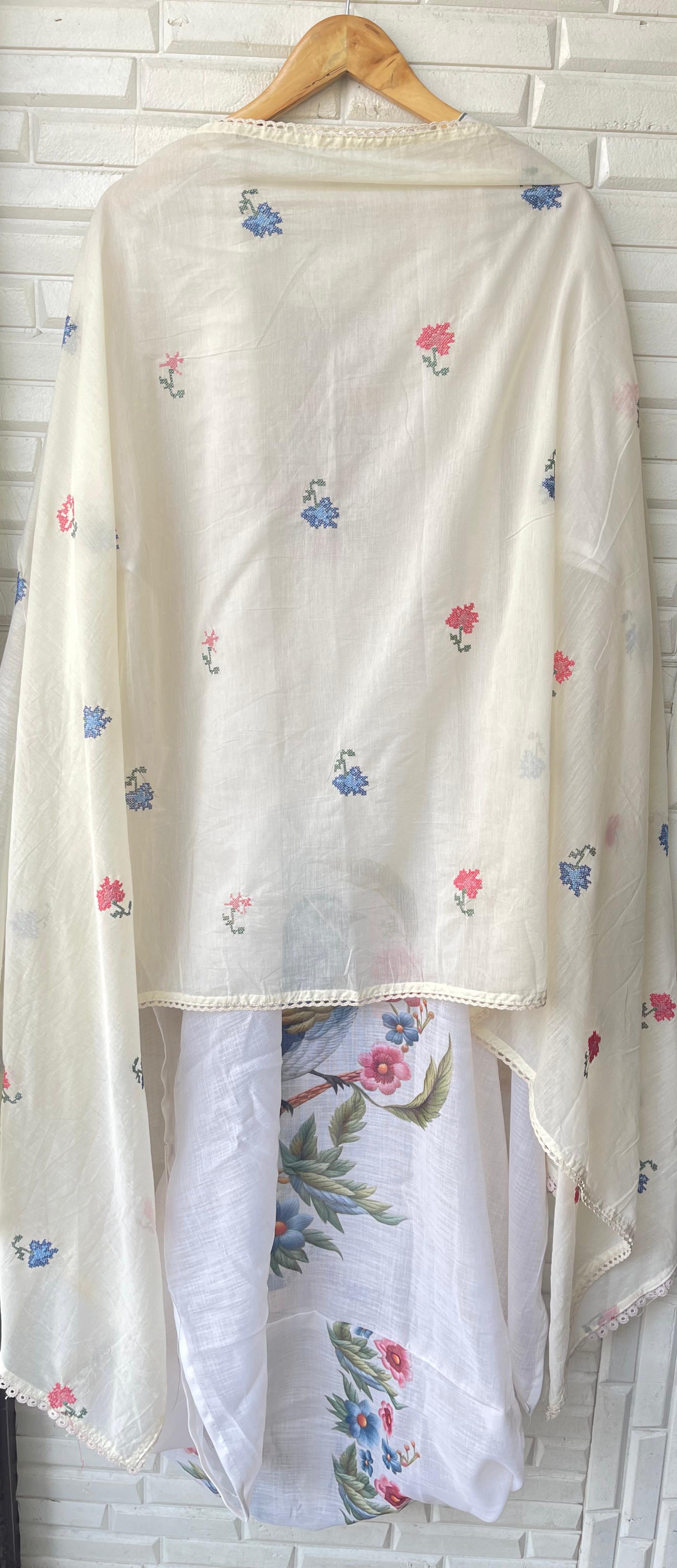 ☺️ cotton linen printed fabric dupatta with resham embroidery and crotia border lace