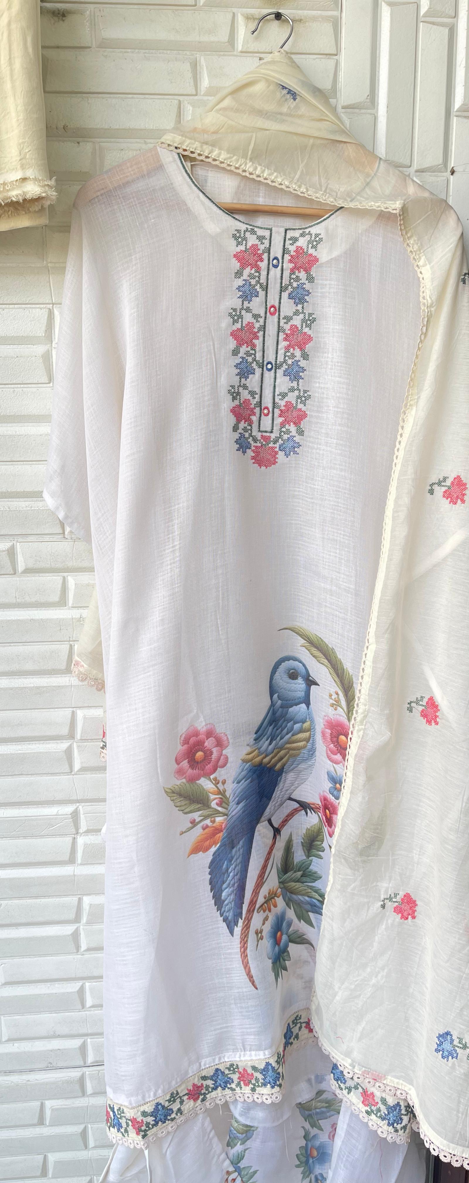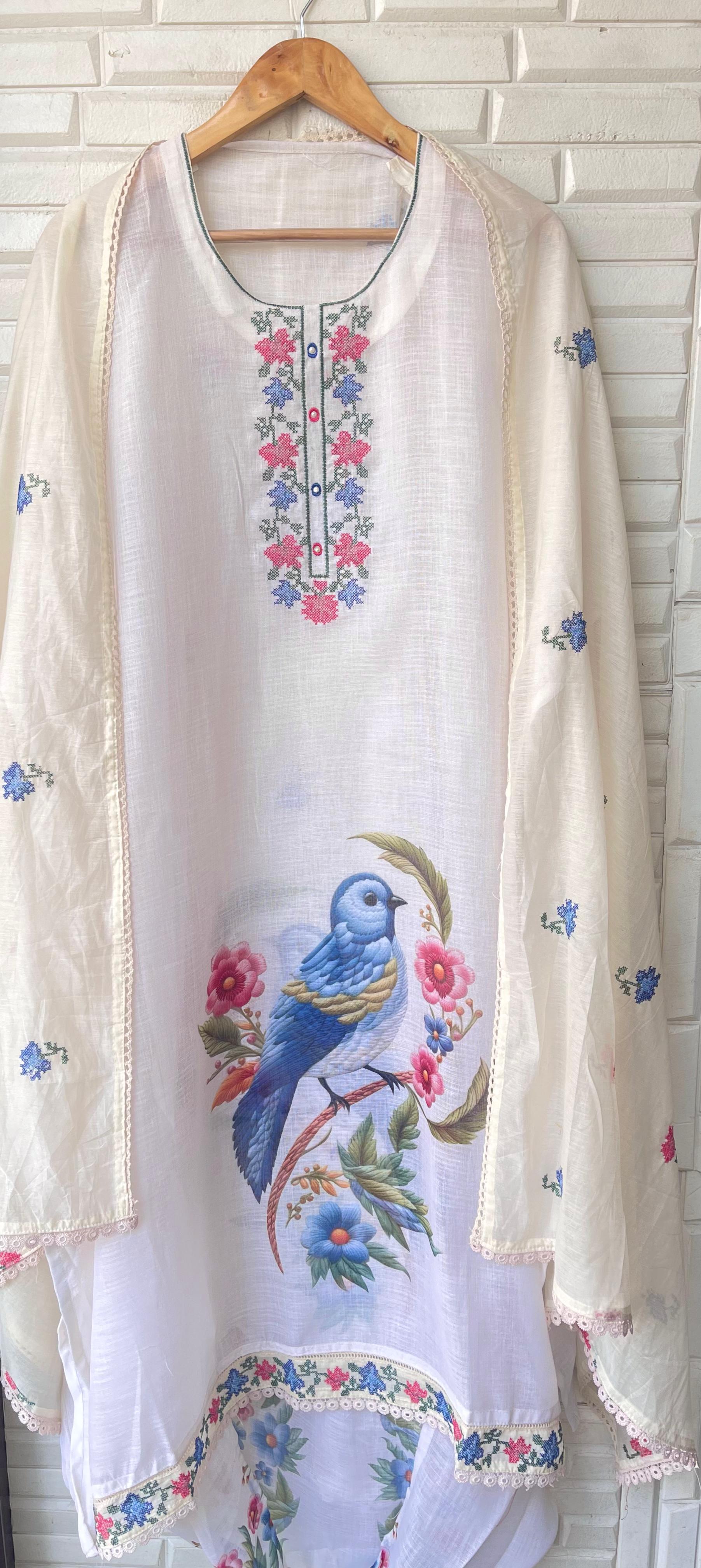 😊 cotton linen printed fabric unstitched shirt with resham embroidery