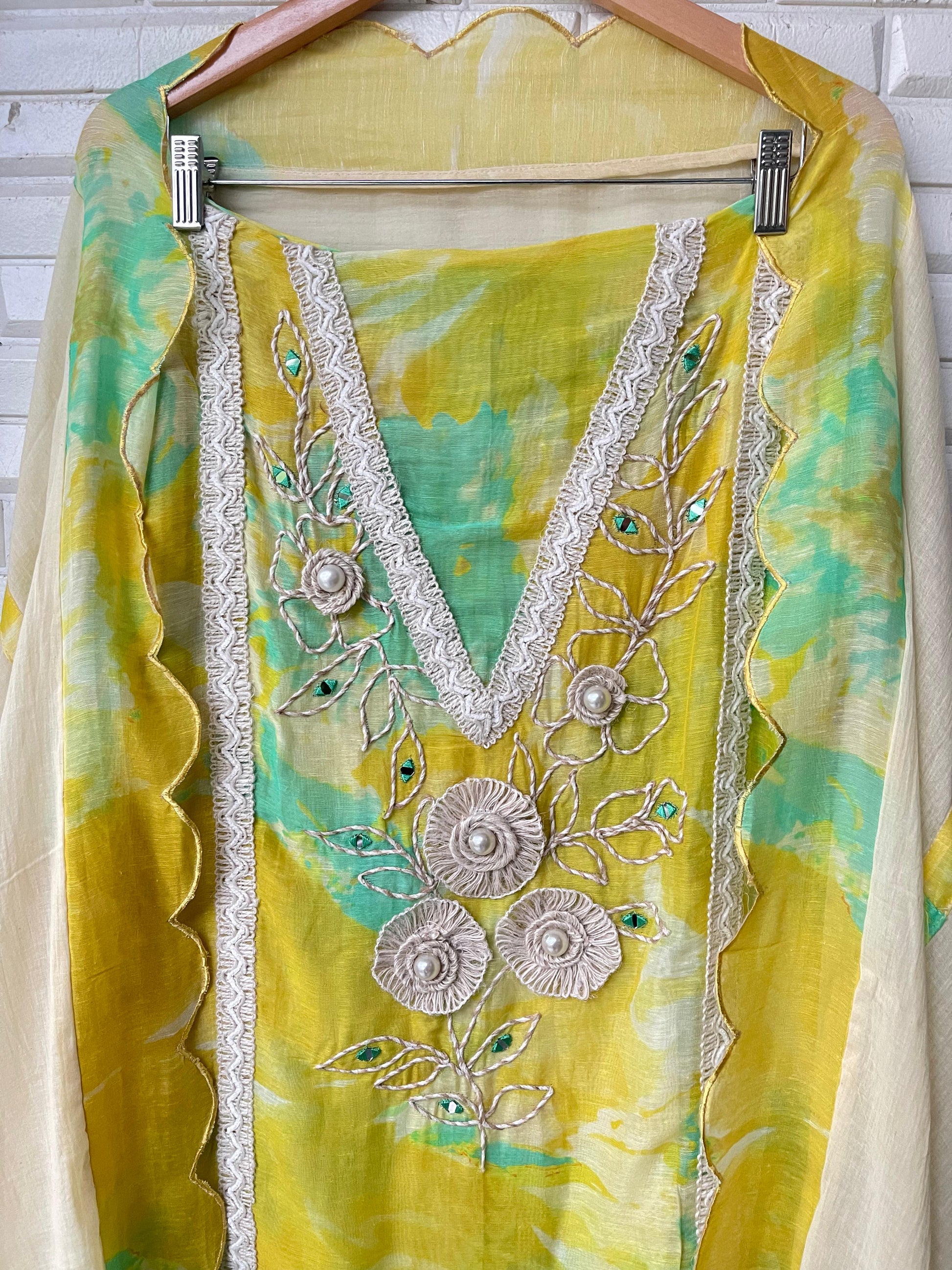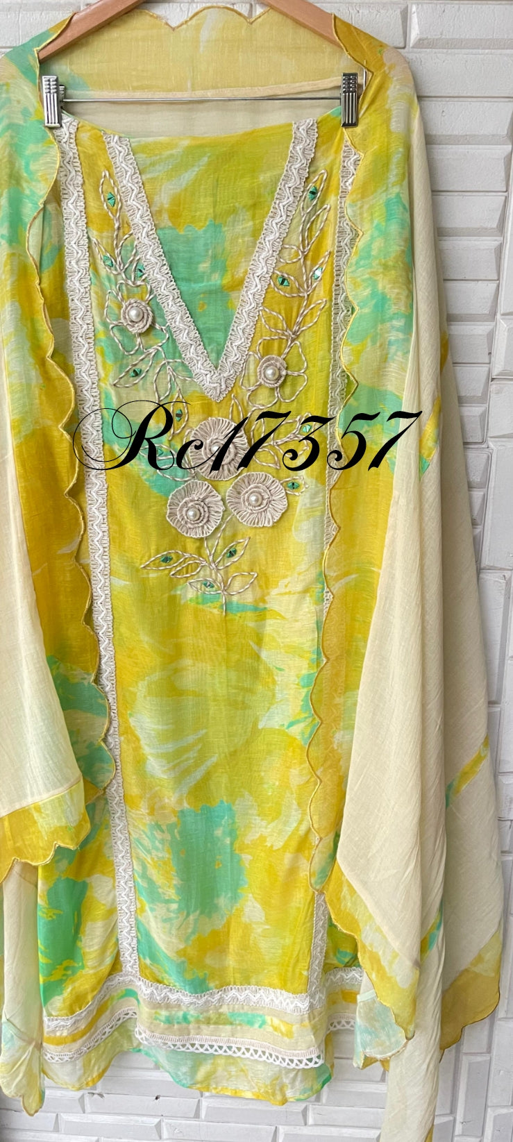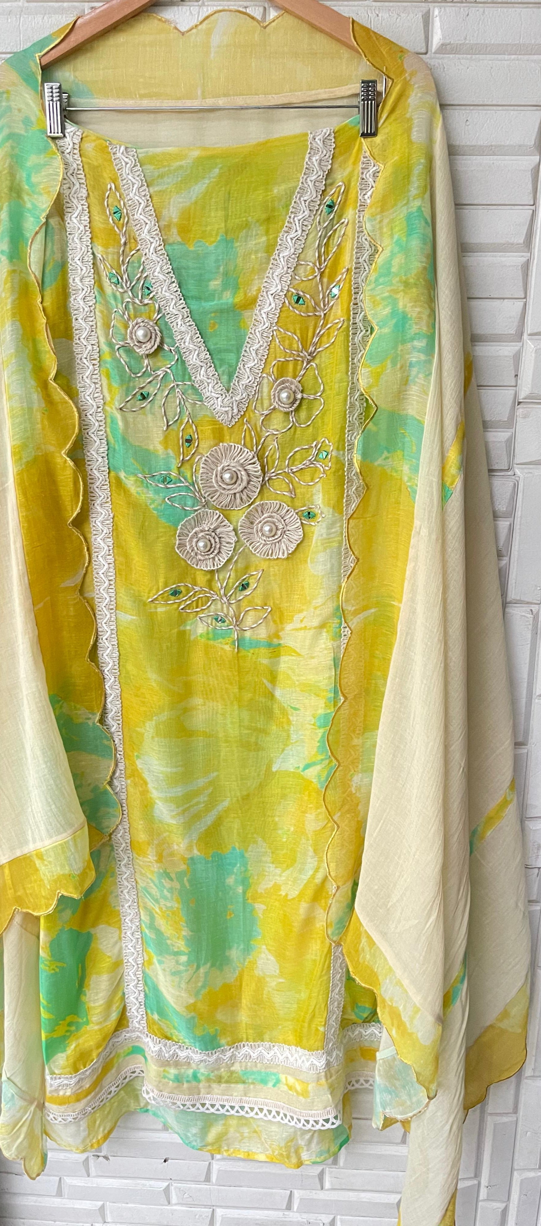 😊 pure linen printed fabric un stitched shirt with resham knots mirror work pearl embroidery and 3D flowers