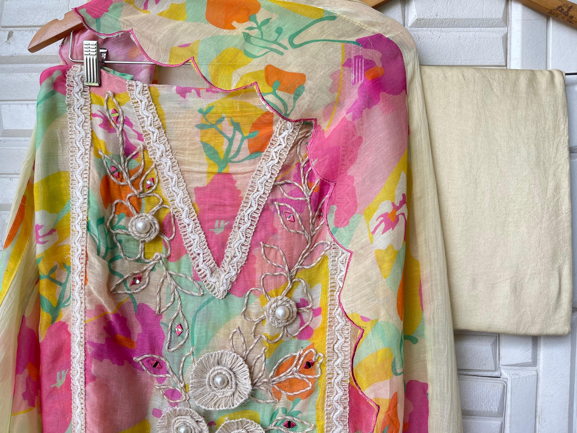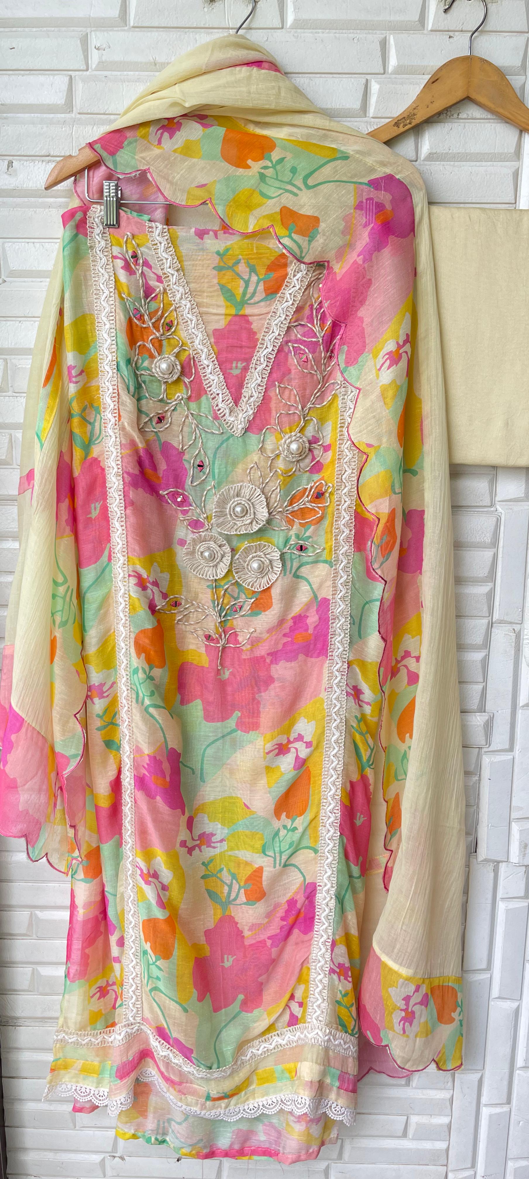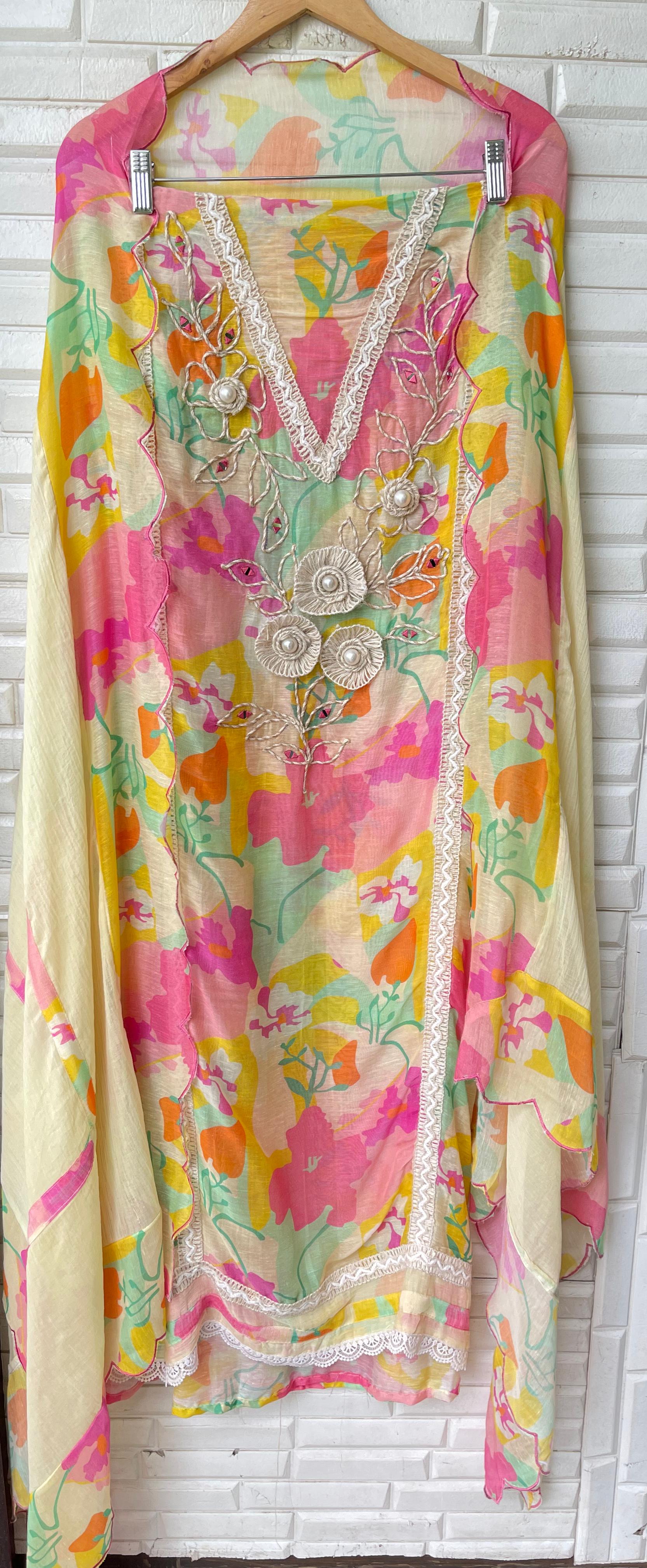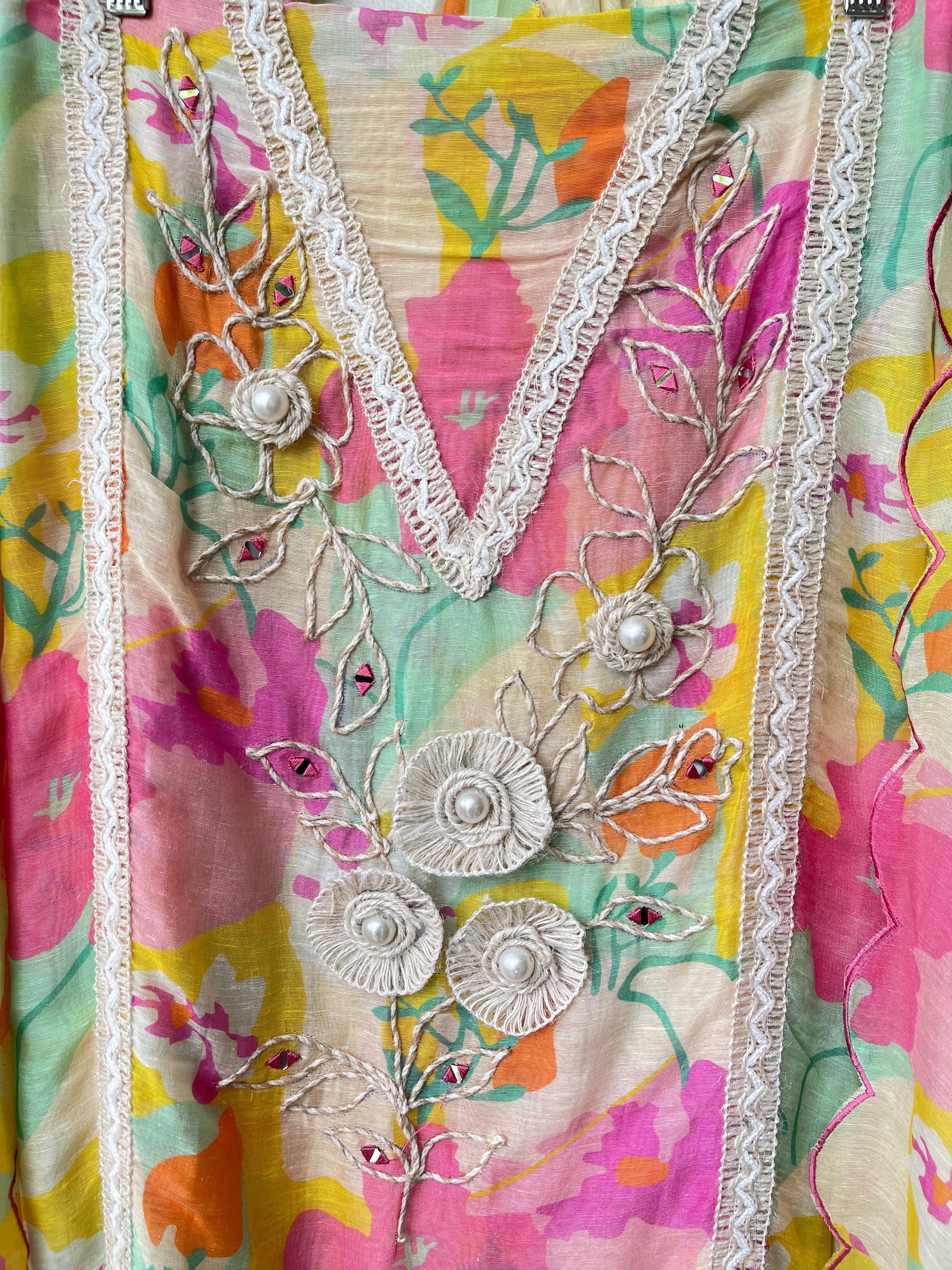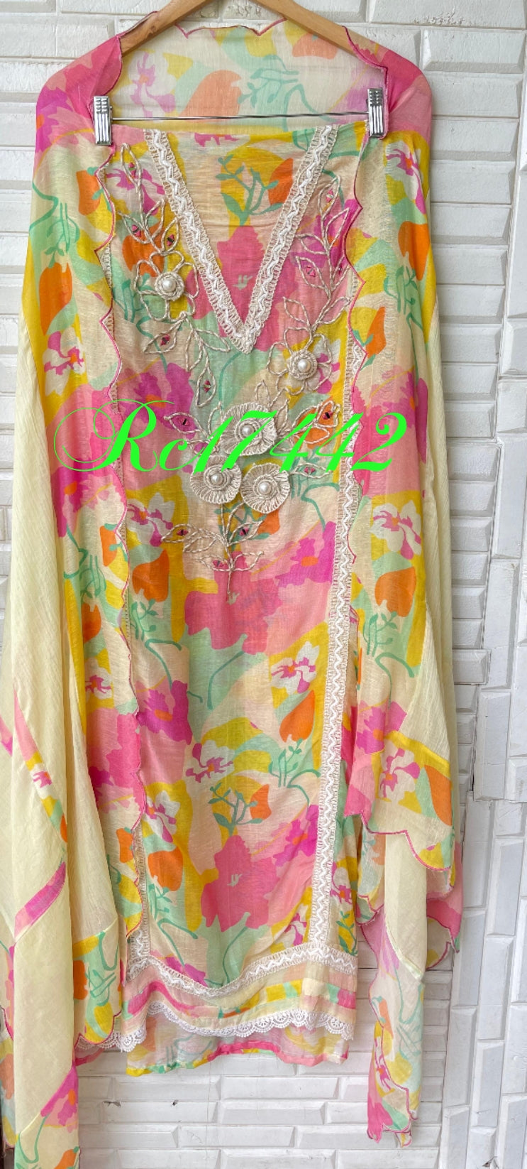 😊 pure linen printed fabric un stitched shirt with resham knots mirror work pearl embroidery and 3D flowers
