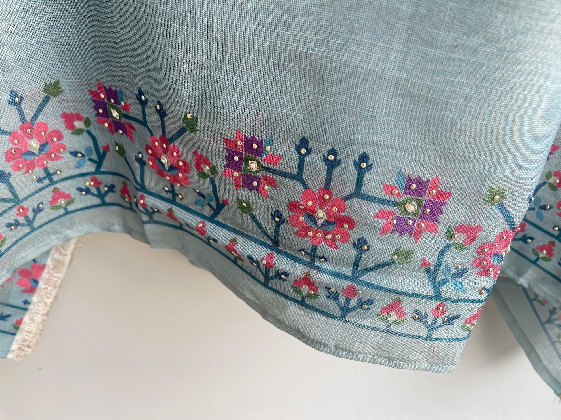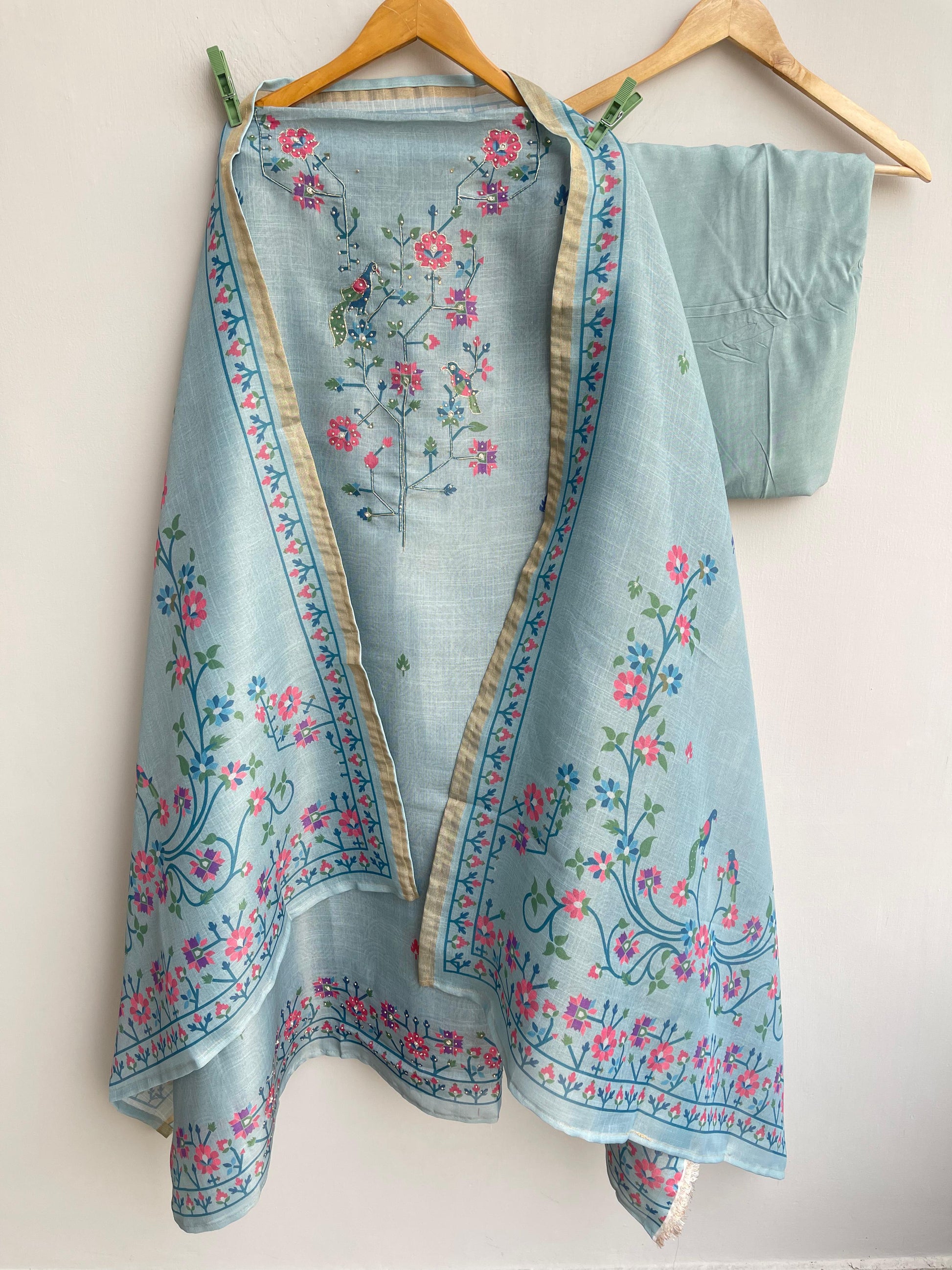 π linen printed fabric unstitched shirt with dabka pearl zari swarowski embroidery