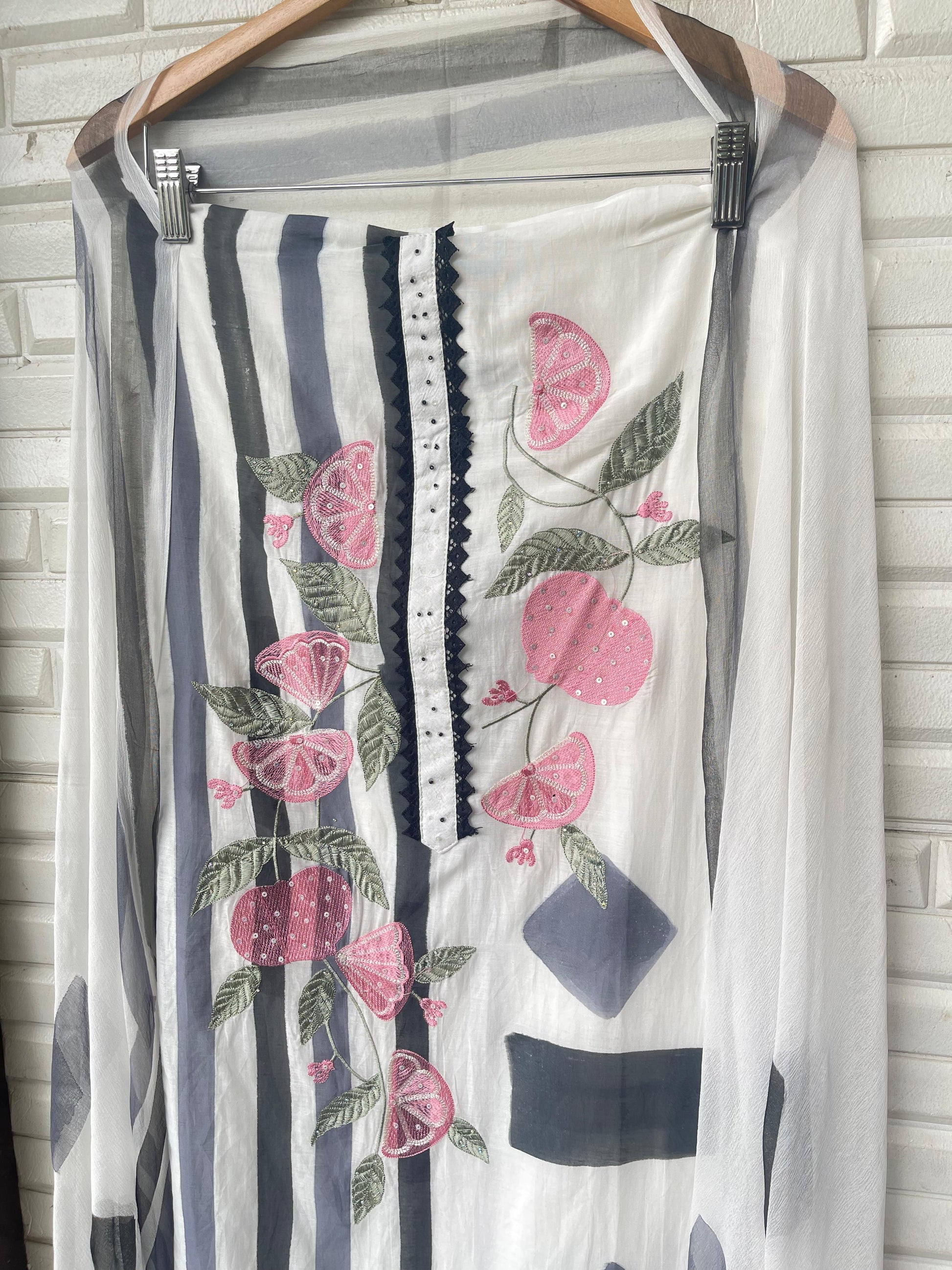 😊 mul chanderi printed fabric un stitched shirt with resham sequence embroidery and crotia lace work and swarowski highlighting