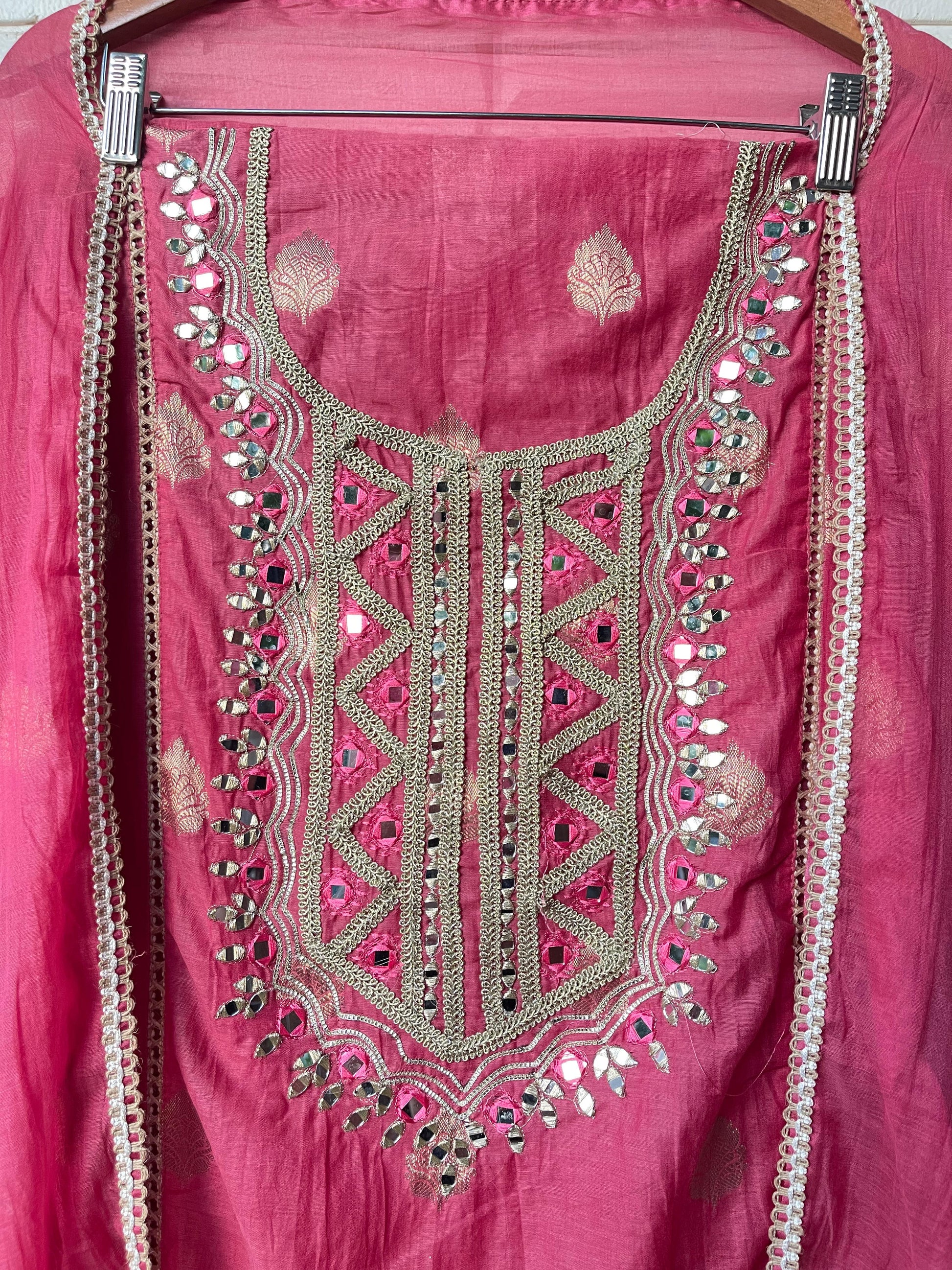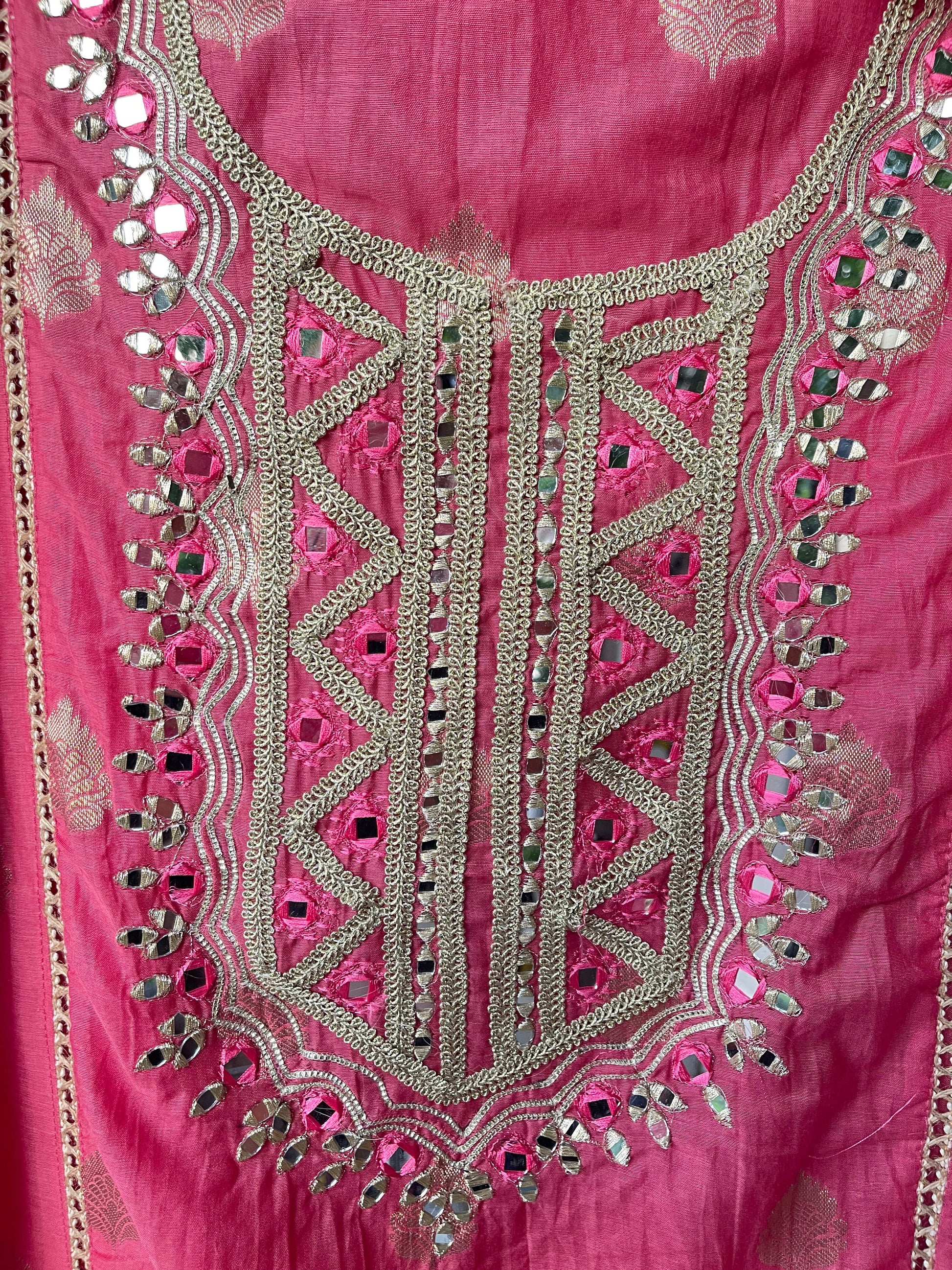 π banarasi mul chanderi fabric semi stitched shirt with mirror gotta work resham embroidery and zari lace on neck and zari border insertions
