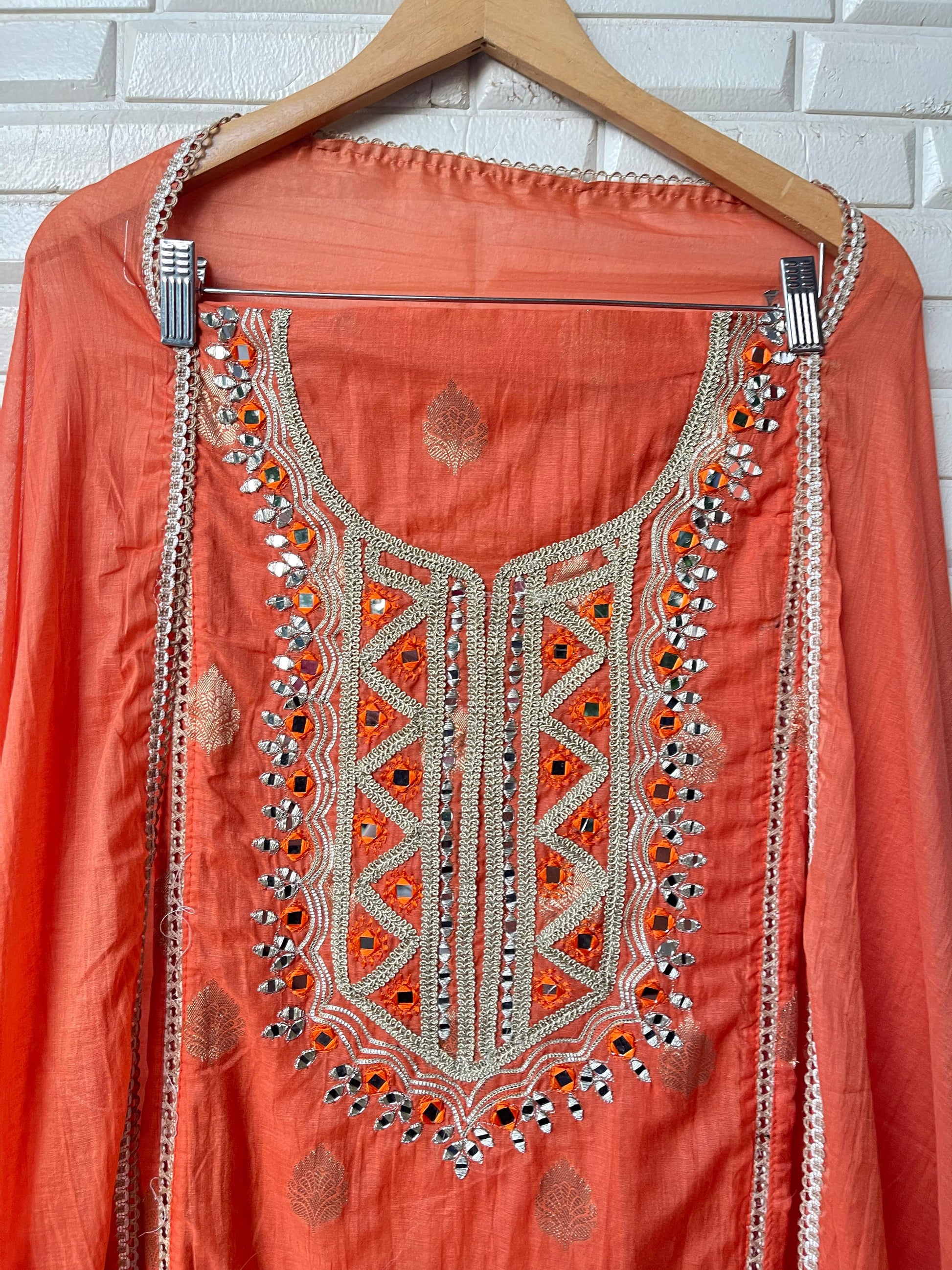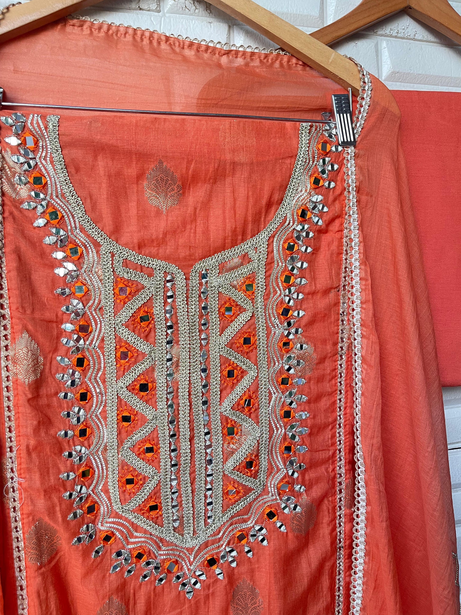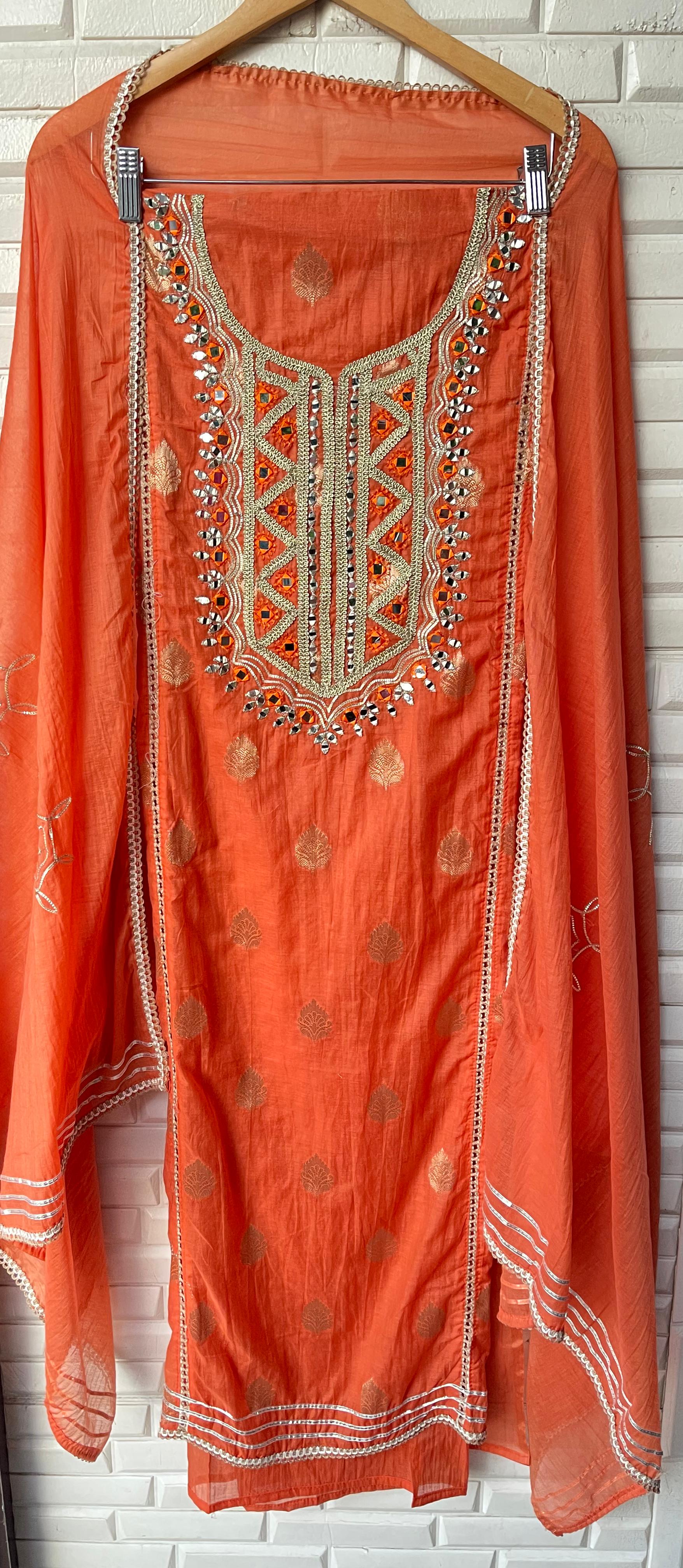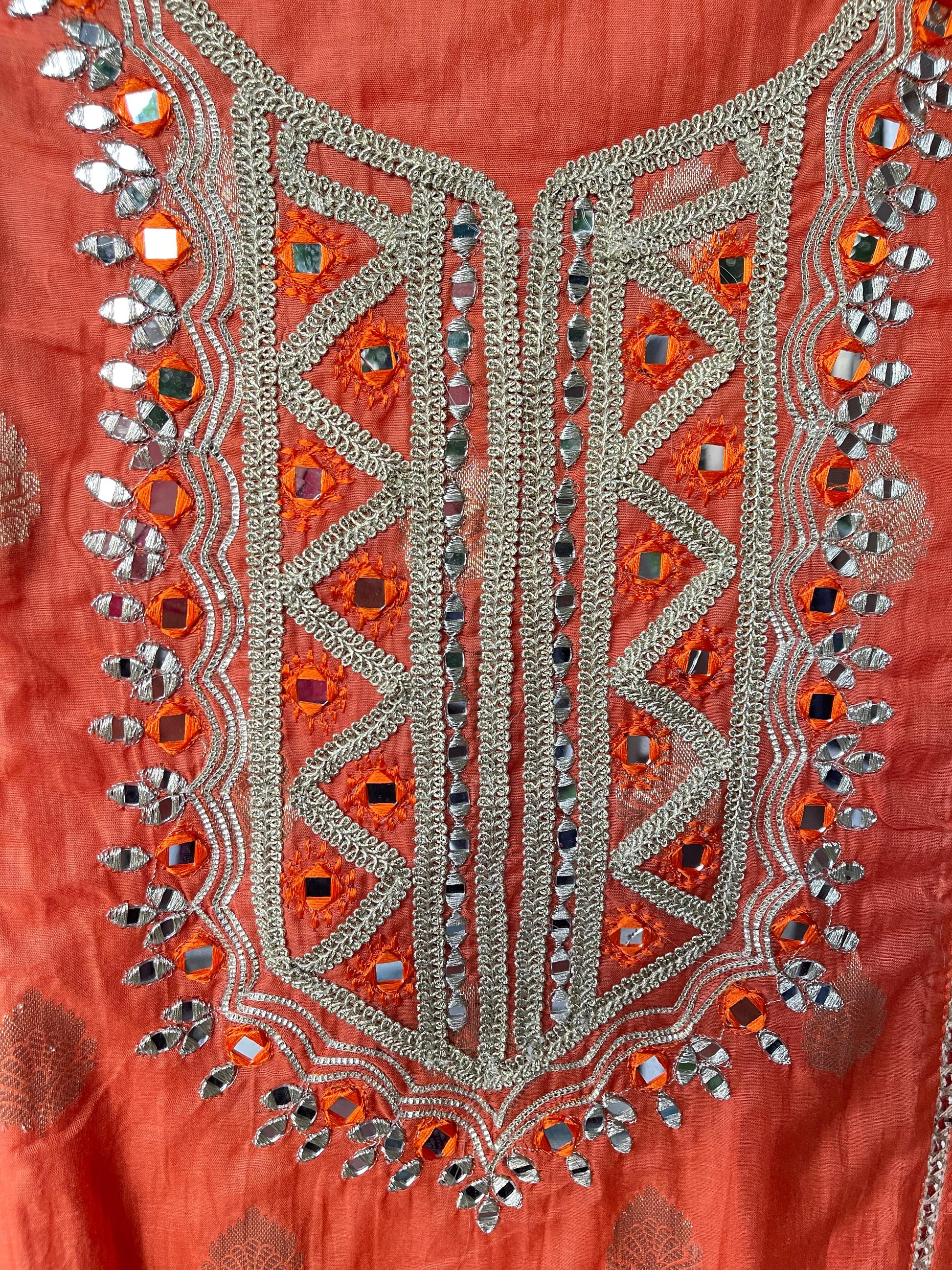 π banarasi mul chanderi fabric semi stitched shirt with mirror gotta work resham embroidery and zari lace on neck and zari border insertions