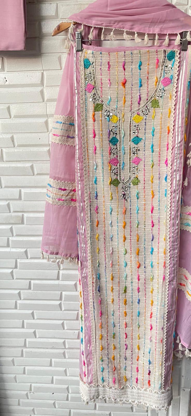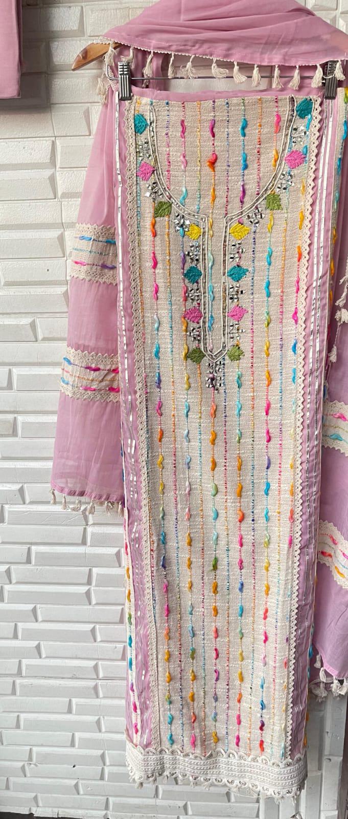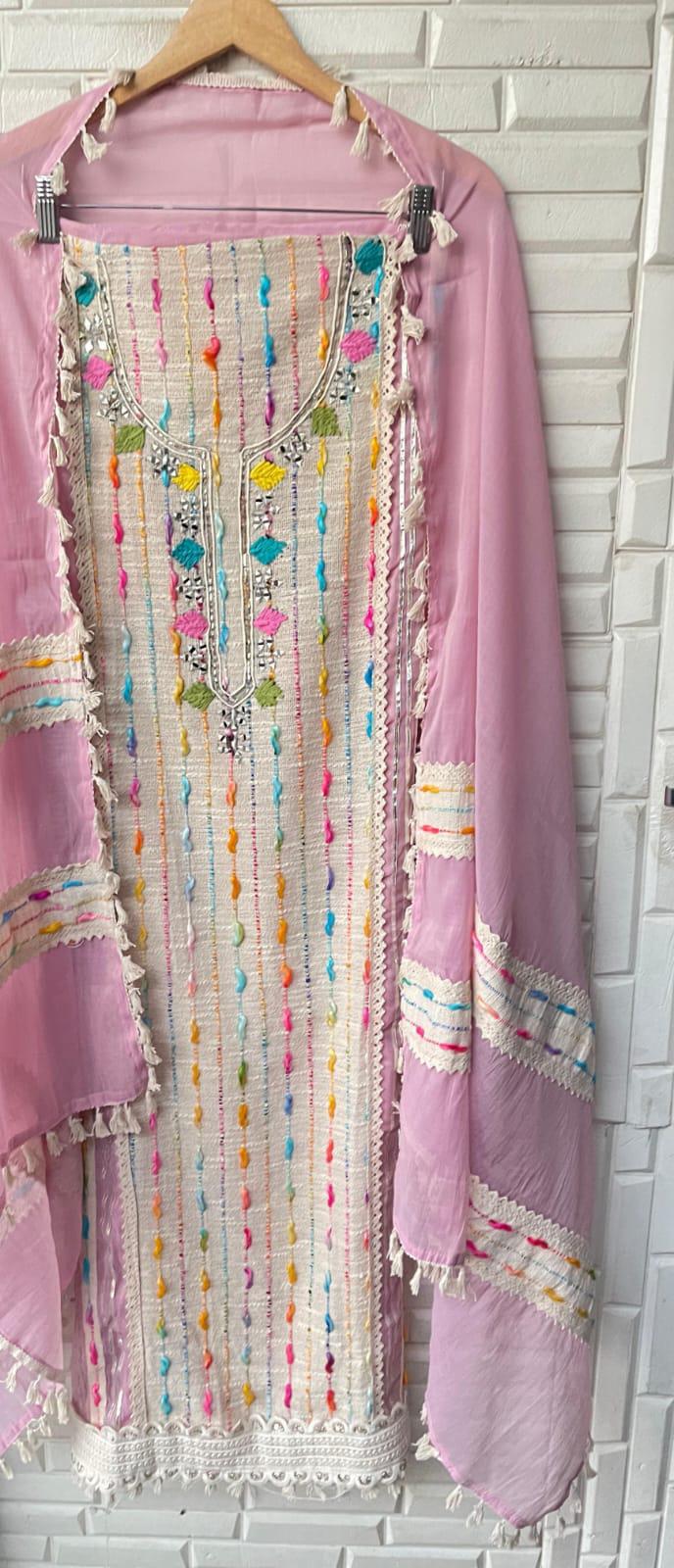 π mul chanderi fabric with hand crafted jute fabric un stitched shirt with gotta lace work mirror work resham embroidery and crotia ghera lace with sequence highlighting