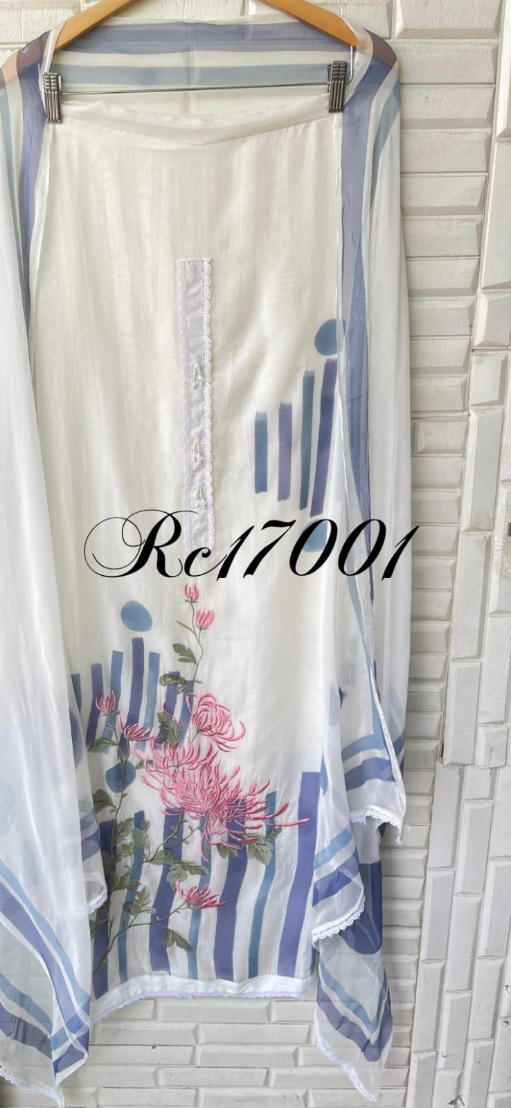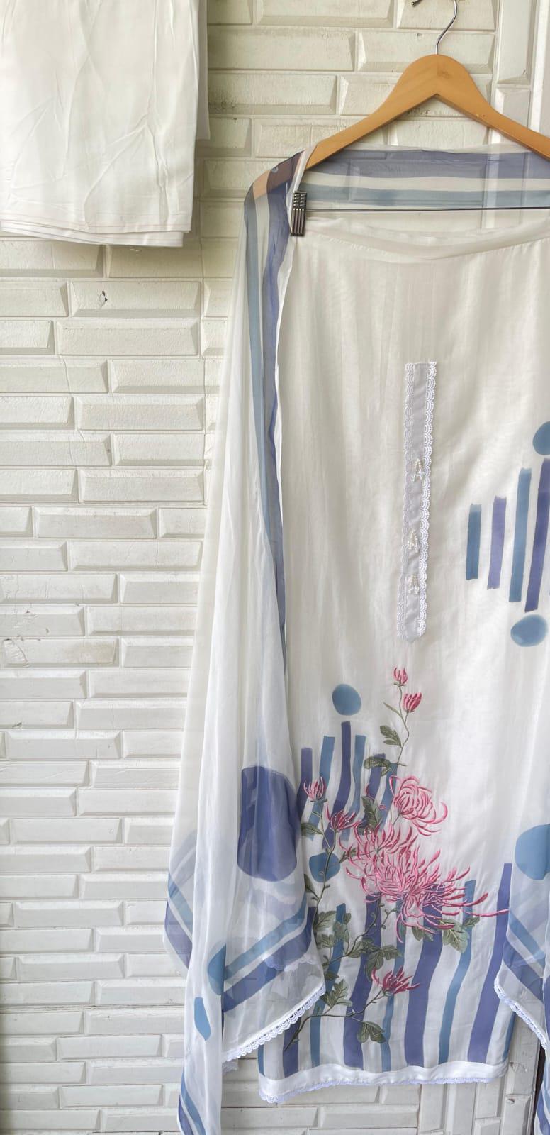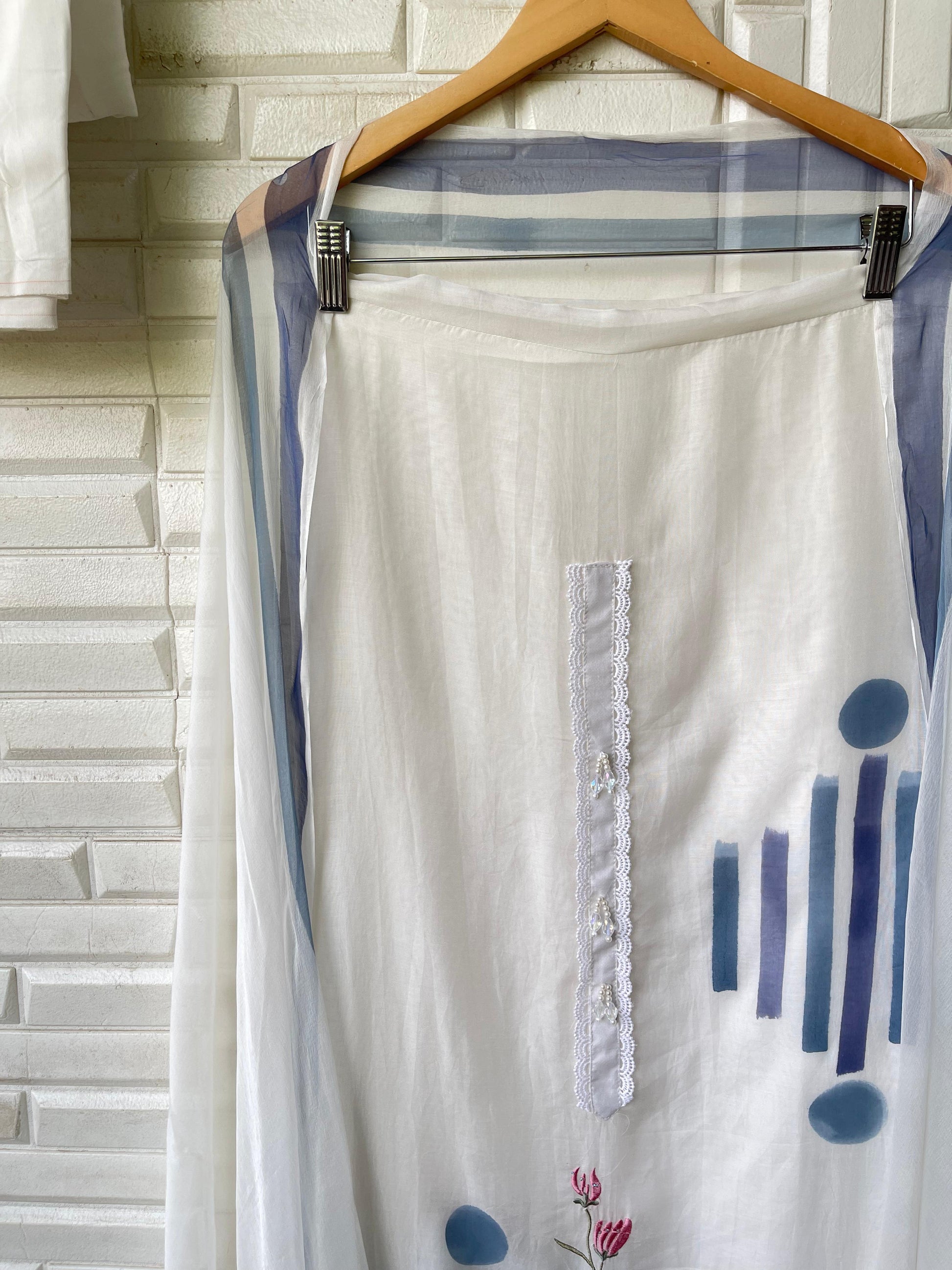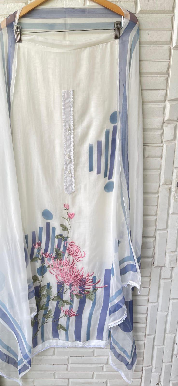 π mul Chanderi brush painted un stitched shirt with resham swarowski embroidery and crotia lace work