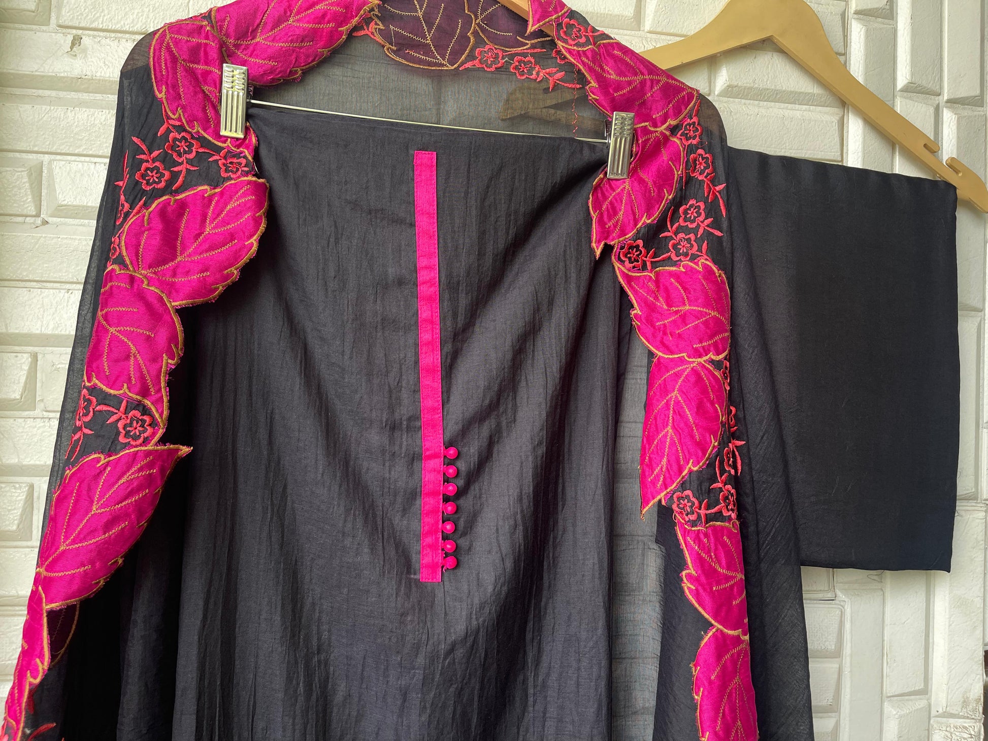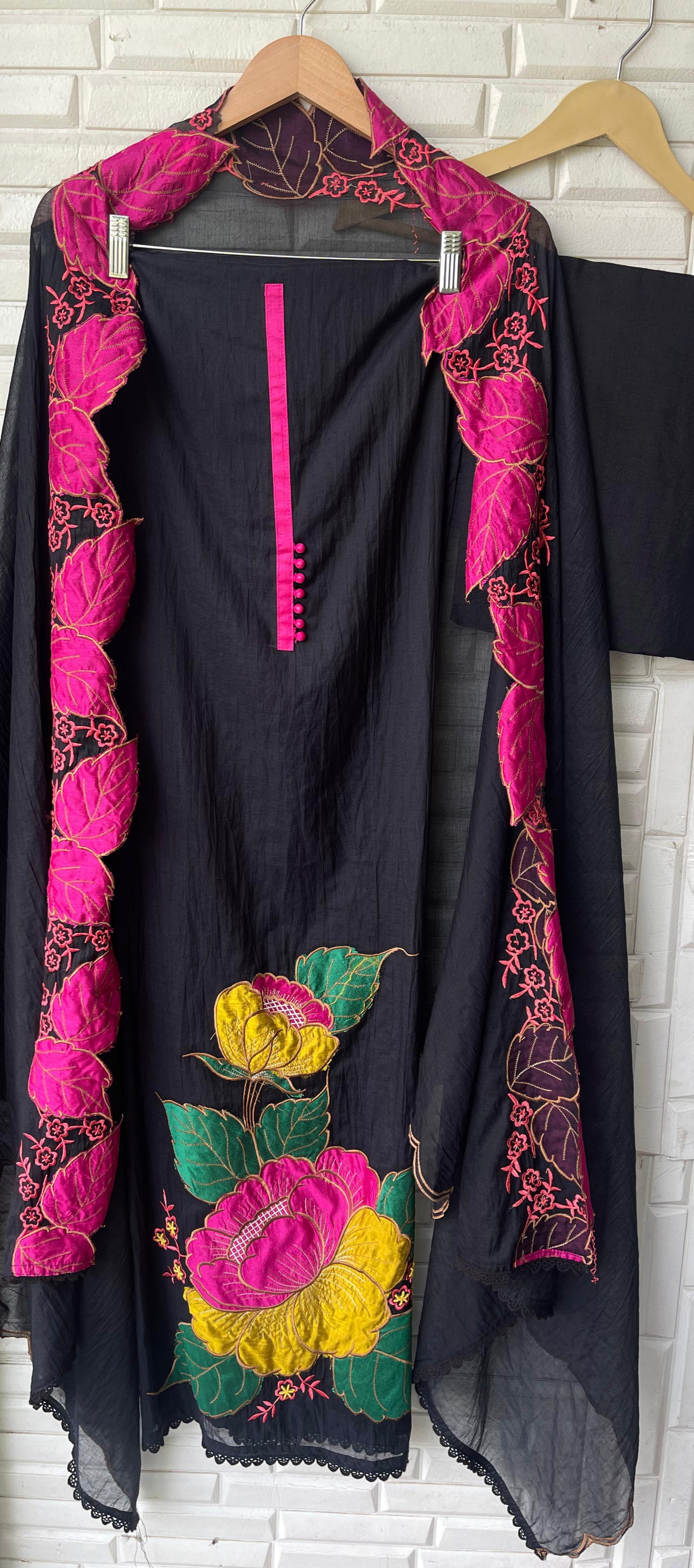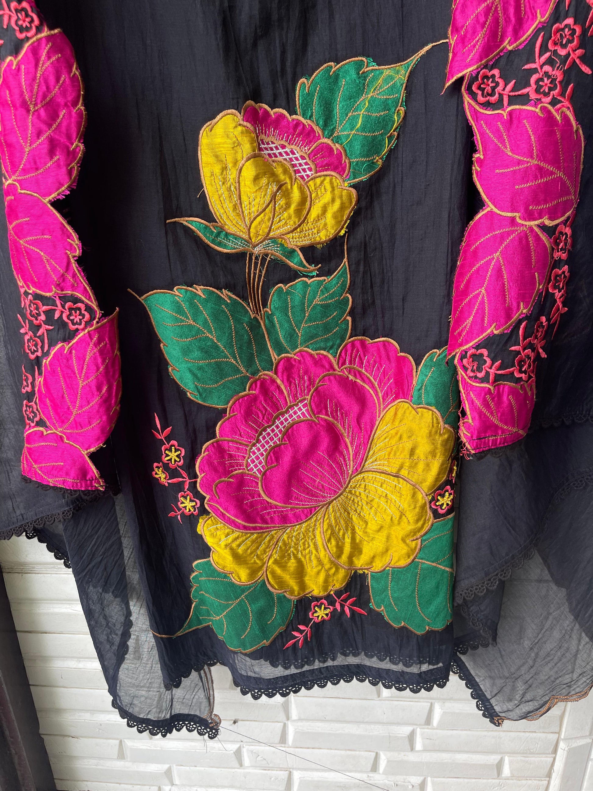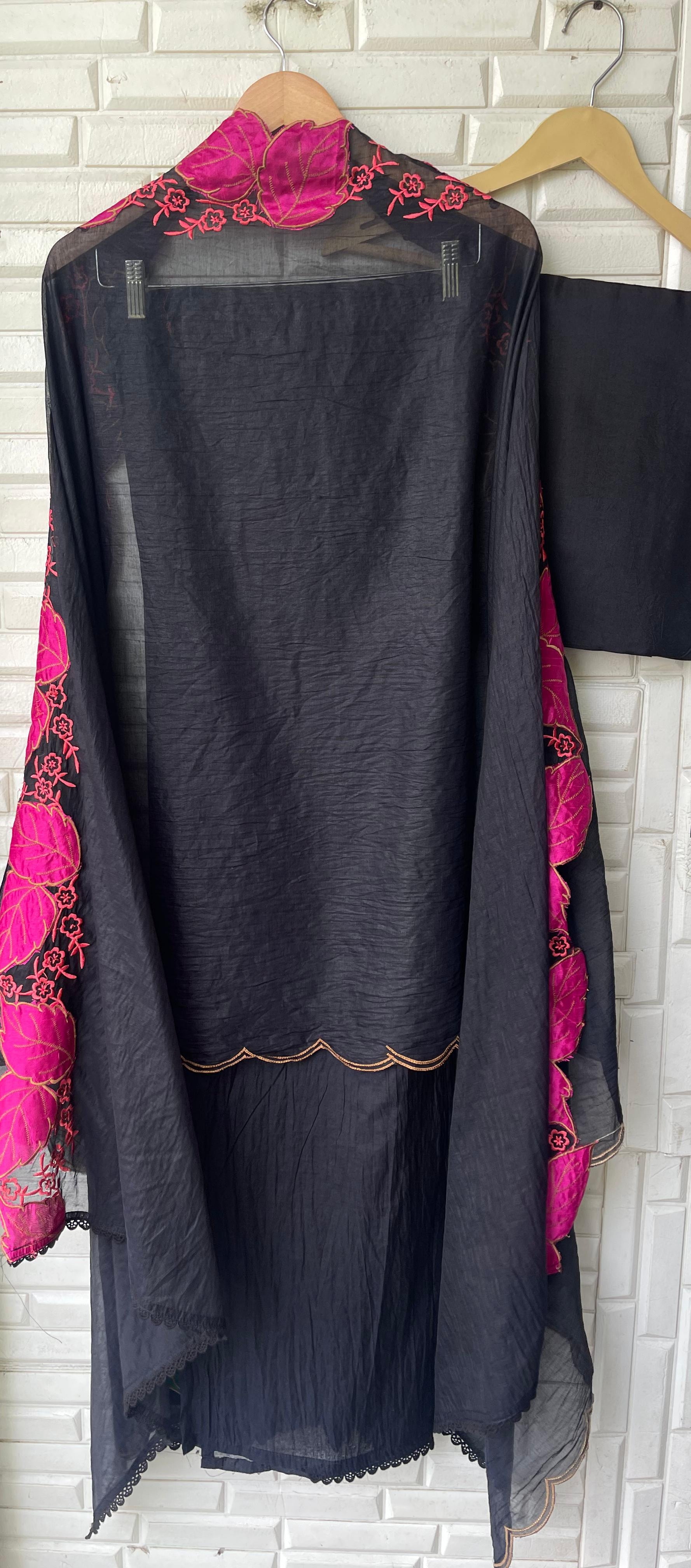 😊 mul chanderi fabric un stitched shirt with patchwork and resham zari embroidery and crotia ghera lace