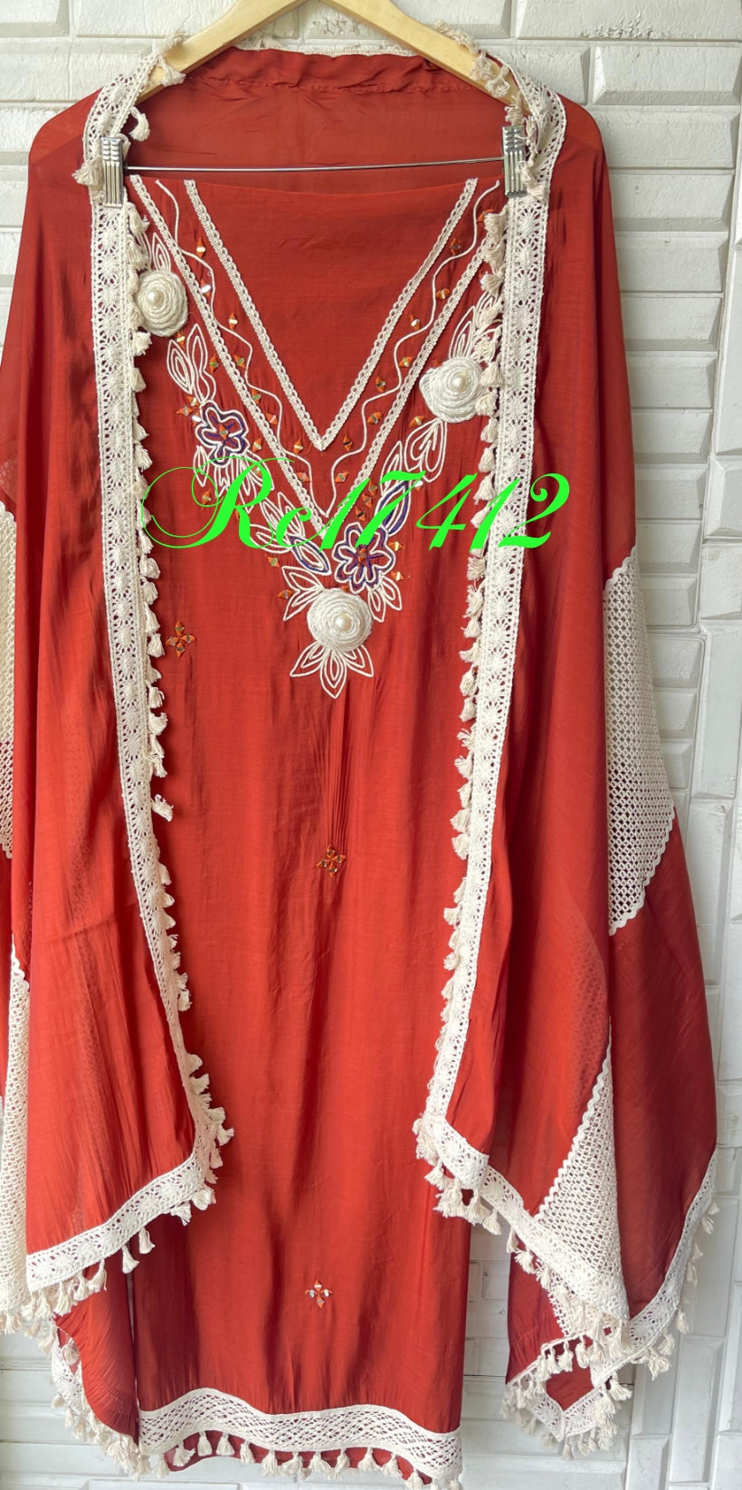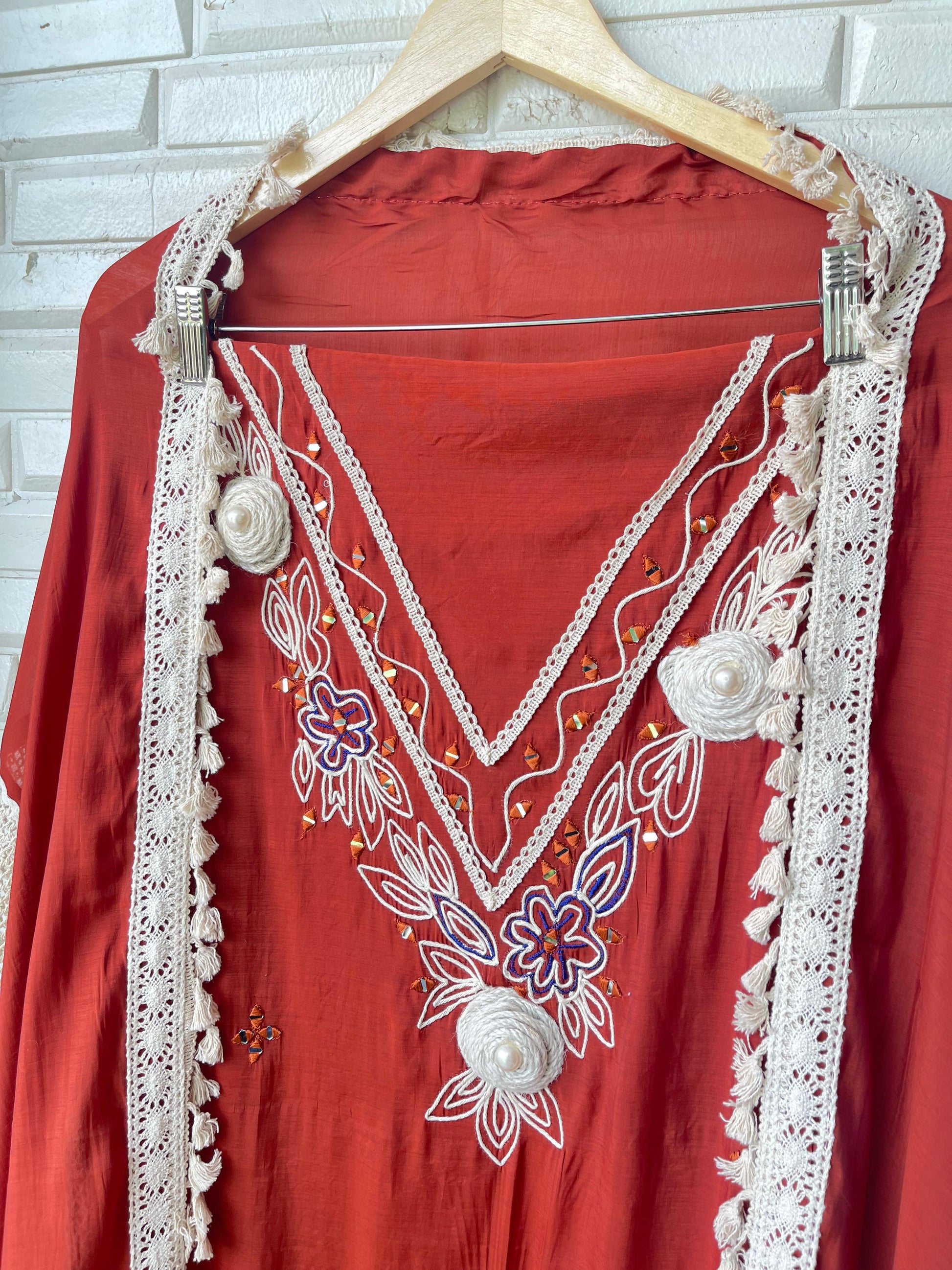 😊 mul Chanderi fabric unstitched shirt with mirror work resham embroidery and 3D flowers and crotia lace work with pom pom lace