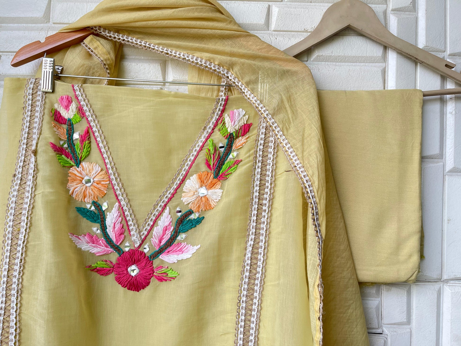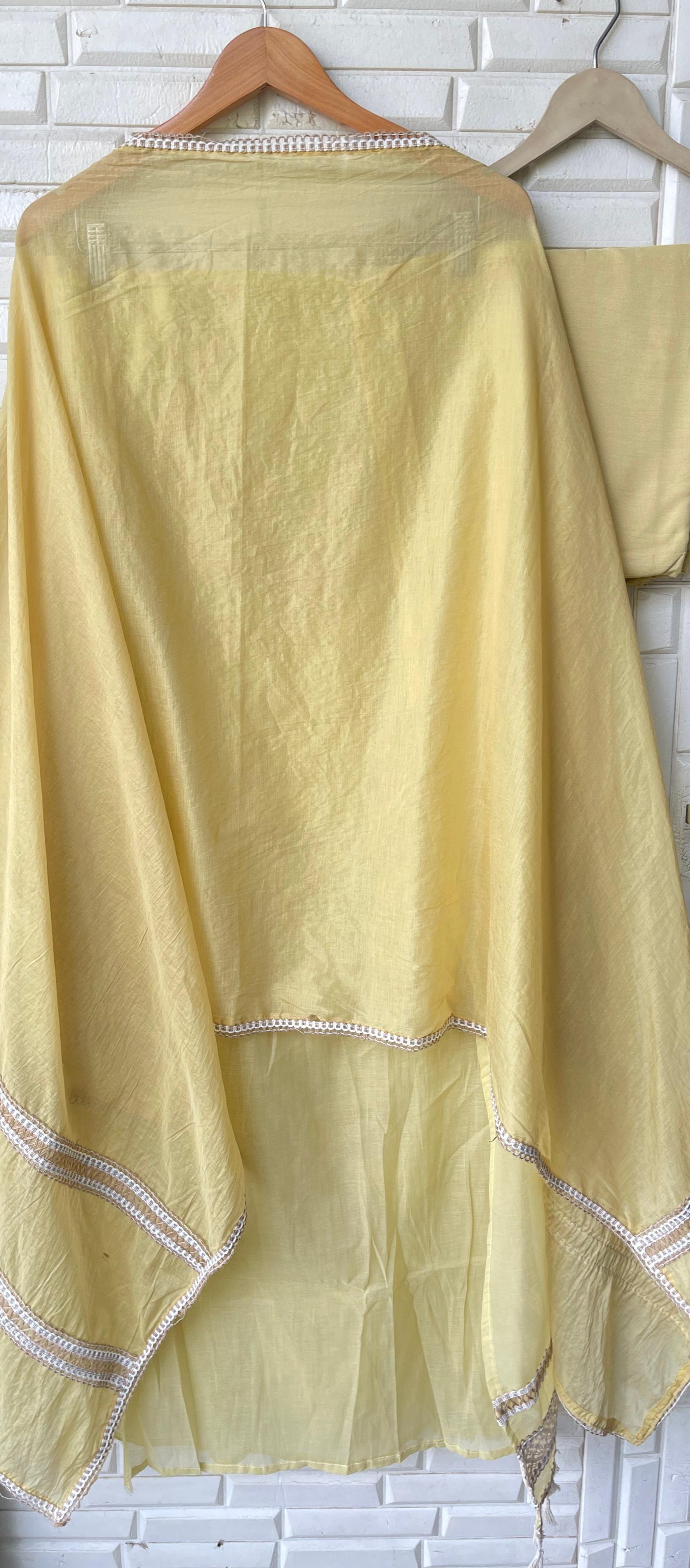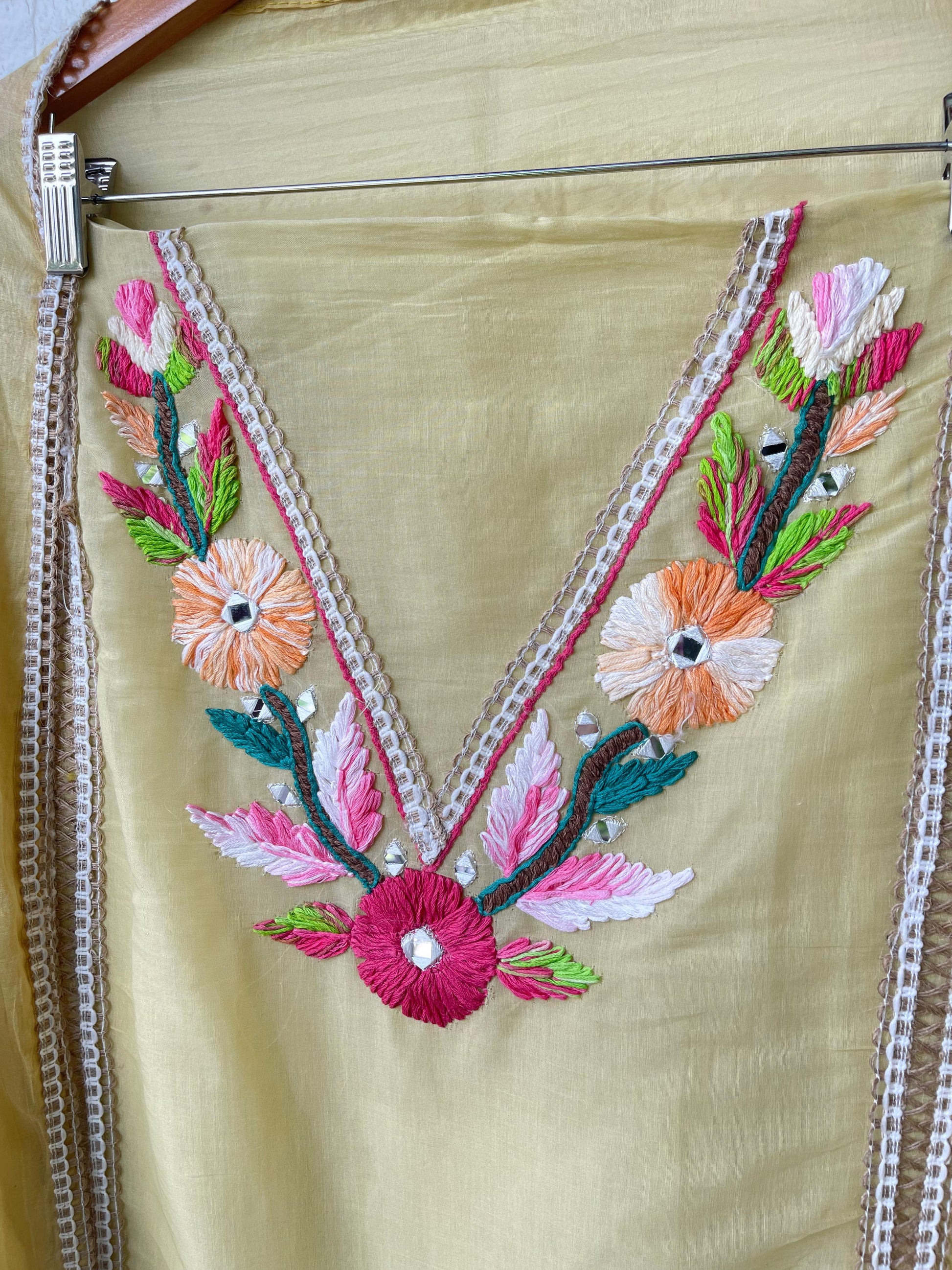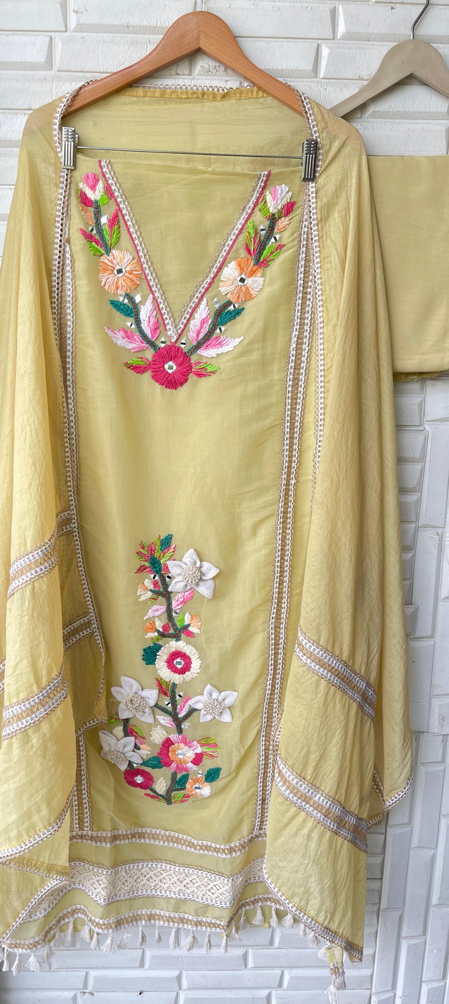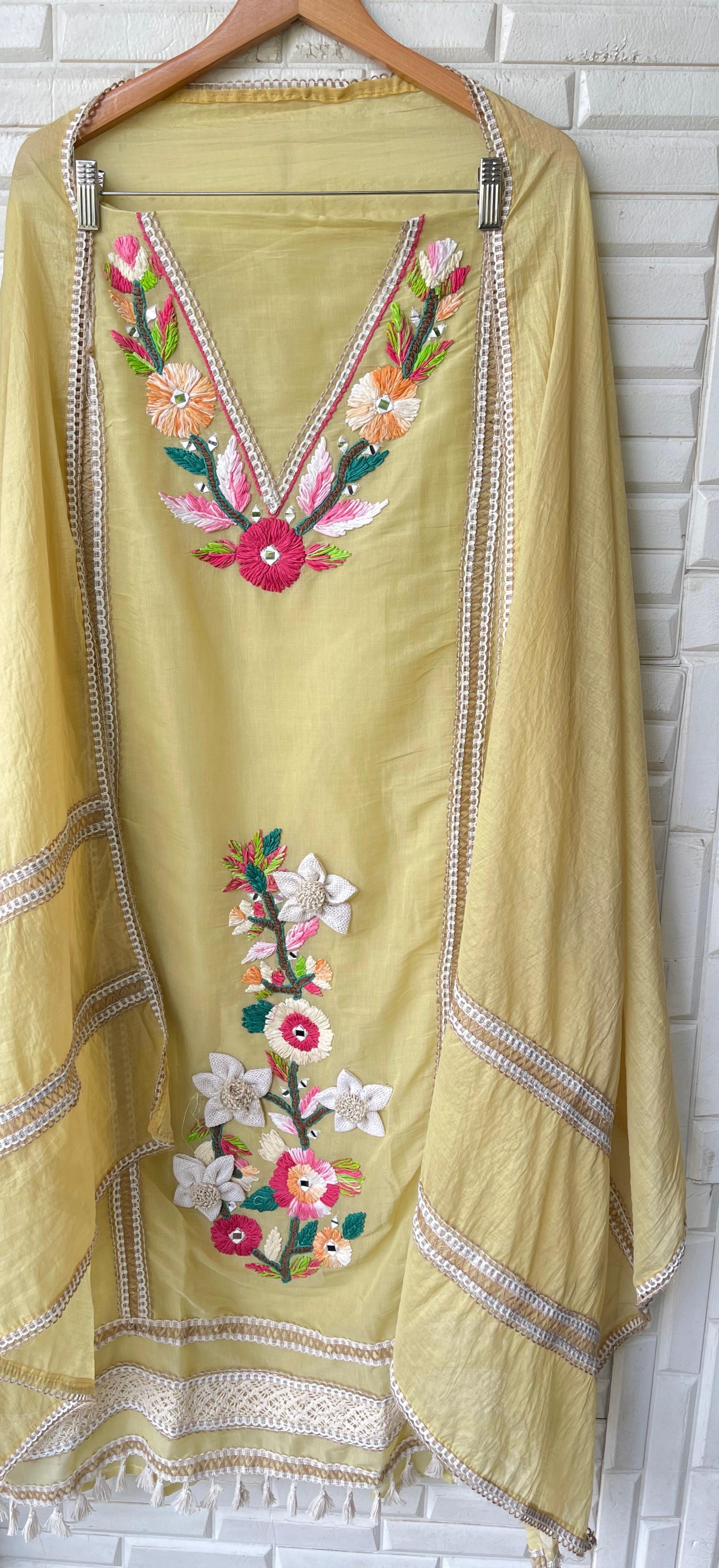 😊 mul chanderi fabric un stitched shirt with mirror work resham embroidery and crotia panel insertions and ghera lace
