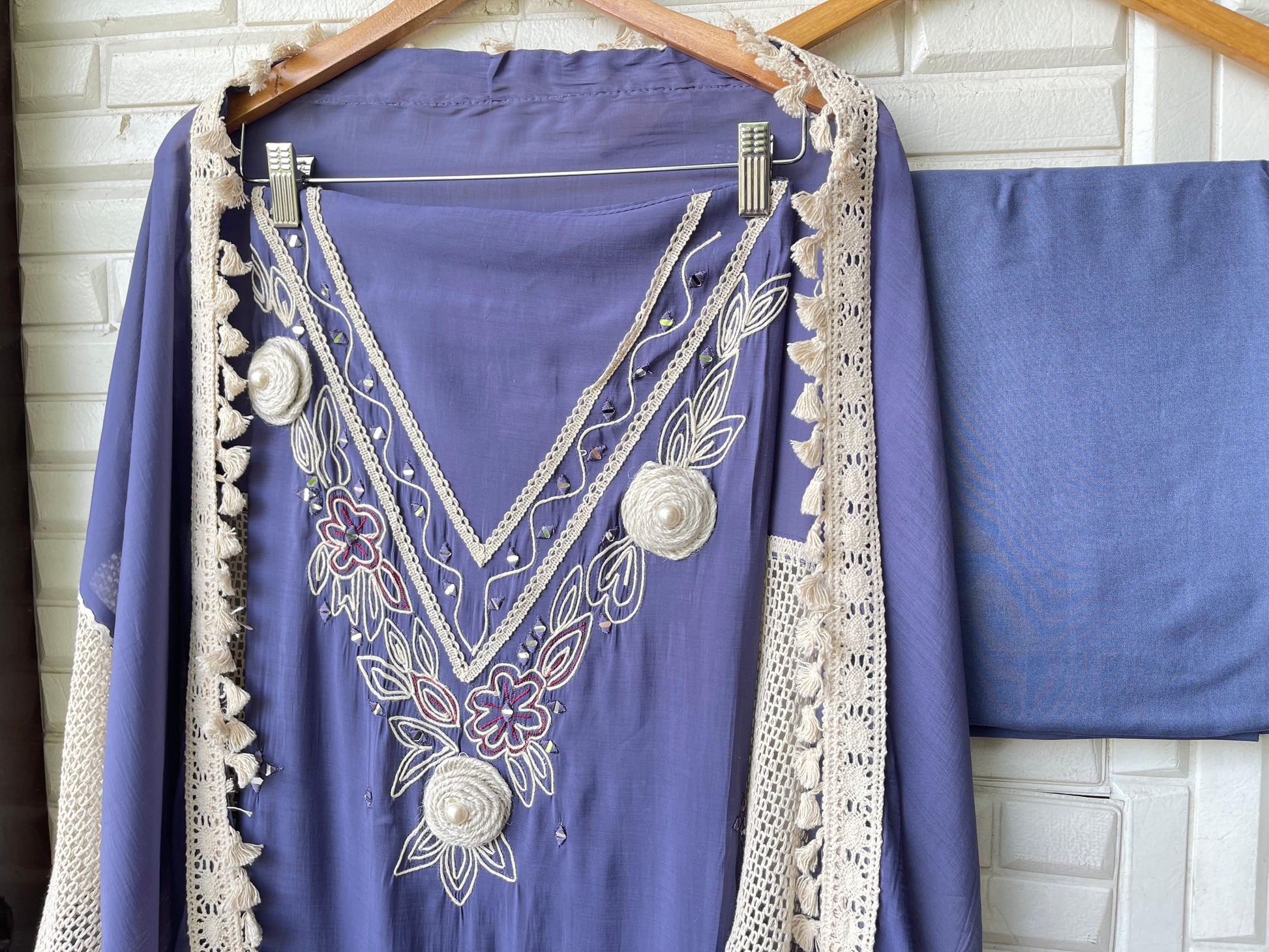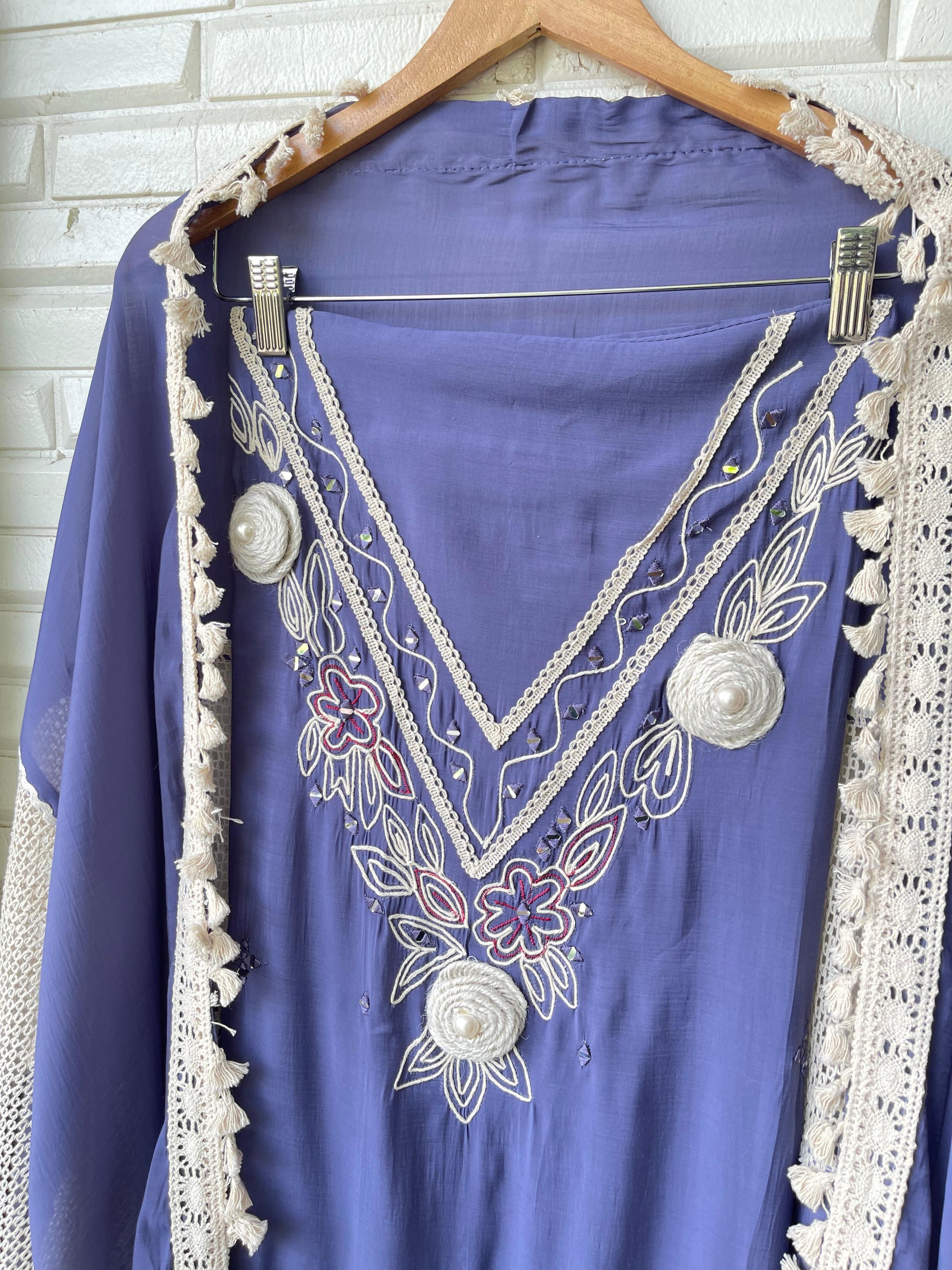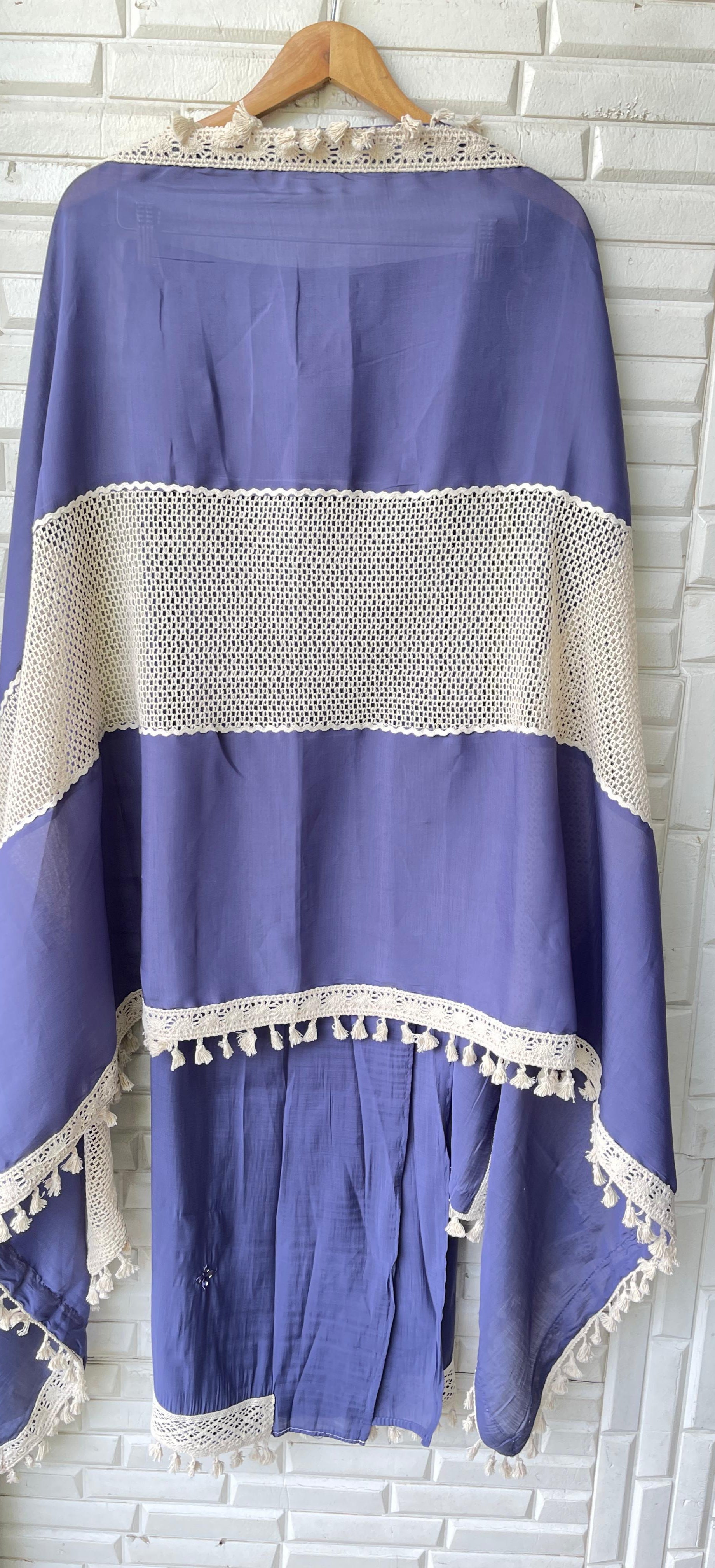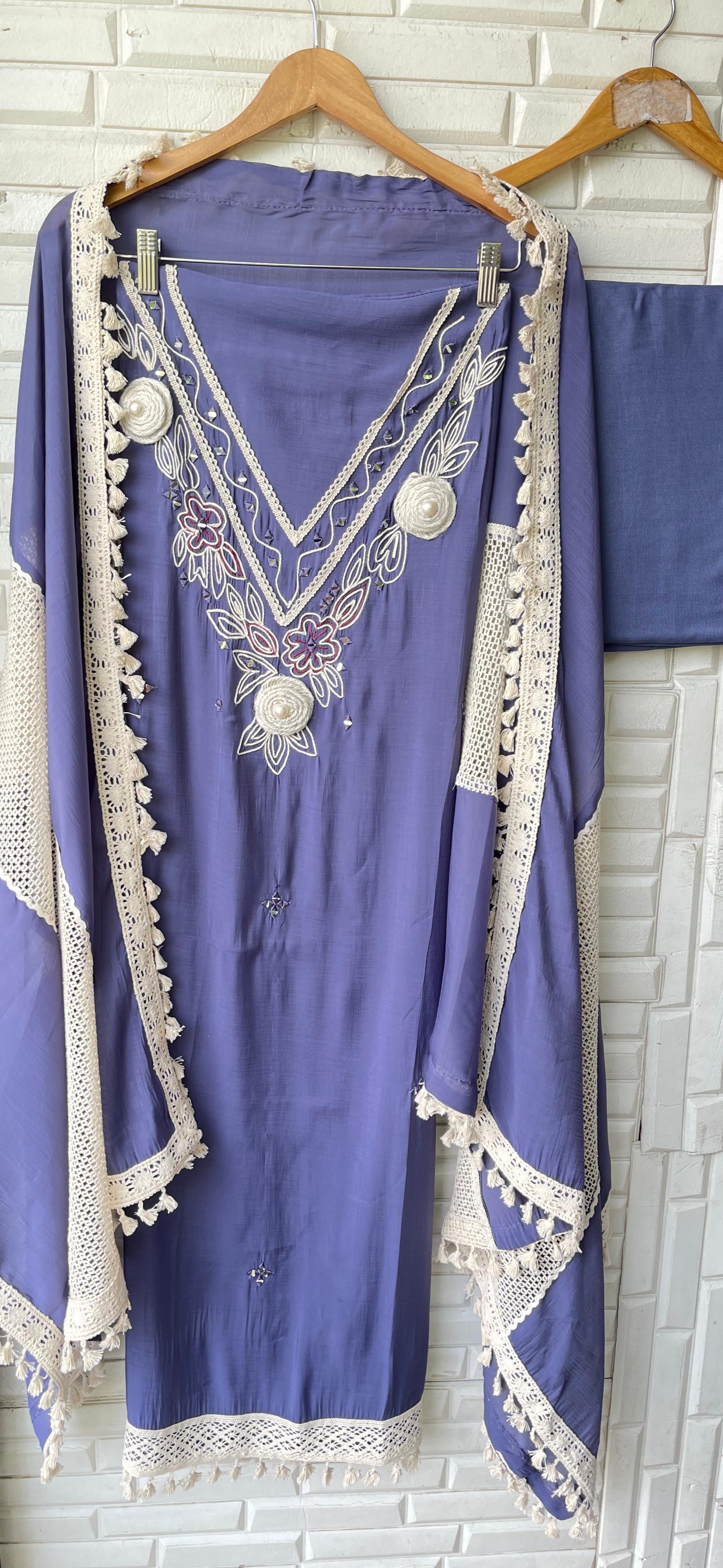 π mul Chanderi fabric unstitched shirt with mirror work resham embroidery and 3D flowers and crotia lace work with pom pom lace