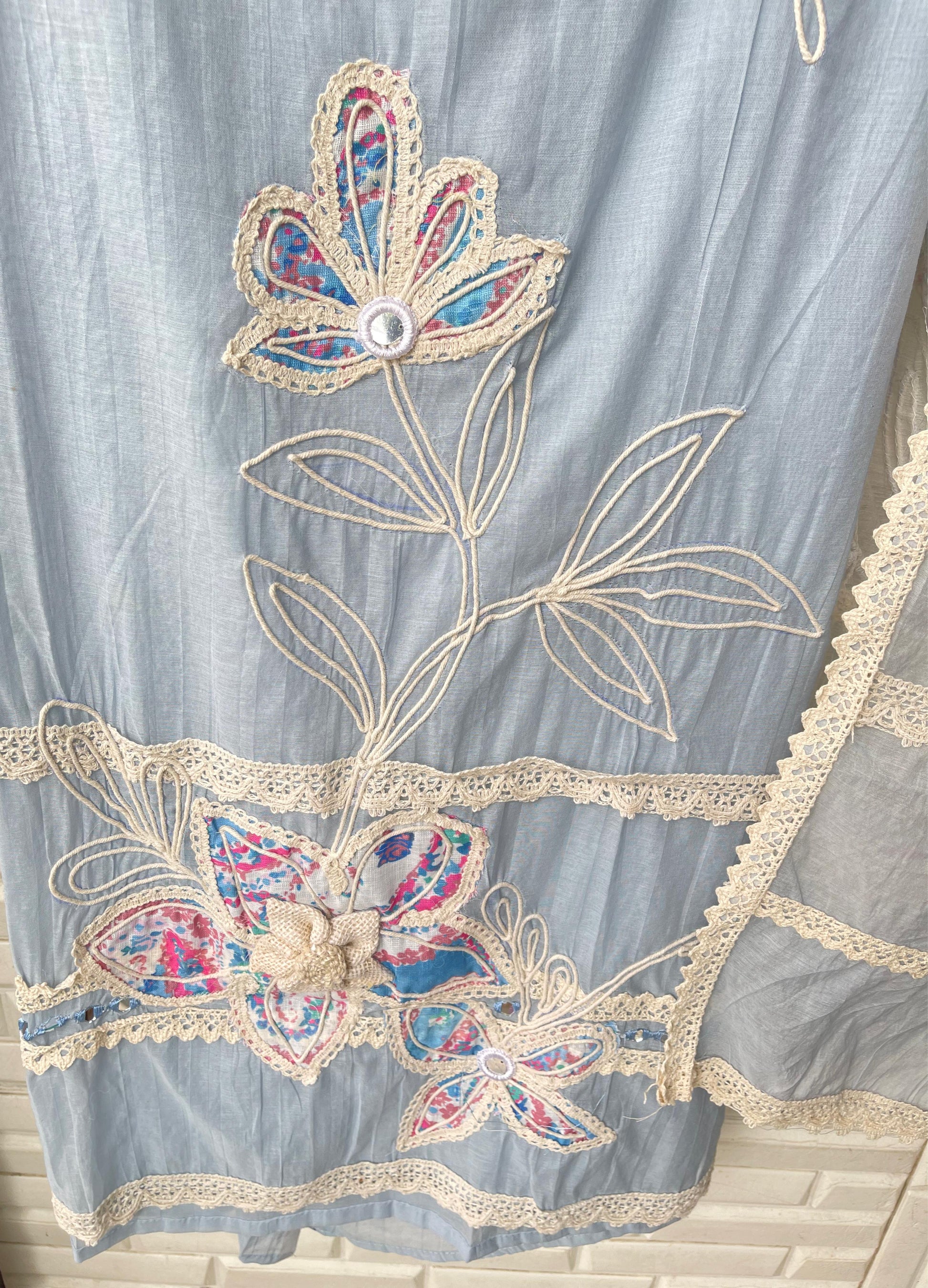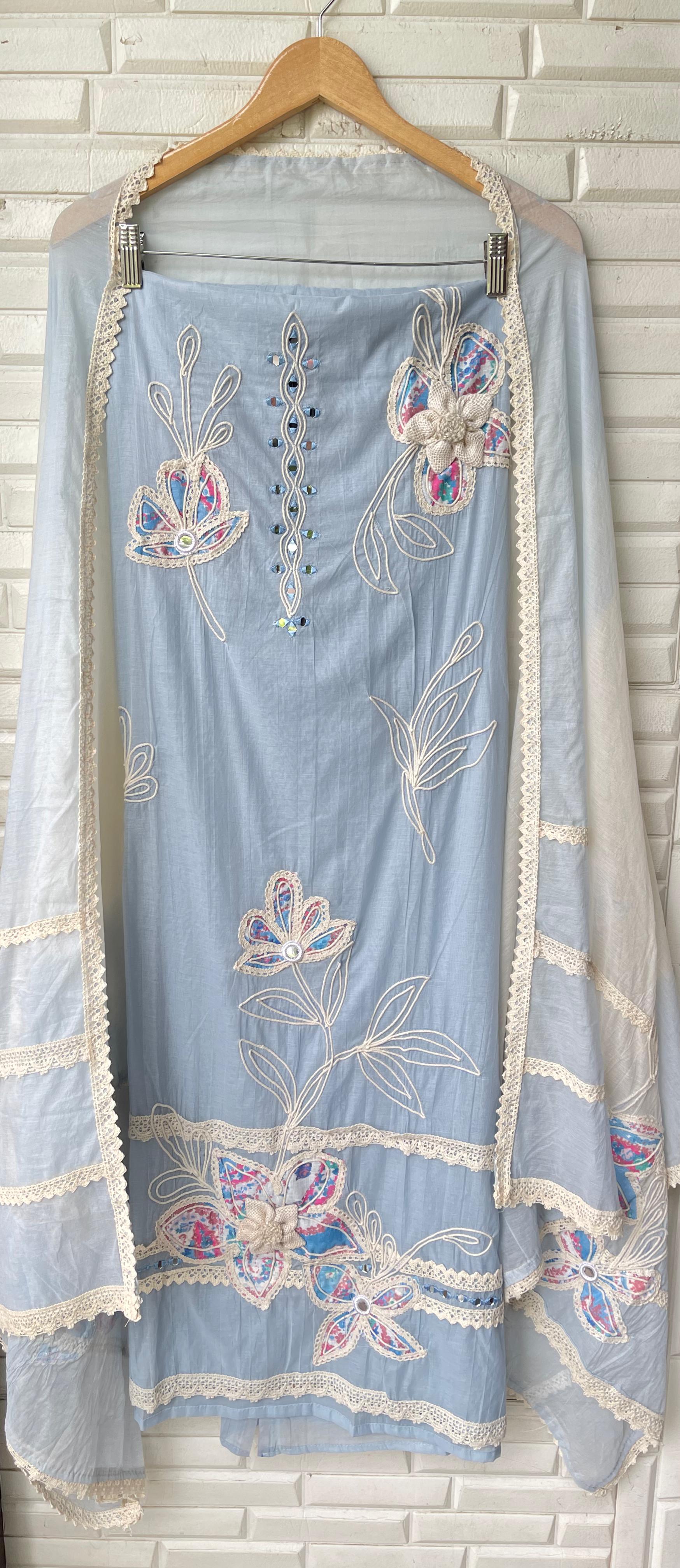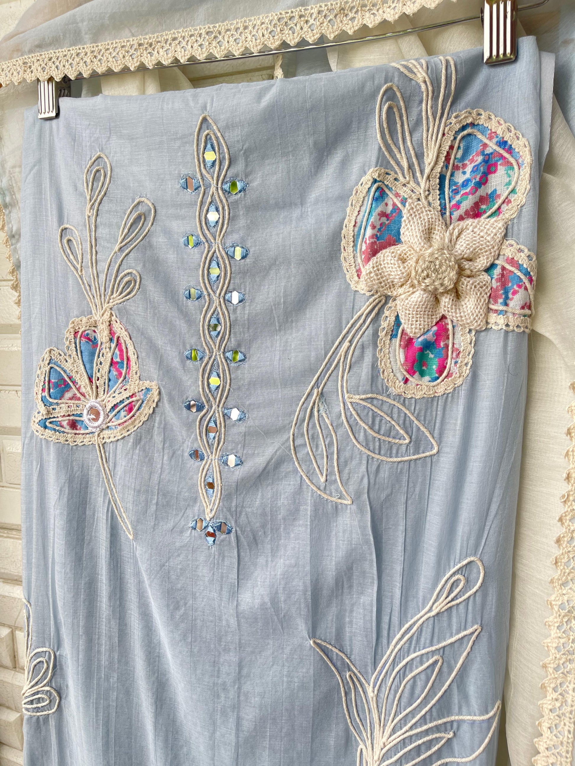 ๐ mul chanderi fabric unstitched shirt with printed patchwork mirror work resham jute embroidery and 3D flowers and crotia lace work