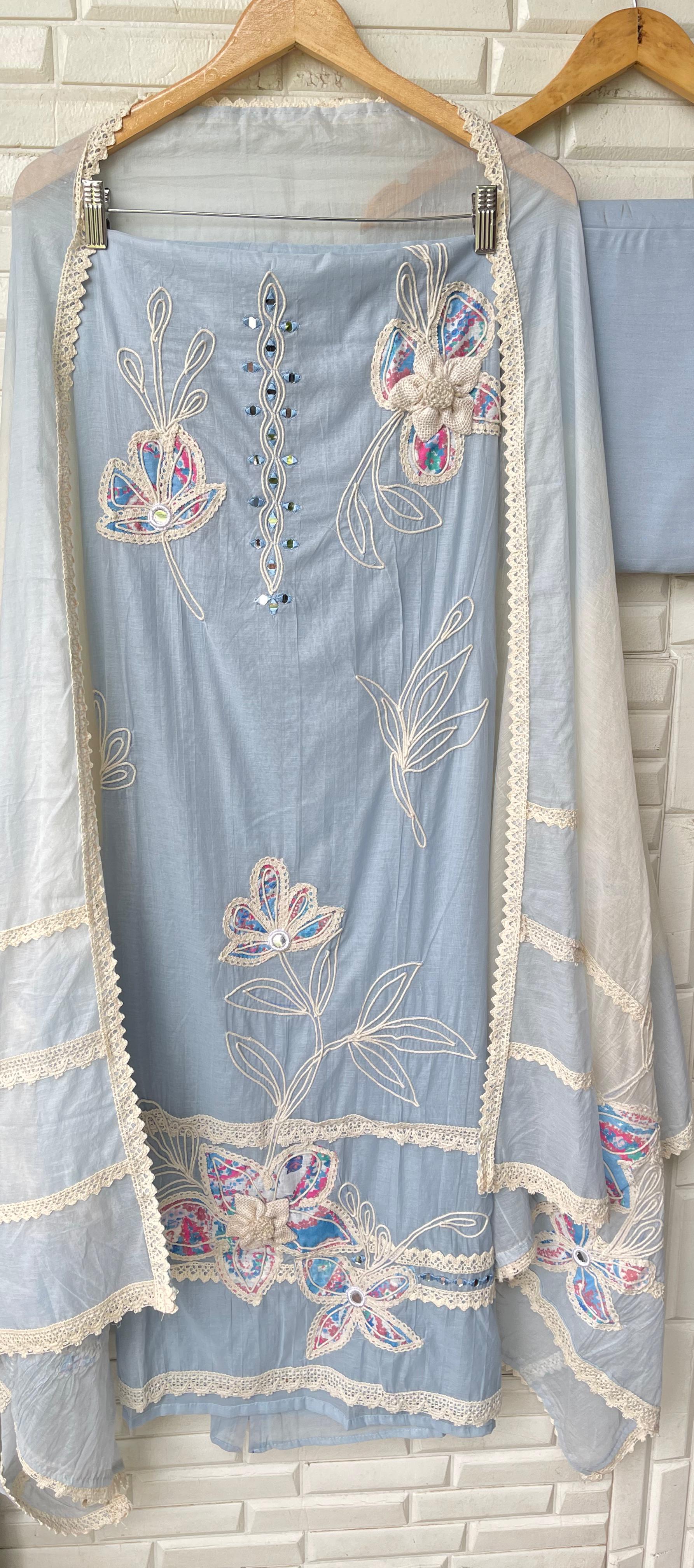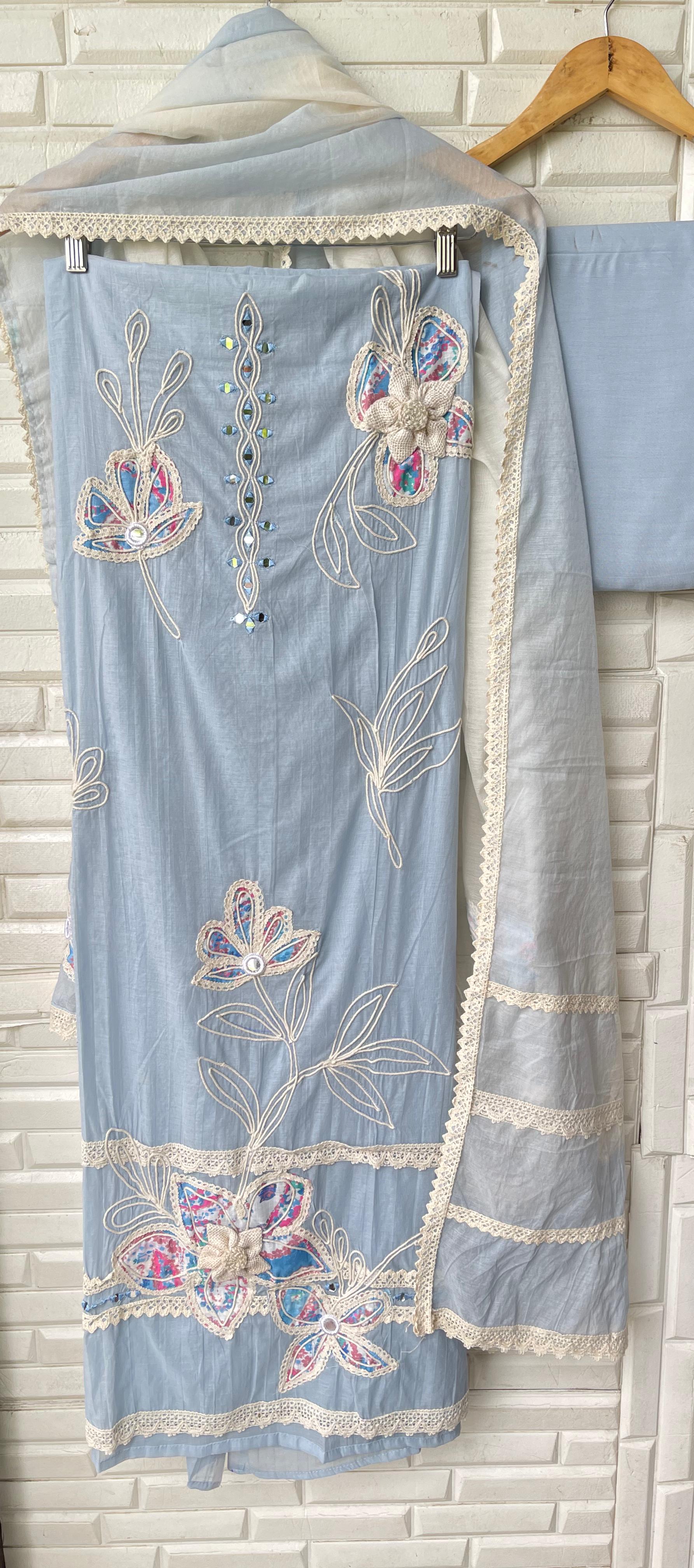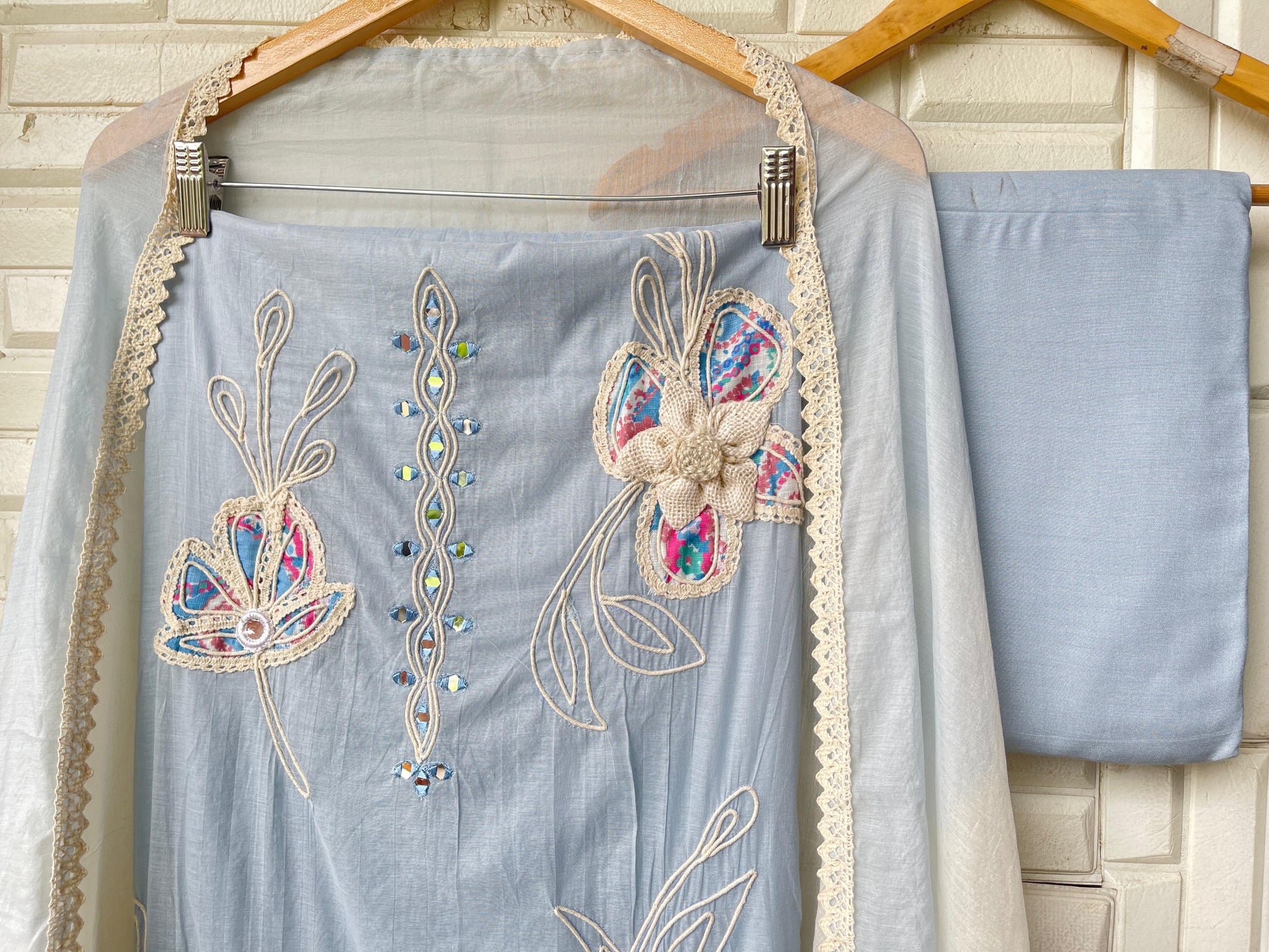 ๐ mul chanderi fabric unstitched shirt with printed patchwork mirror work resham jute embroidery and 3D flowers and crotia lace work