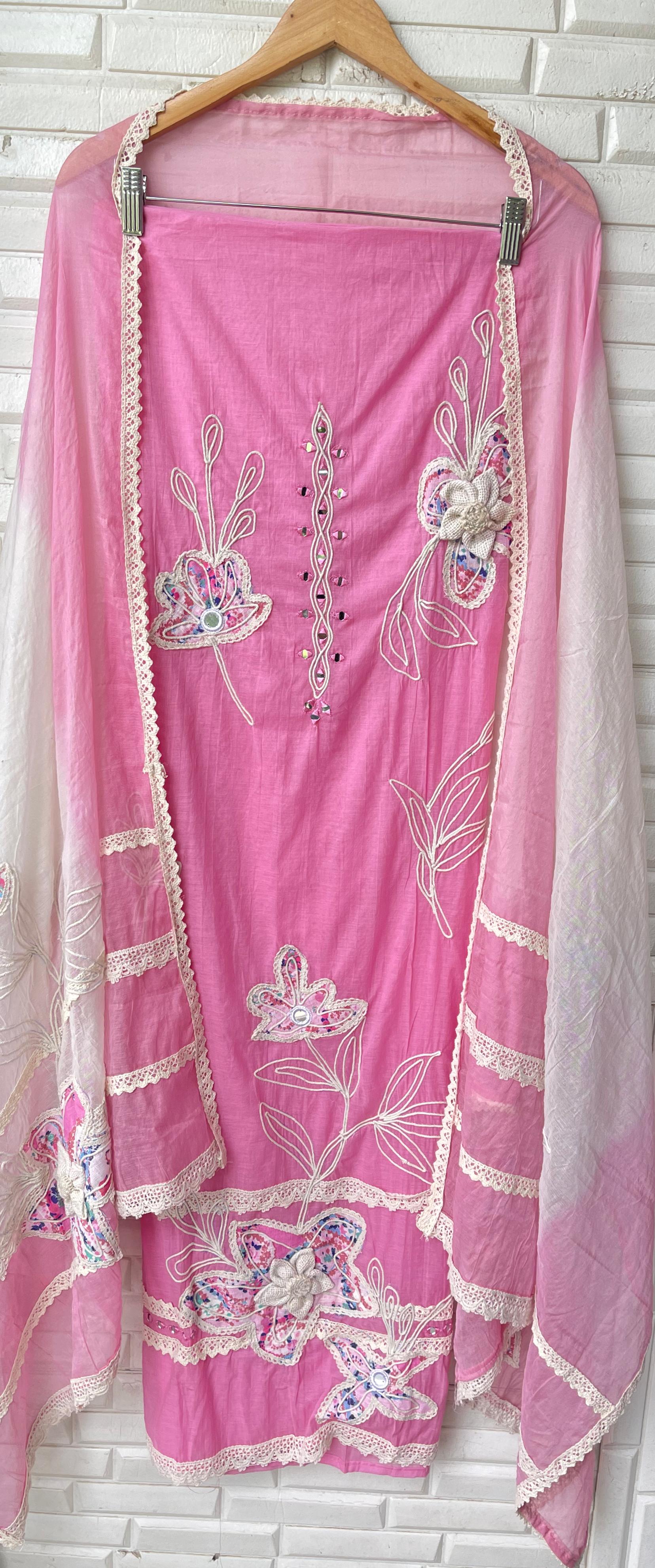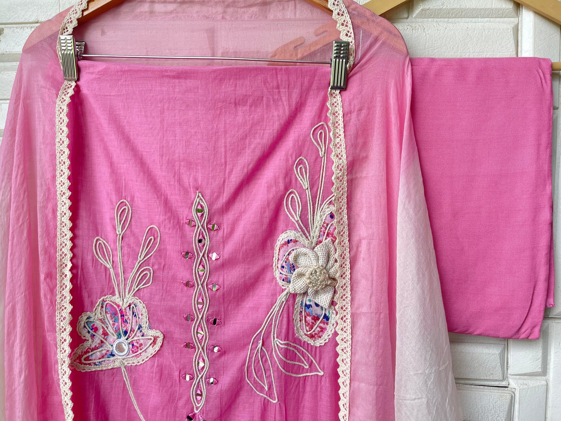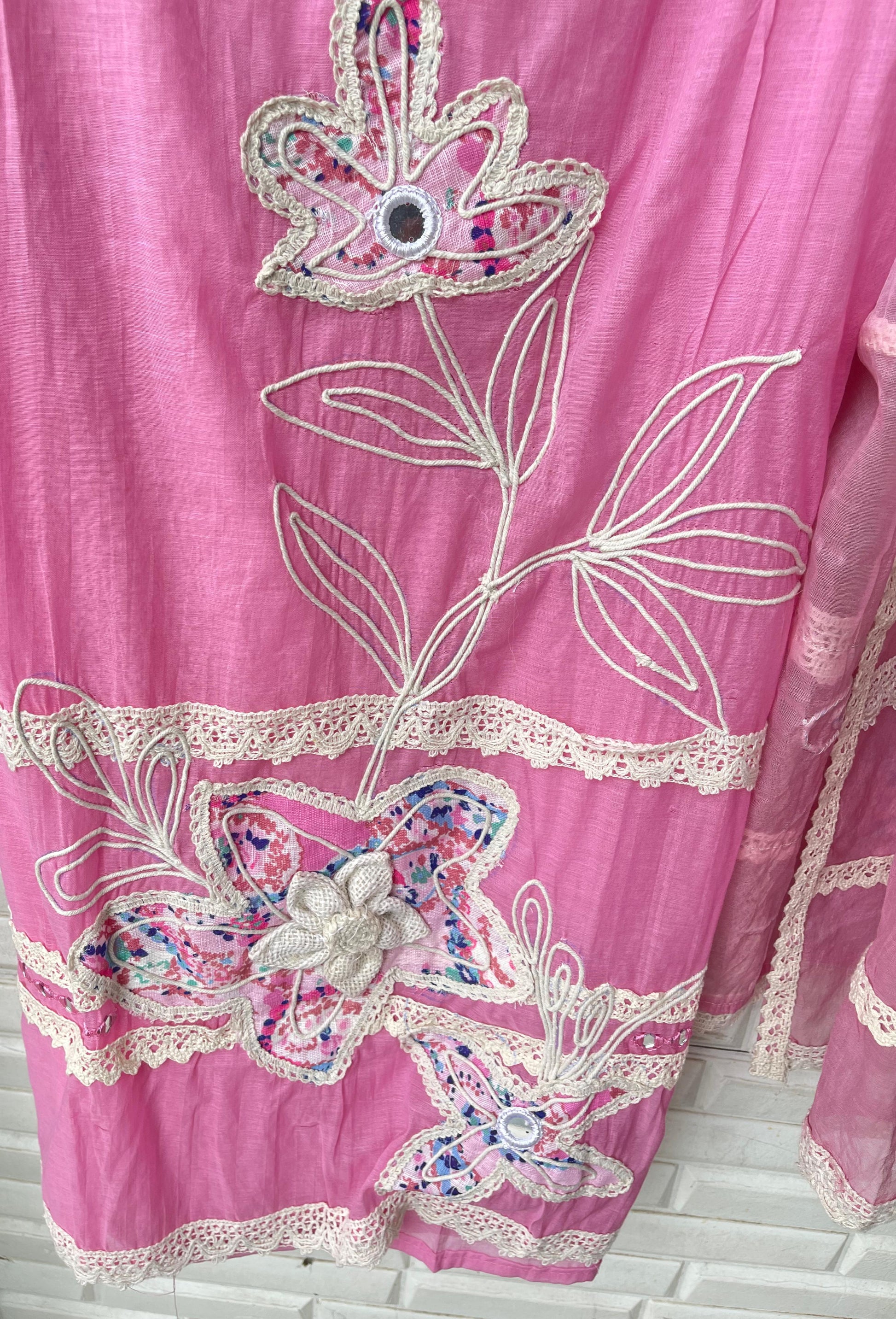 ๐ mul chanderi fabric unstitched shirt with printed patchwork mirror work resham jute embroidery and 3D flowers and crotia lace work