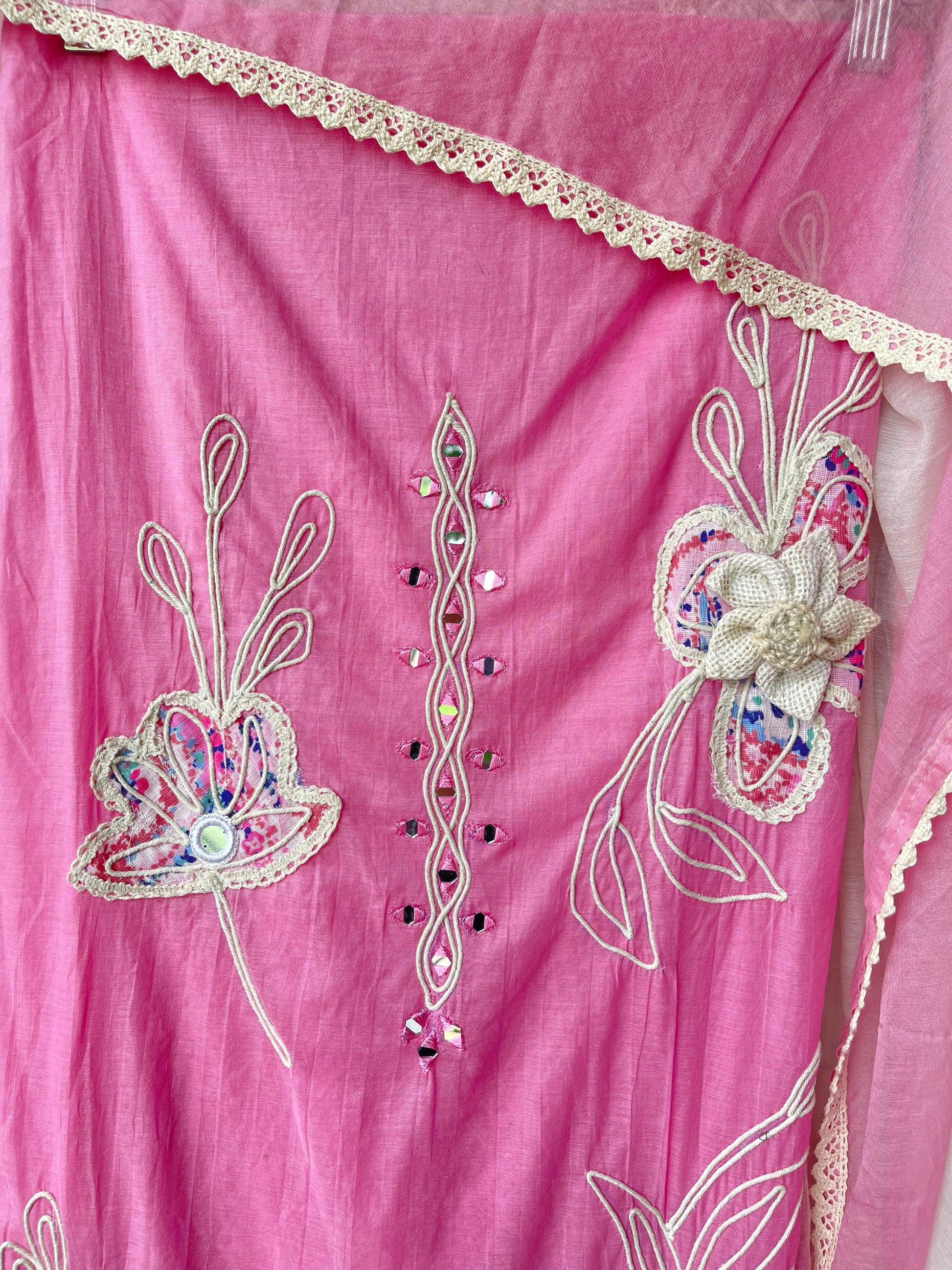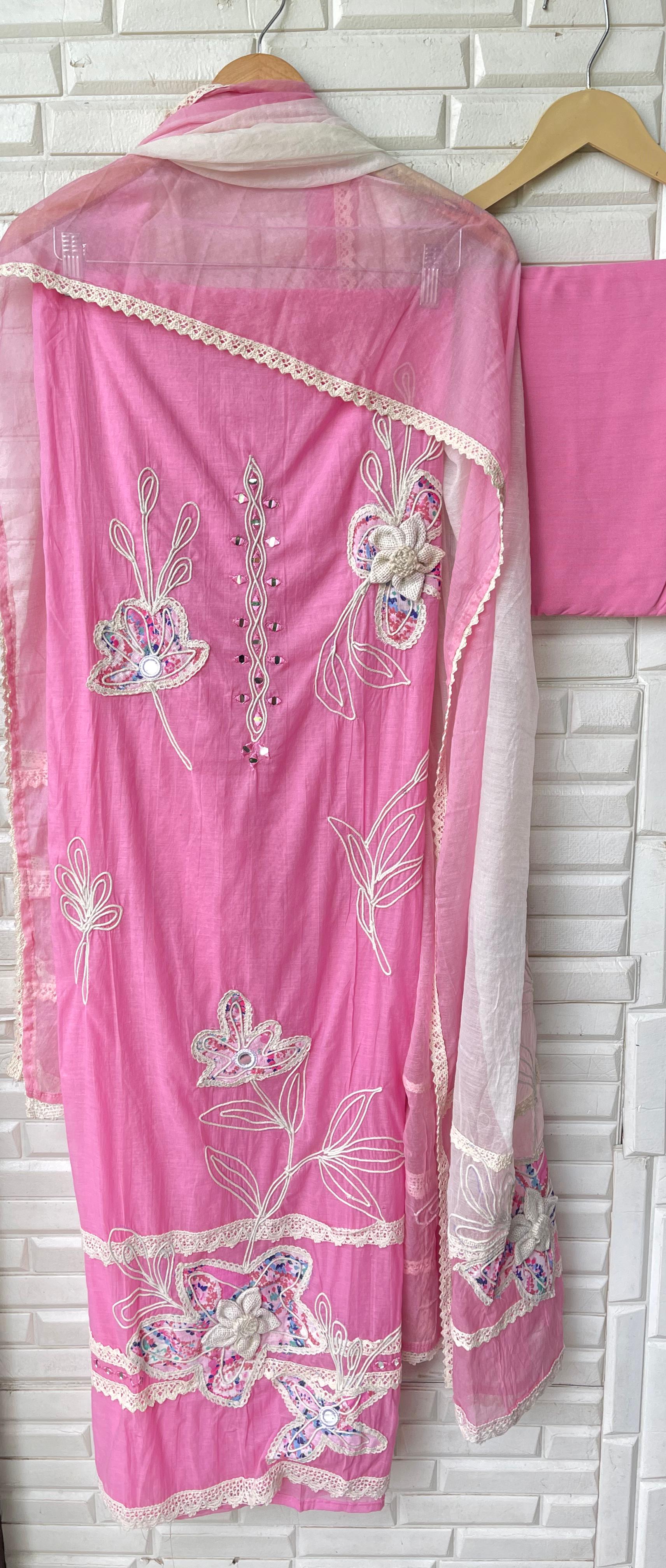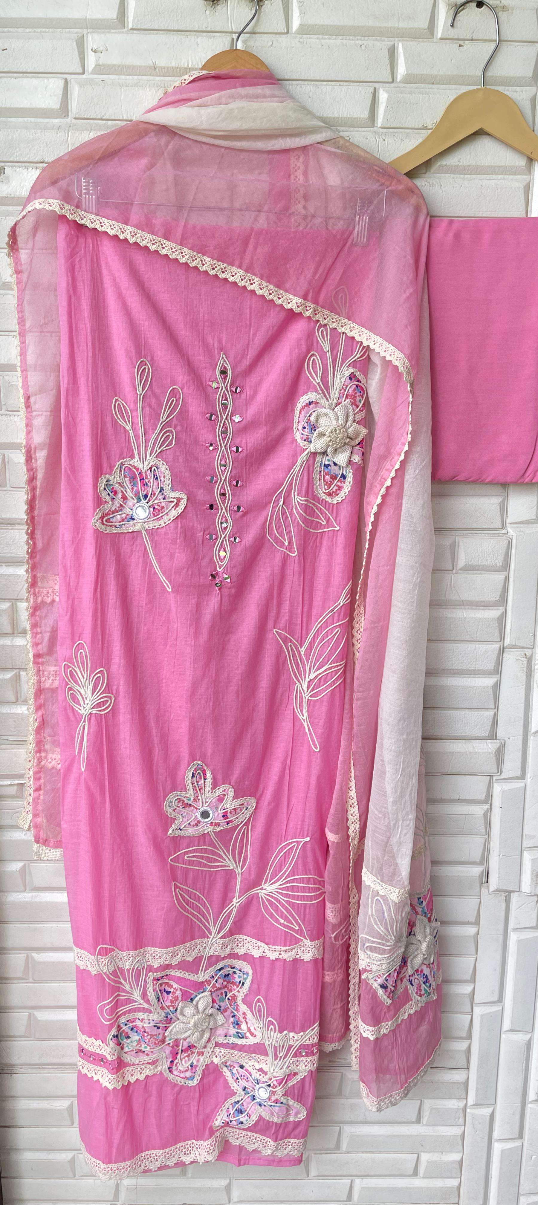๐ mul chanderi fabric unstitched shirt with printed patchwork mirror work resham jute embroidery and 3D flowers and crotia lace work