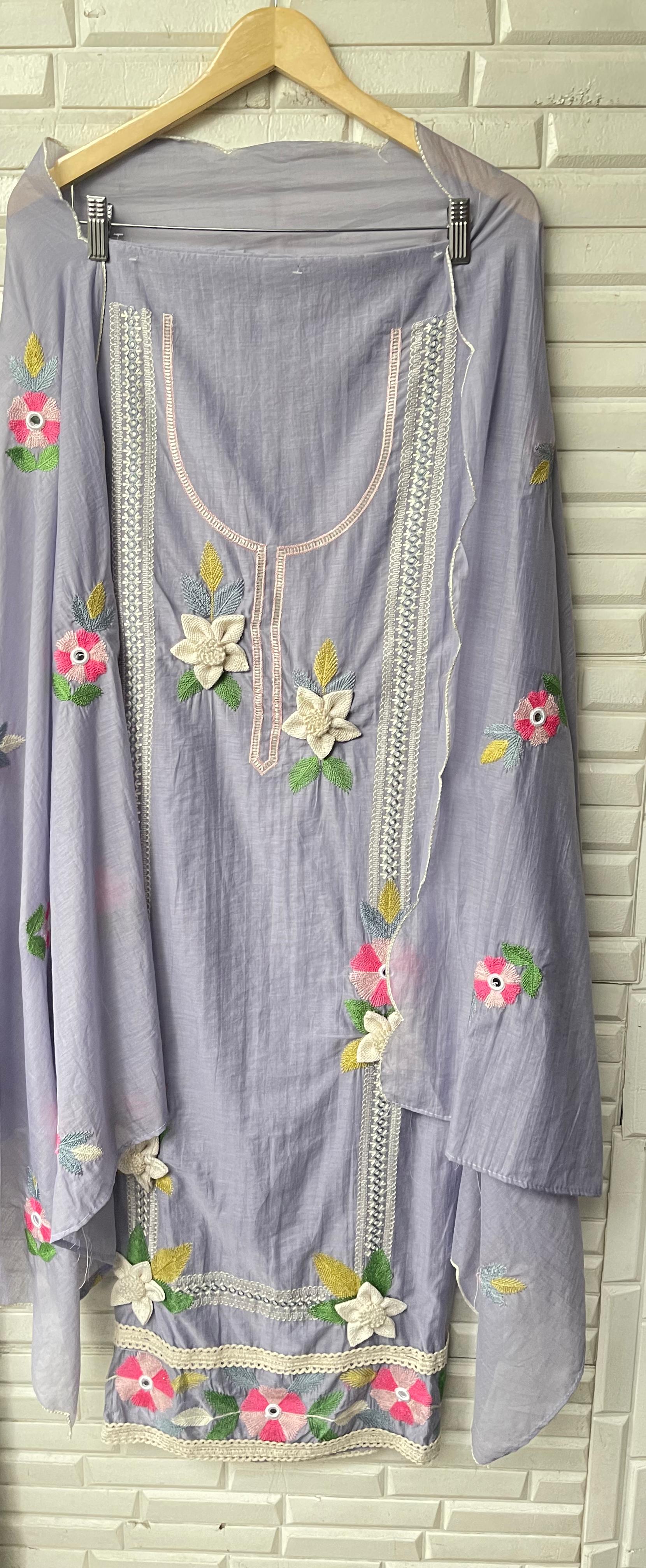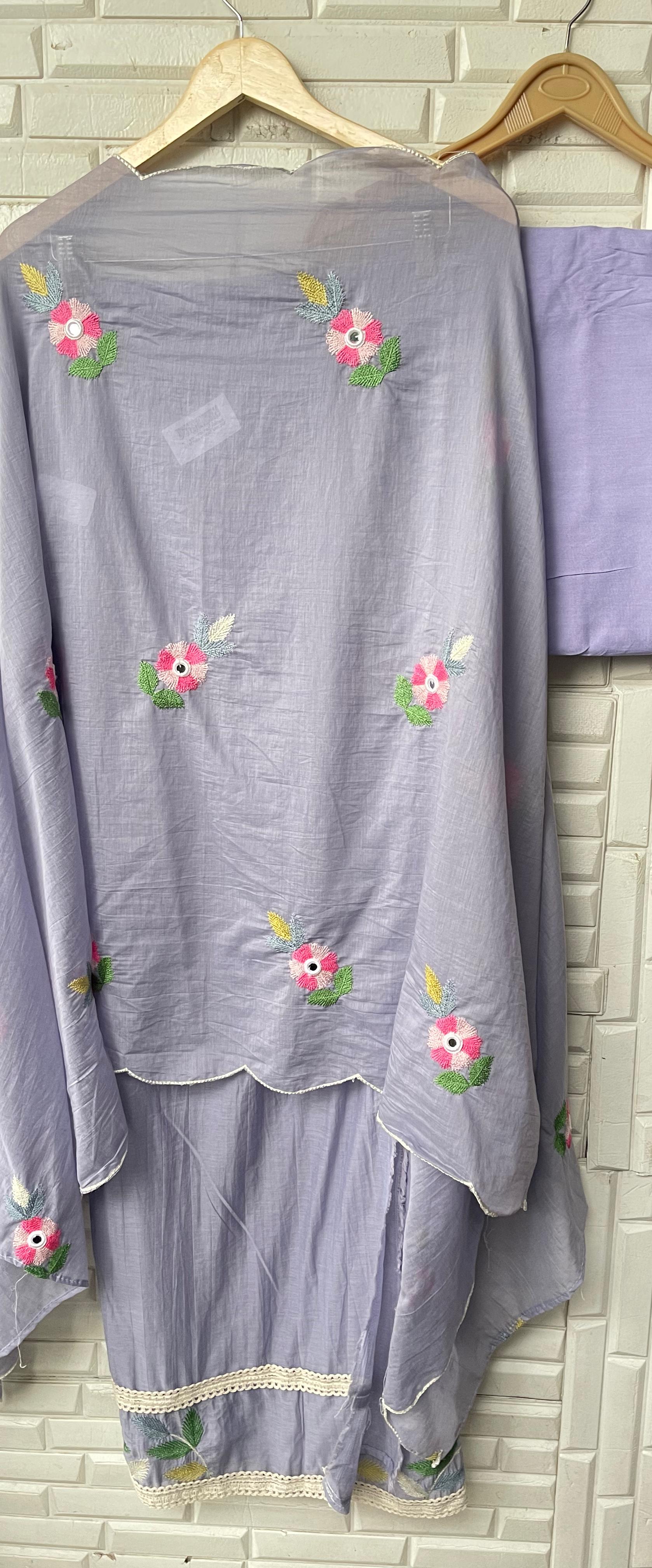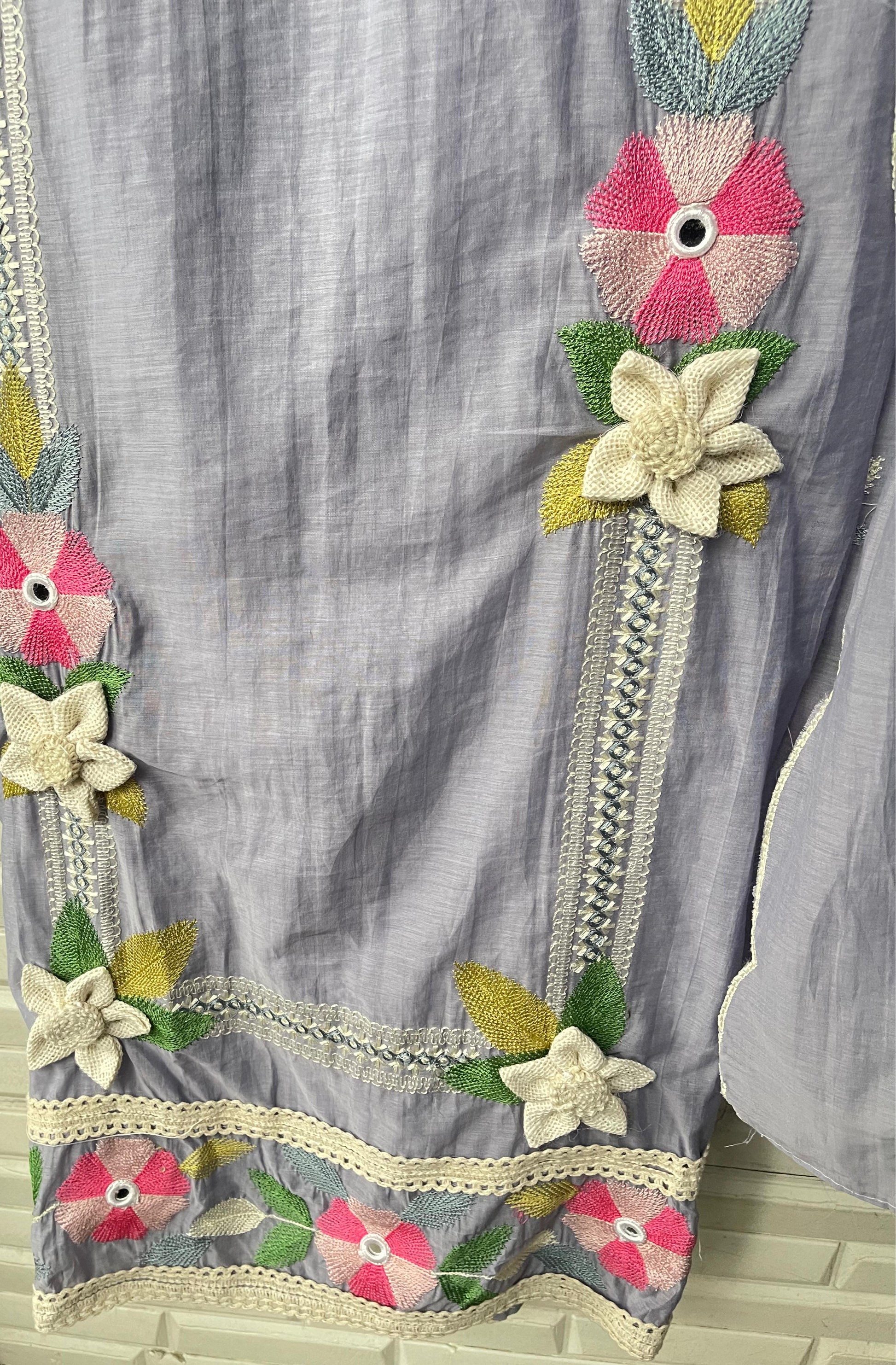 😊 mul chanderi fabric unstitched shirt with 3D flowers resham embroidery and crotia lace work and insertions