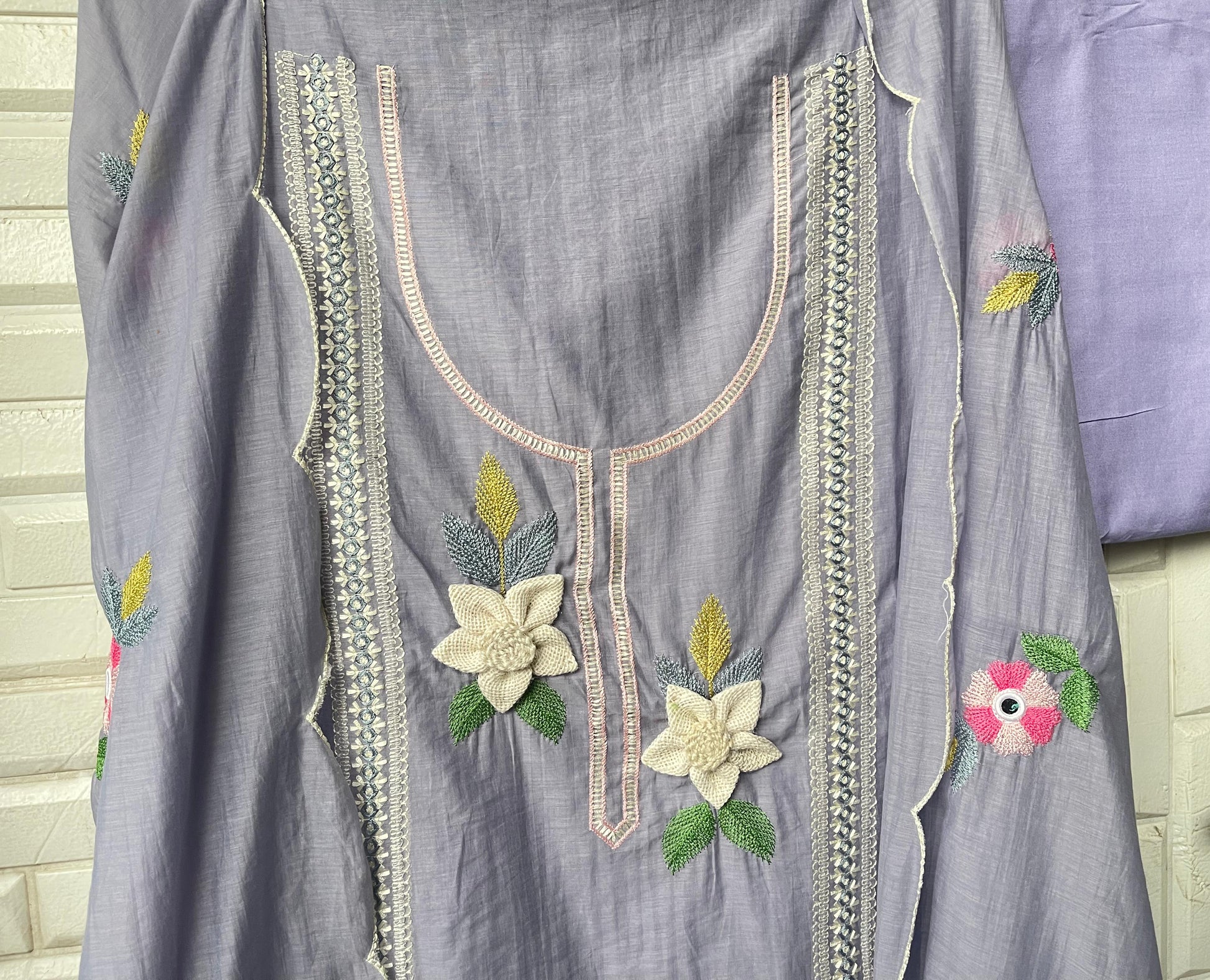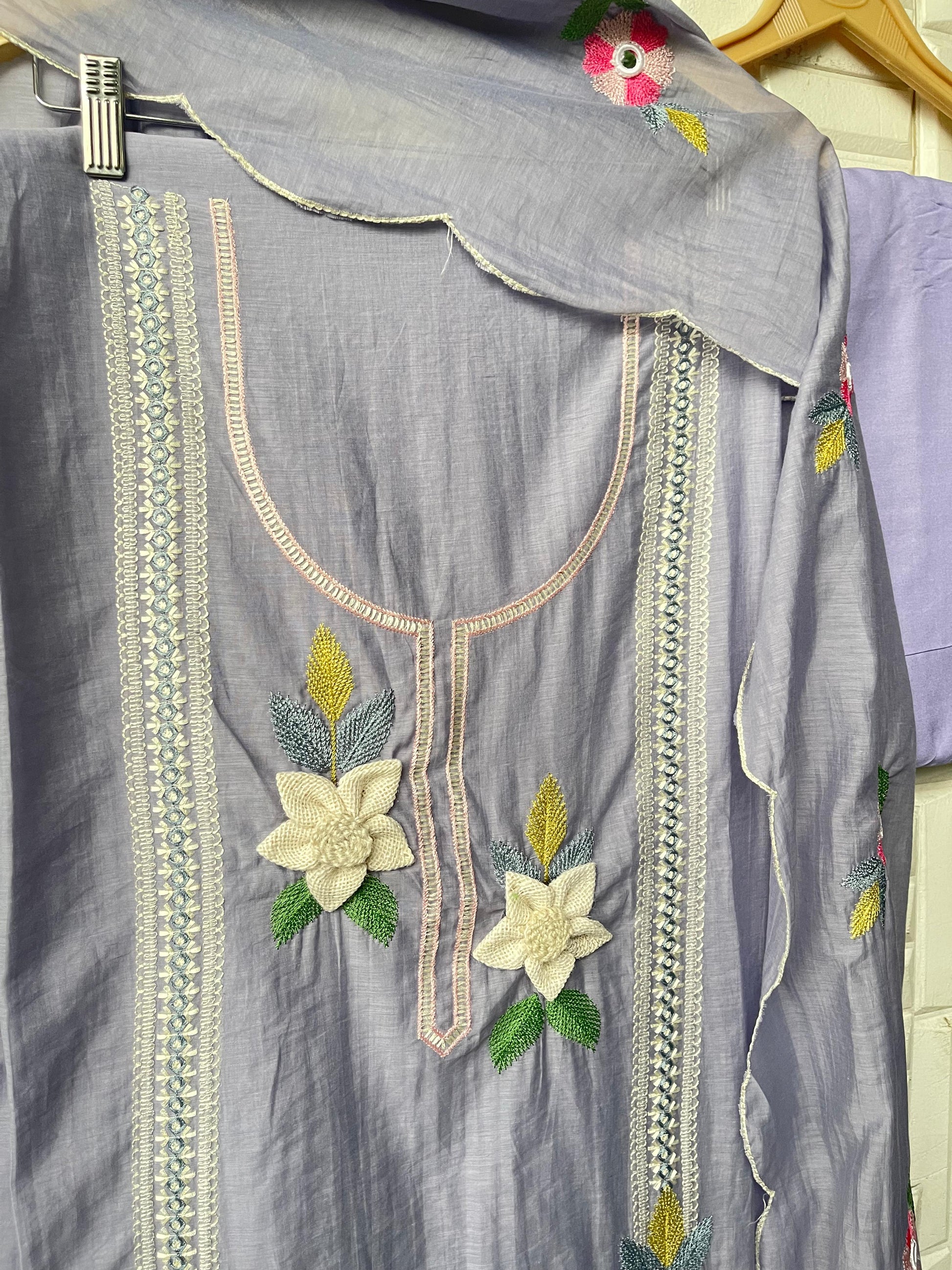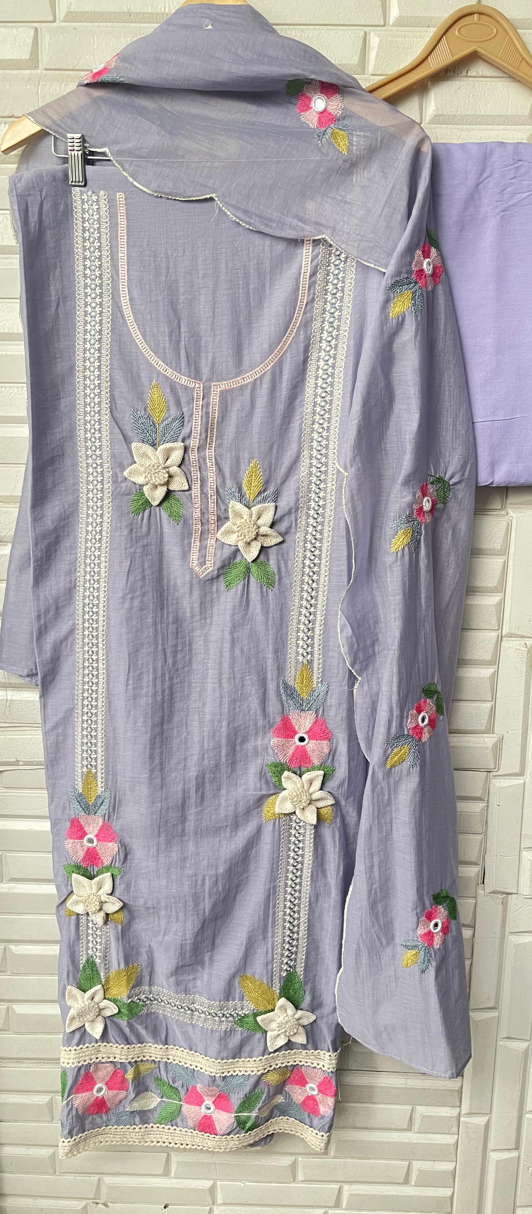 😊 mul chanderi fabric unstitched shirt with 3D flowers resham embroidery and crotia lace work and insertions