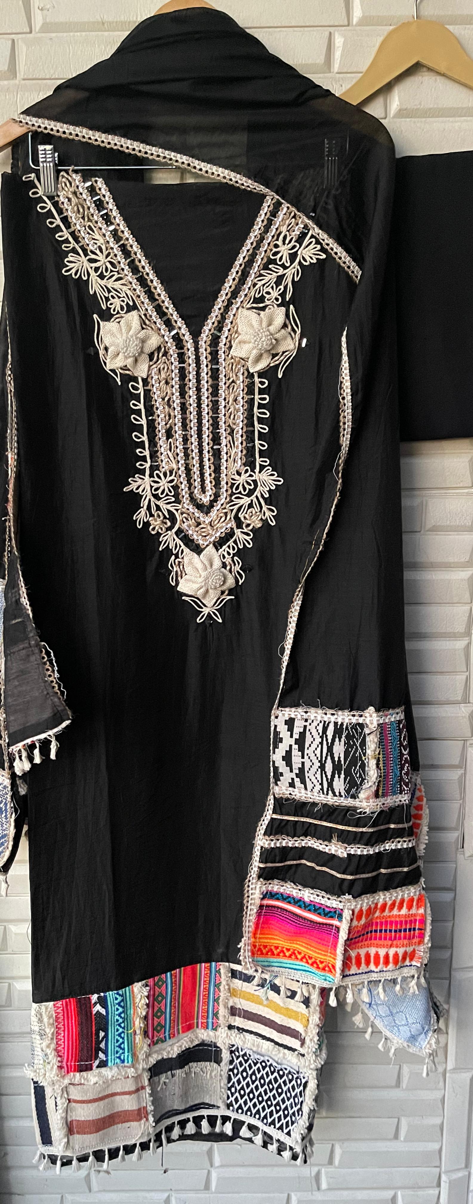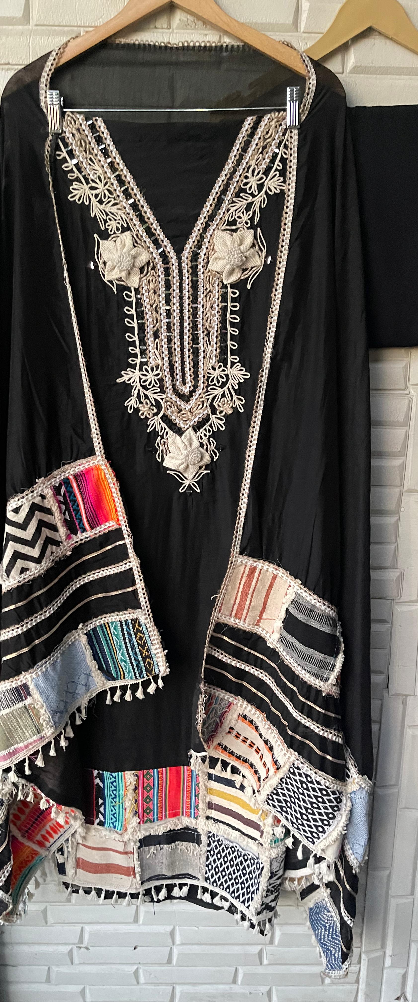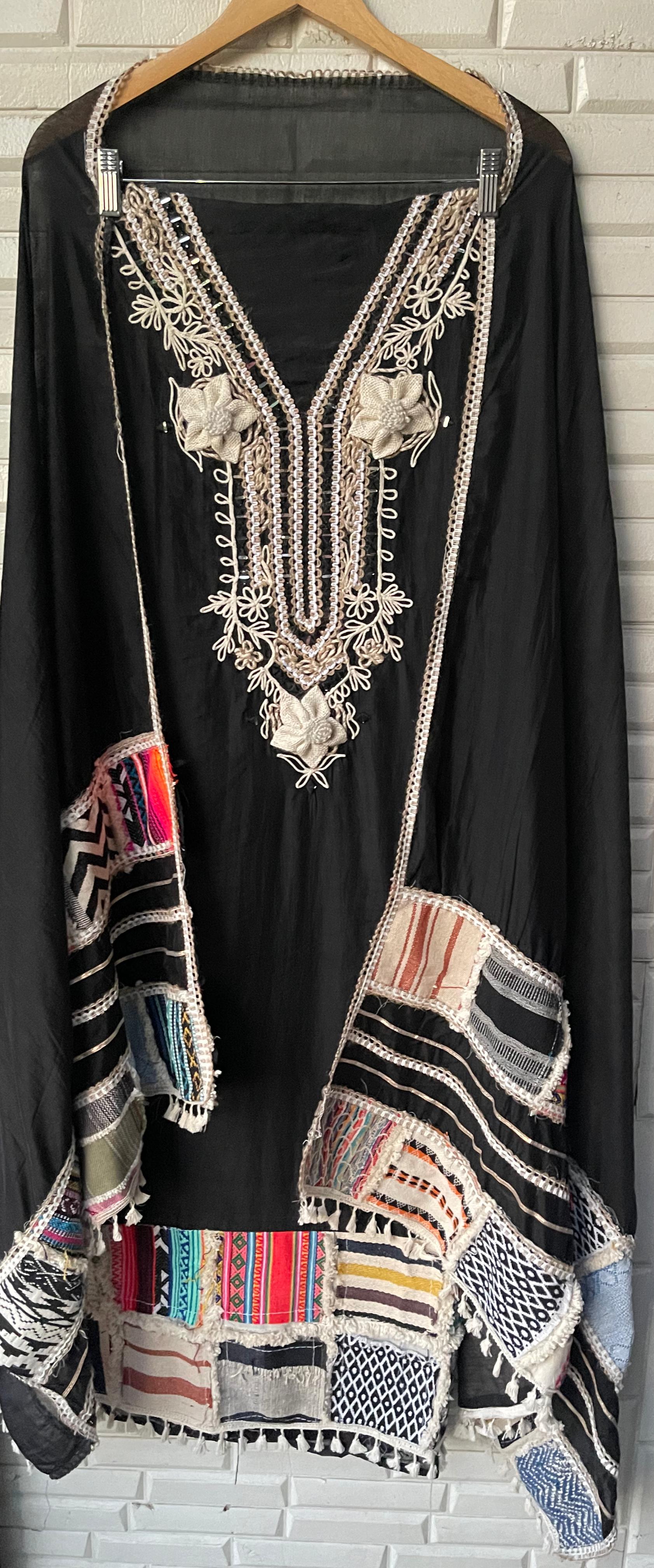 π mul Chanderi unstitched shirt with boho inspired box patchwork and jute resham knots mirror work embroidery and 3D flowers