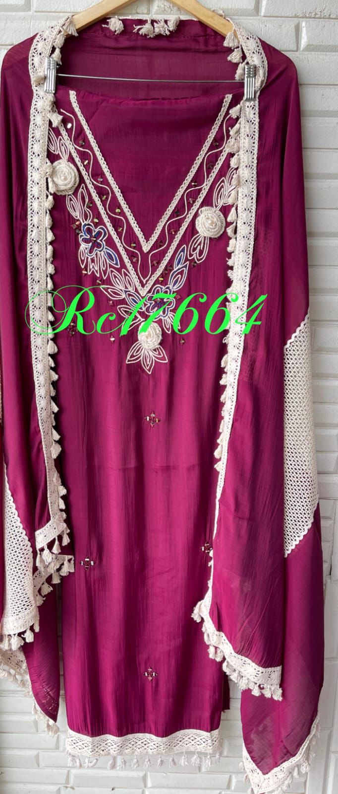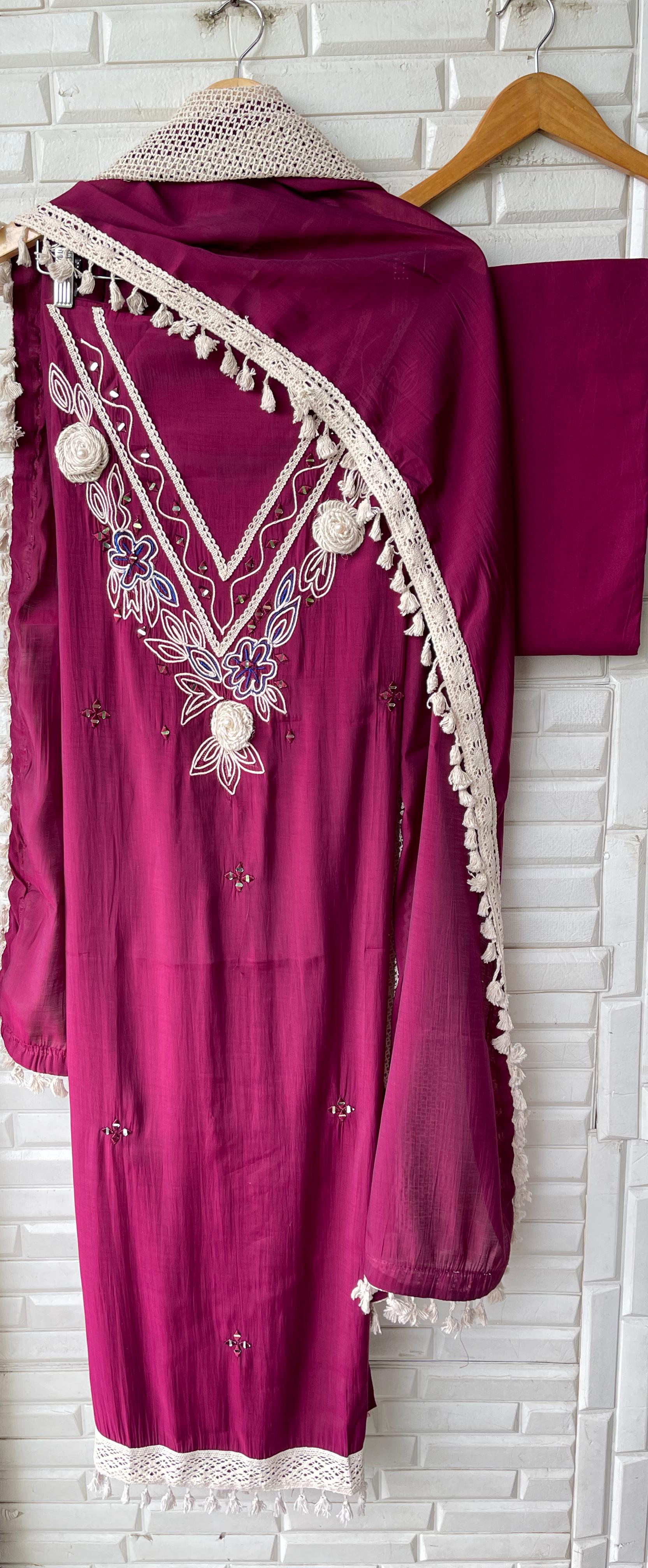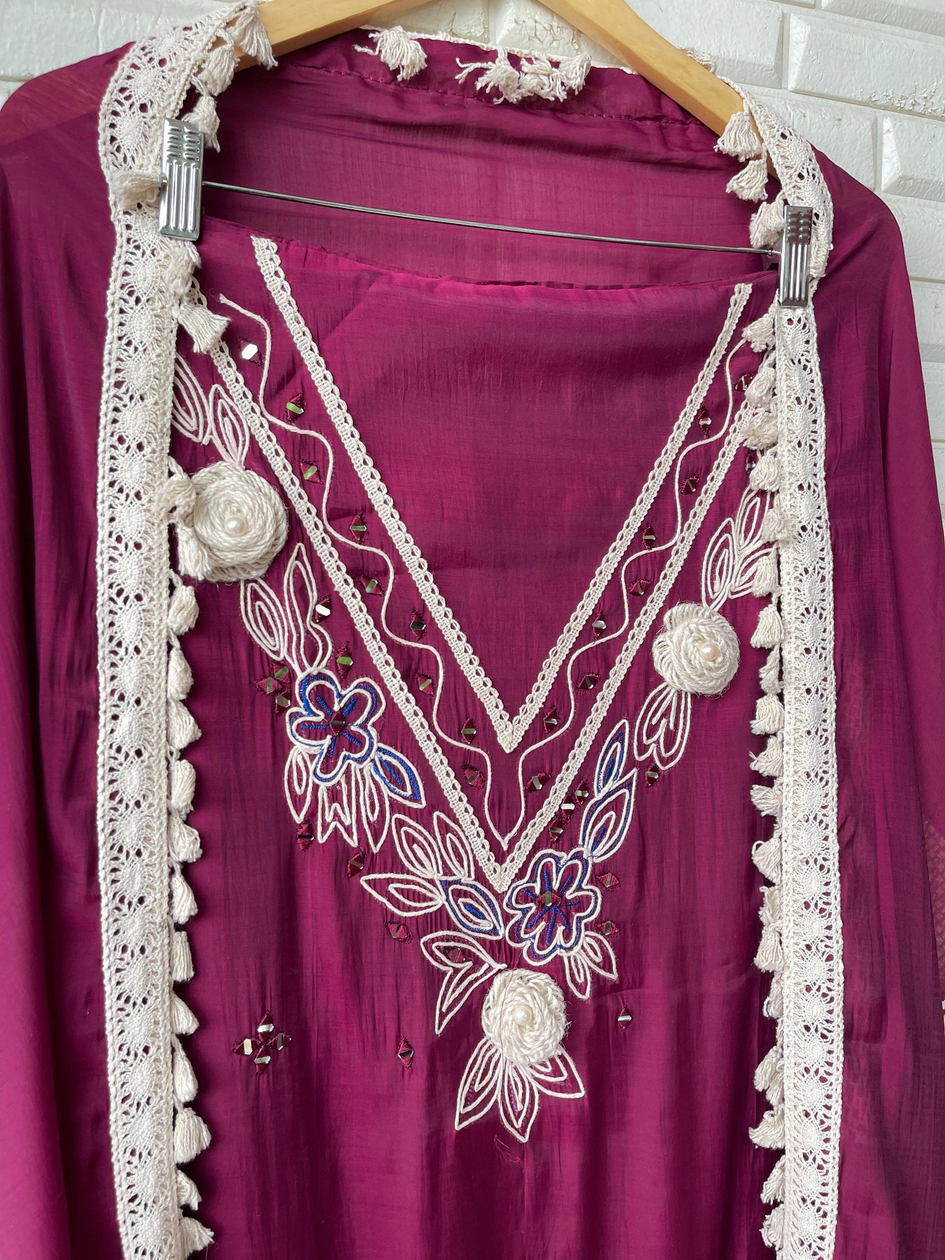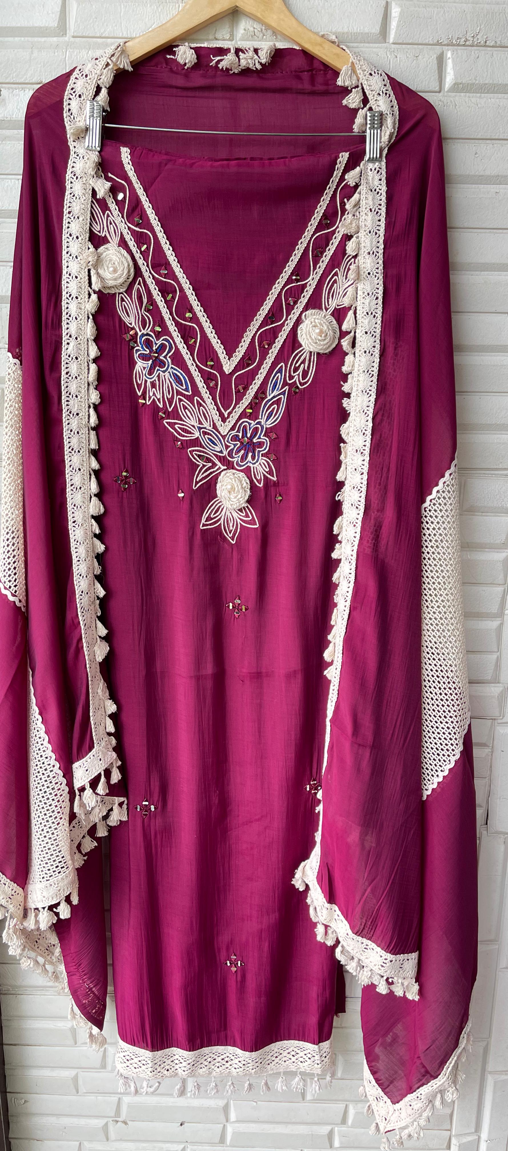 π mul chanderi fabric unstitched shirt with mirror pearl work resham embroidery 3D flowers and pom pom ghera lace