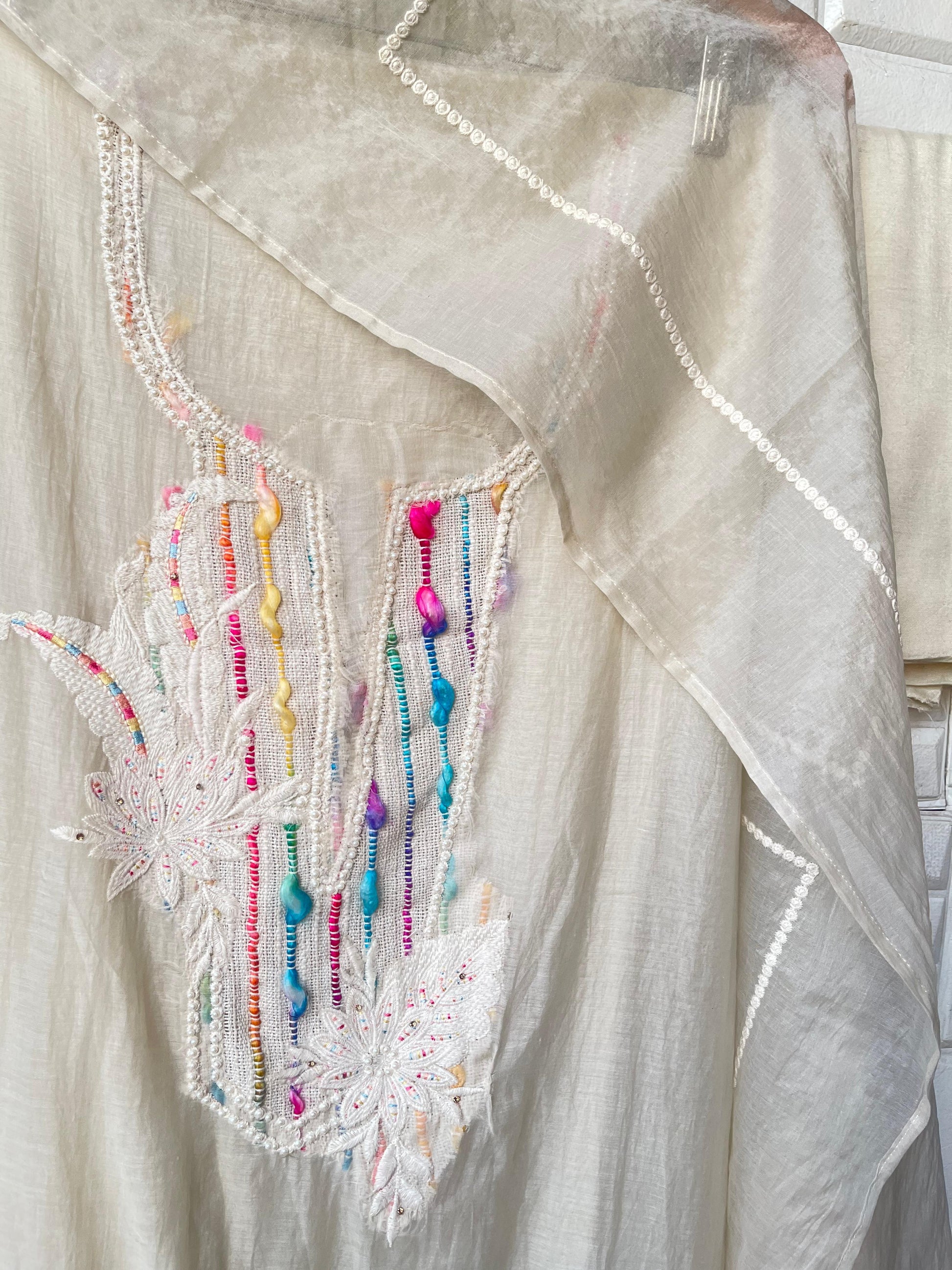 π mul chanderi fabric unstitched shirt with jute embroidery on neck and ghera with crotia and pearl swarowski resham embroidery highlighting