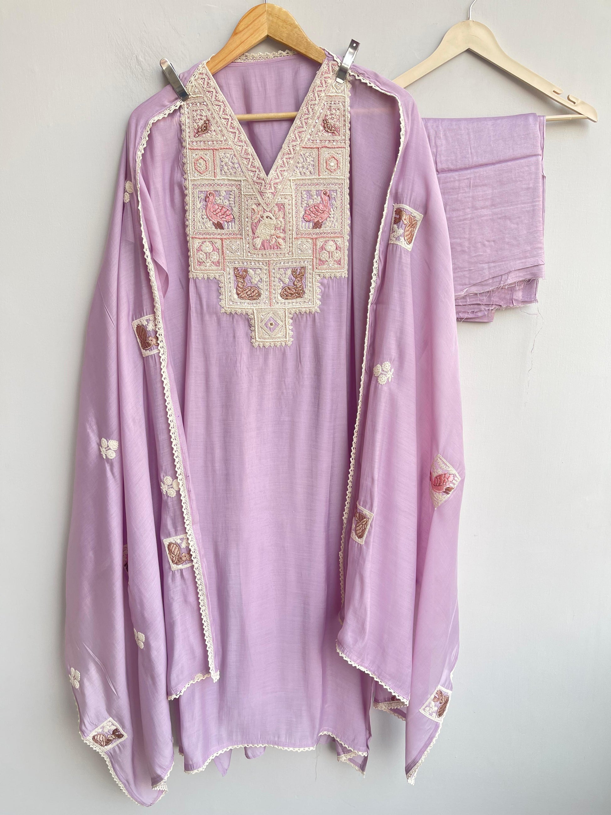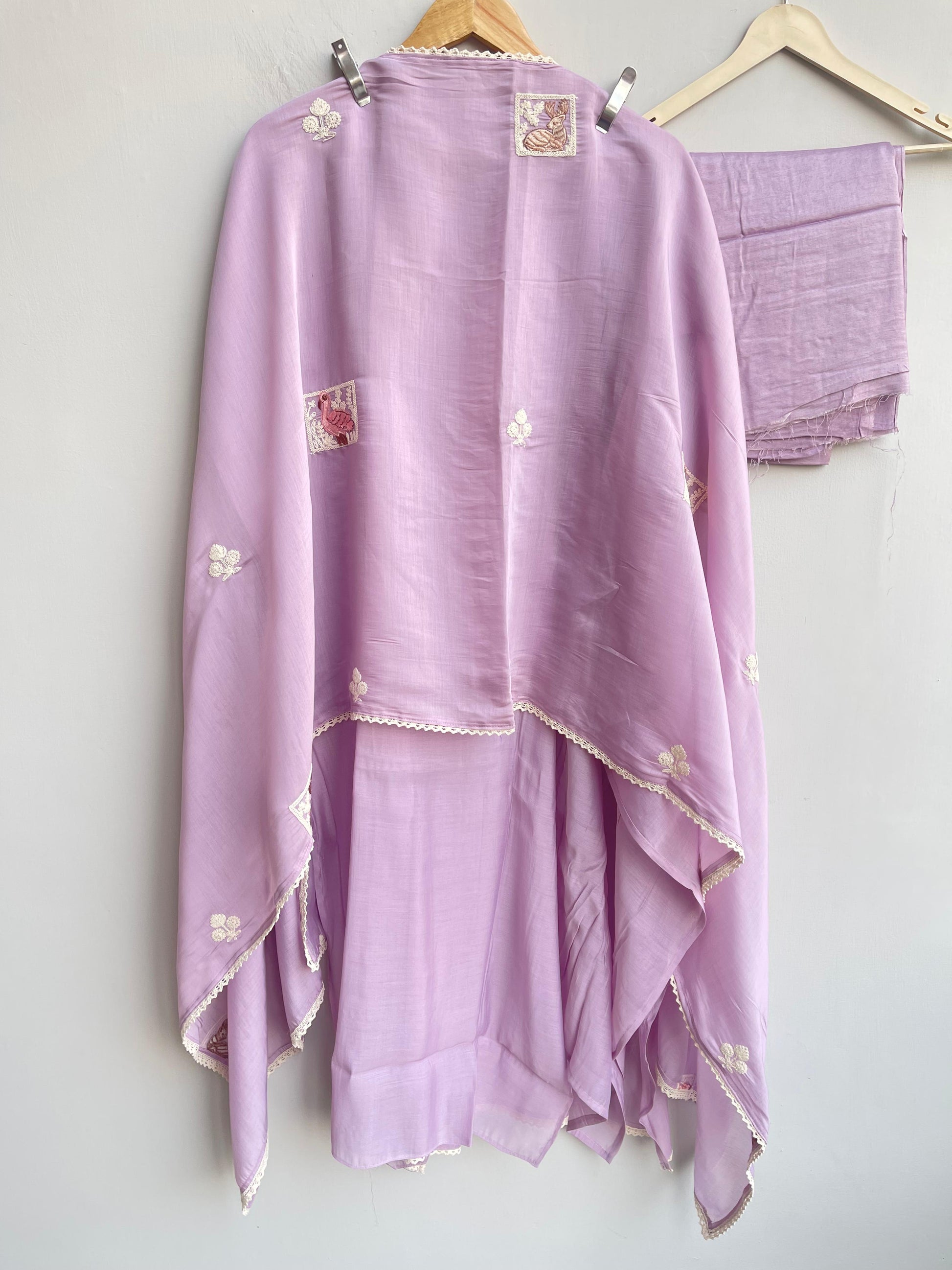π mul chanderi fabric unstitched shirt with sequins Resham Dori Moti embroidery and crotia ghera lace