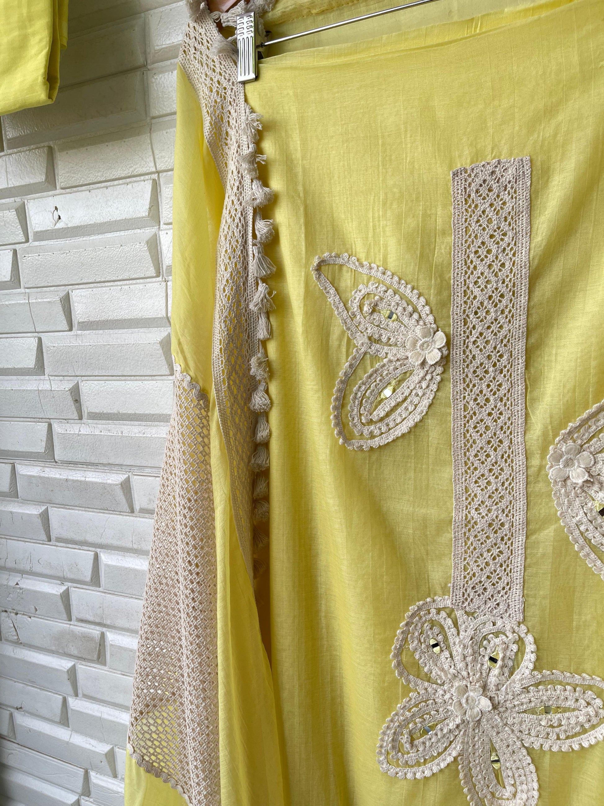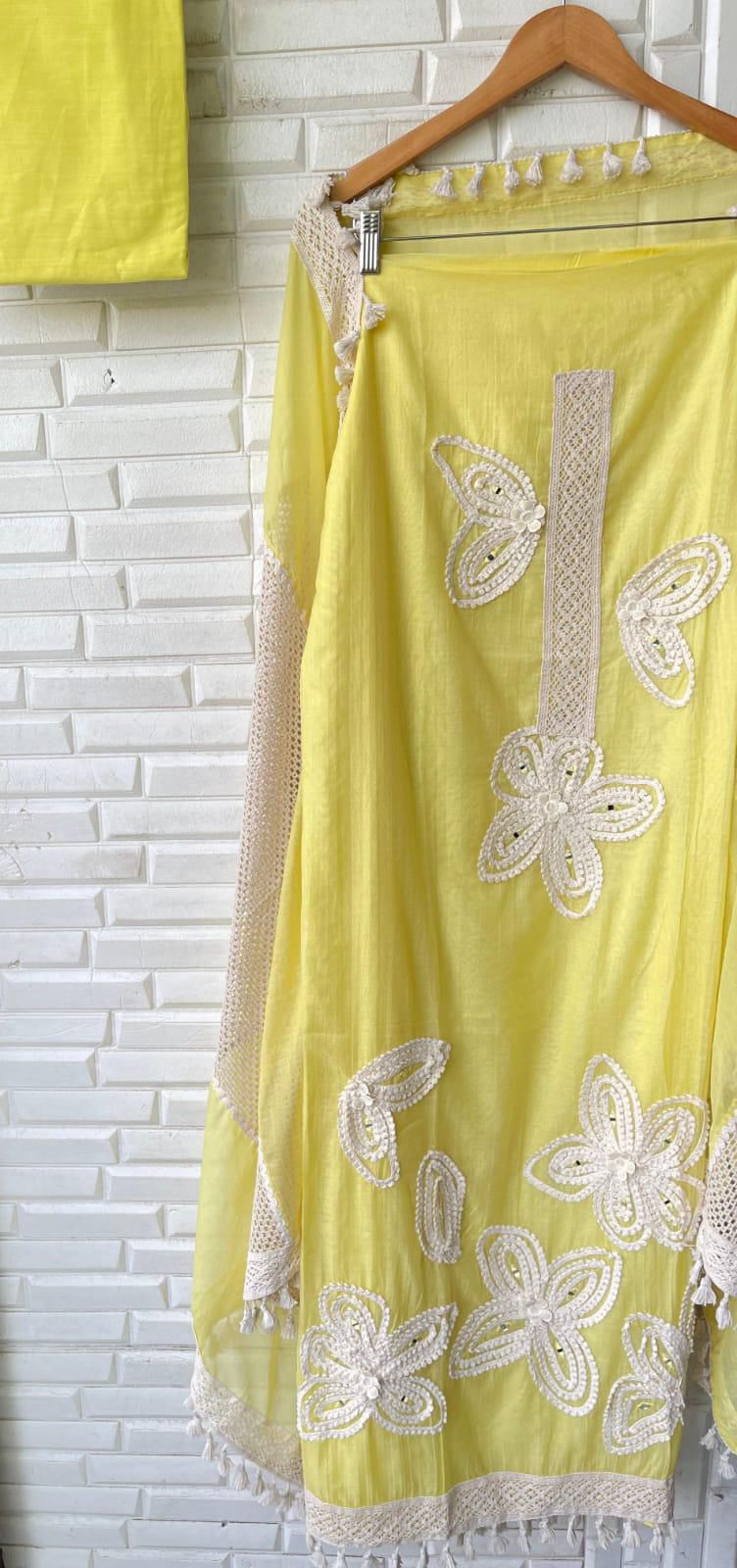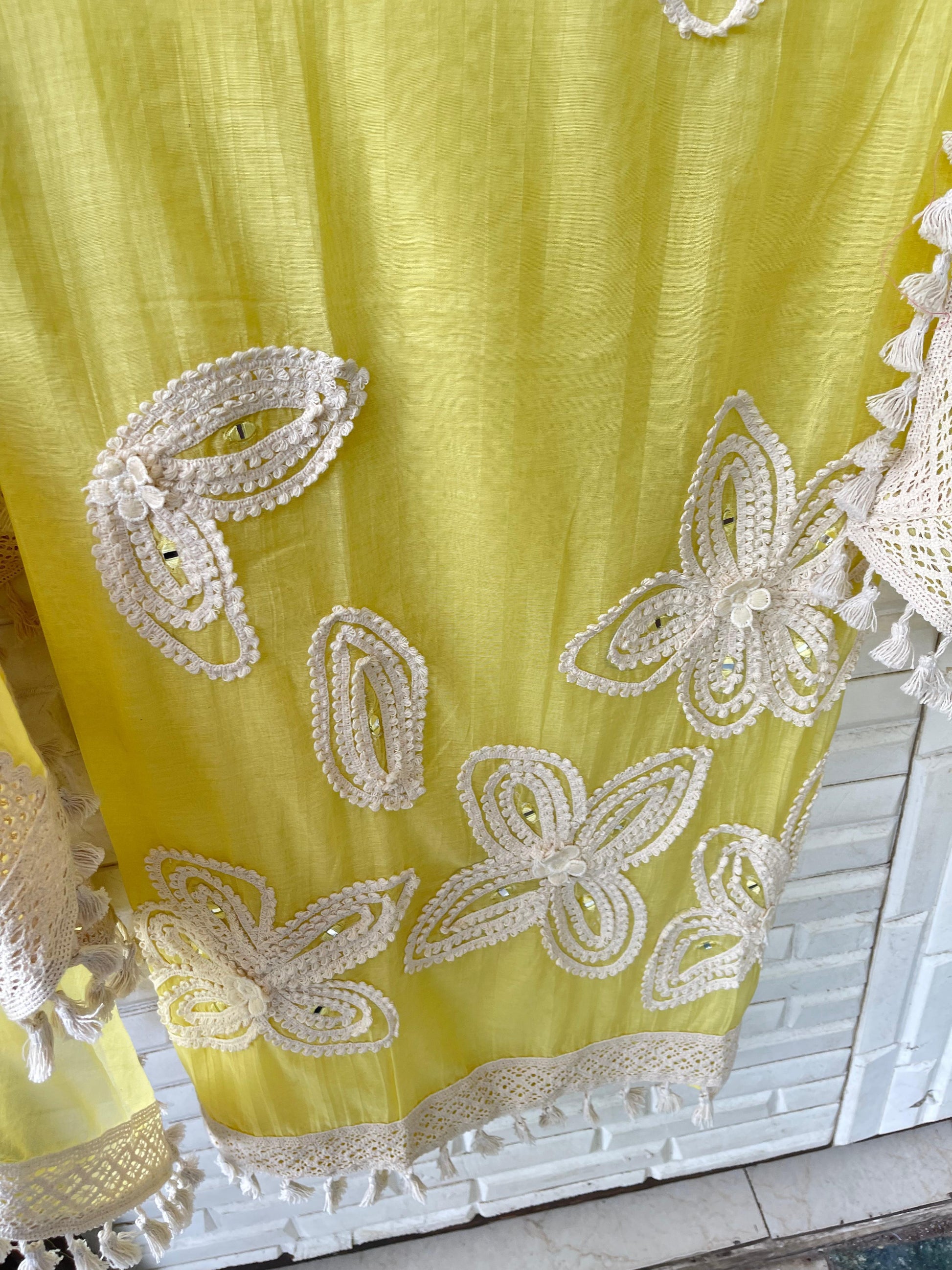 😊 mul cotton un stitched shirt with mirror work resham embroidery and crotia lace work and 3D crotia flowers and tassel lace