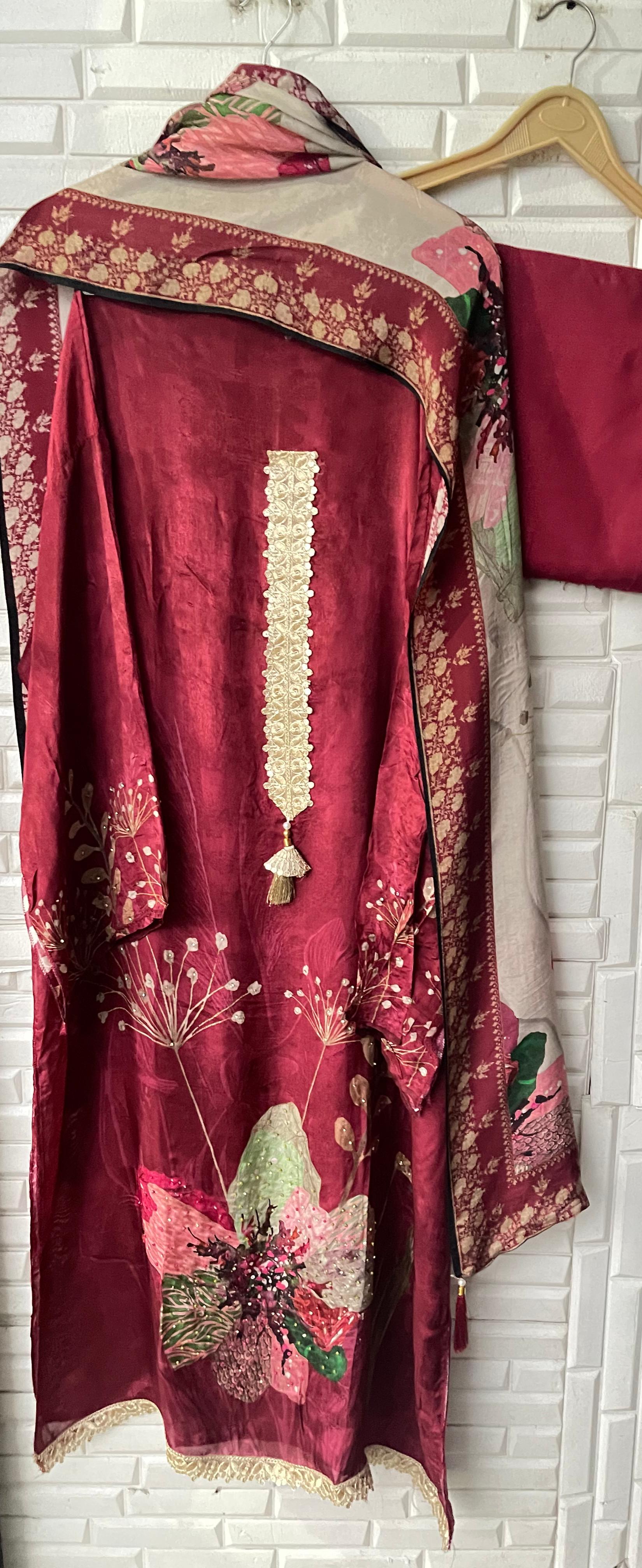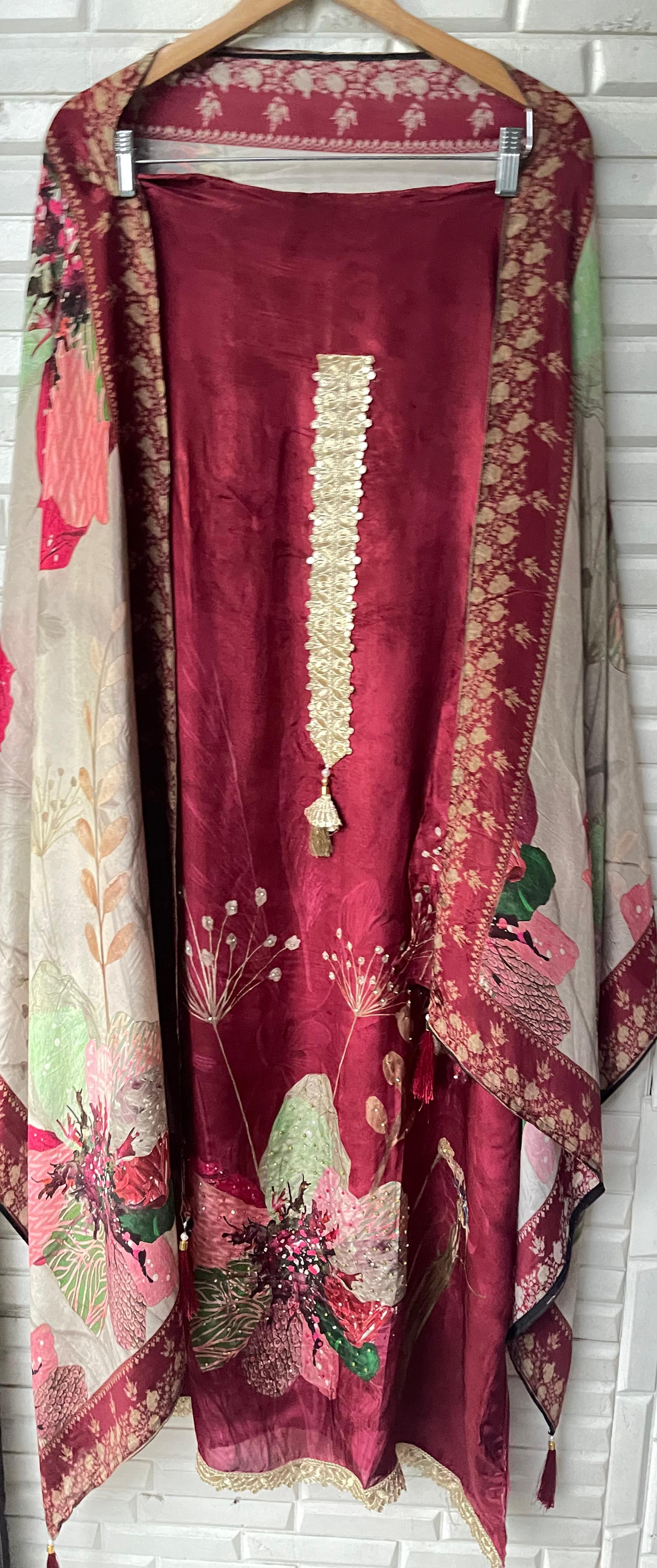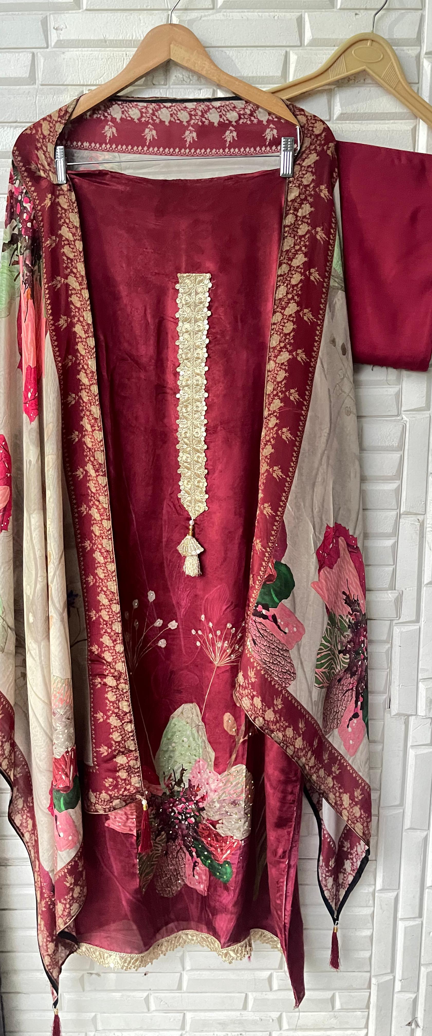 😊muslin crape unstitched shirt with jarkan and zari embroidered kurta Patti