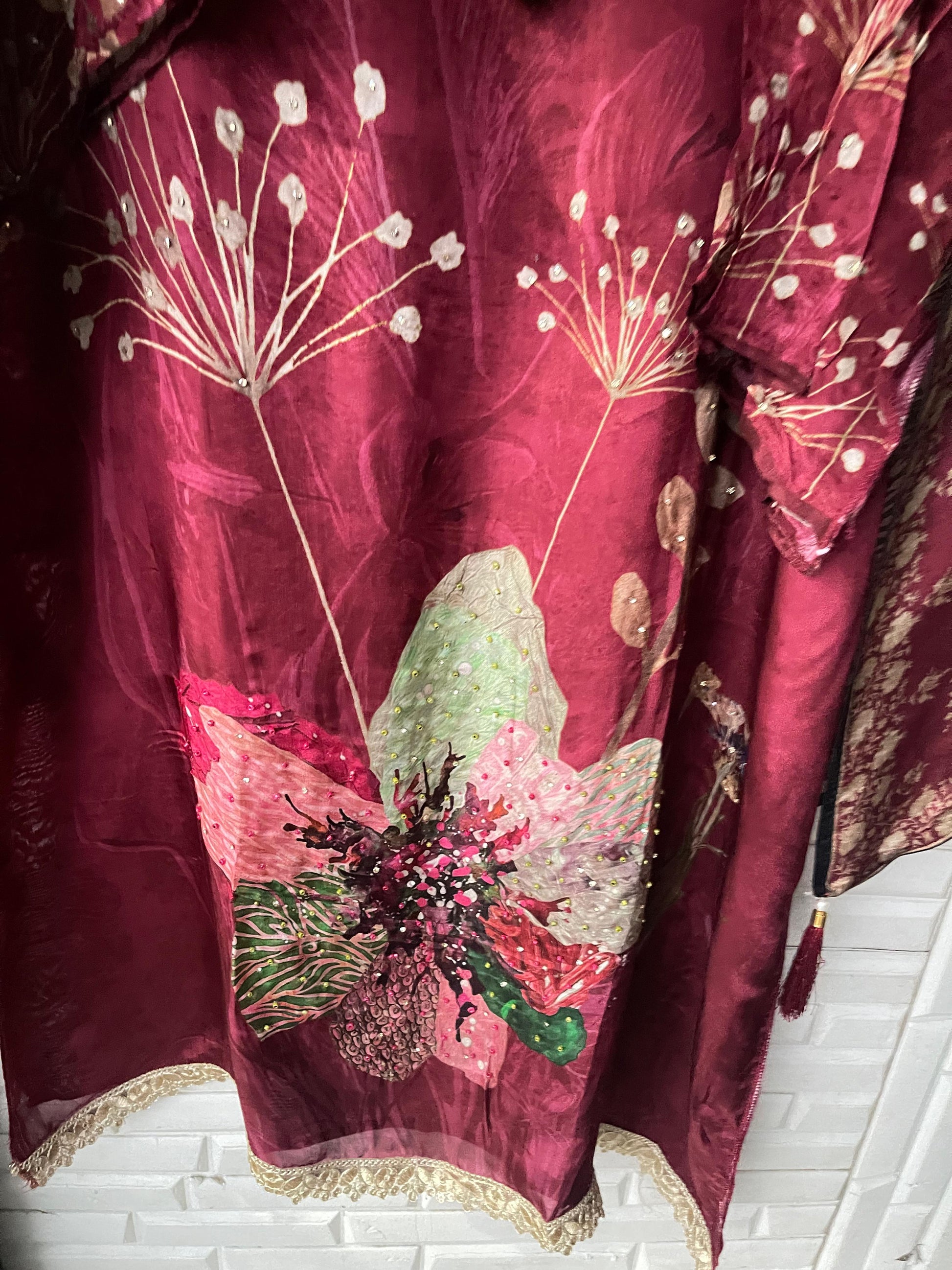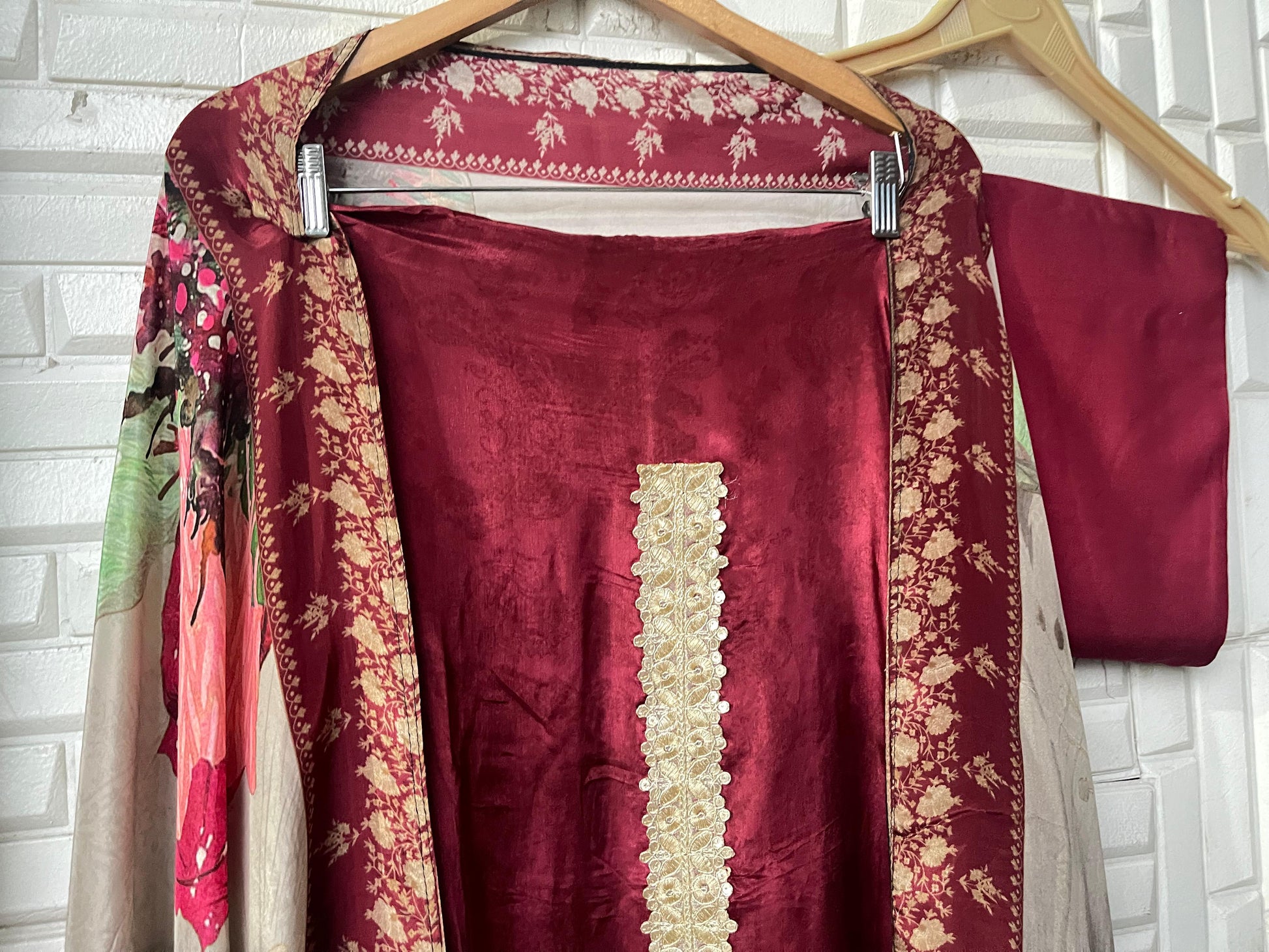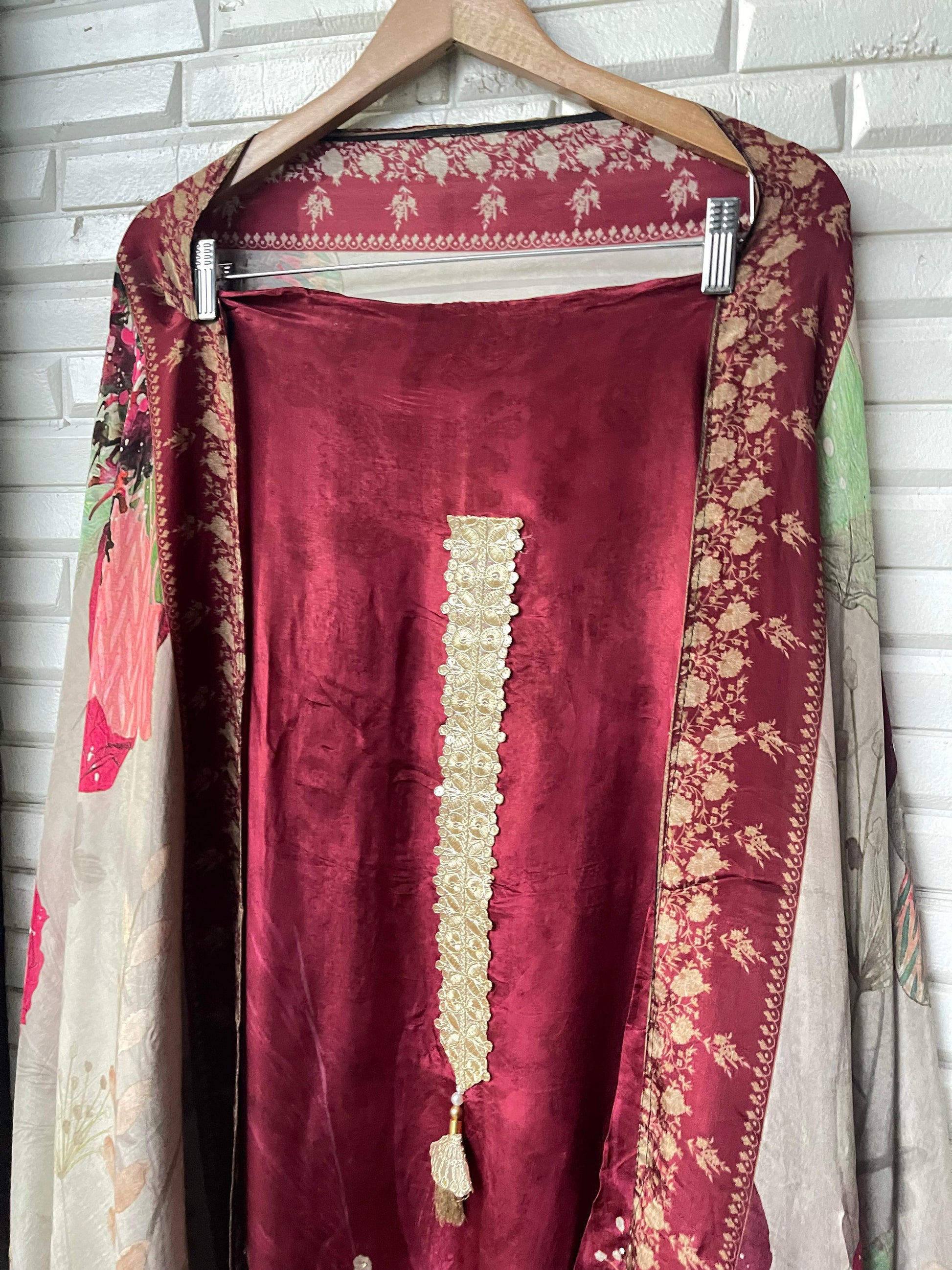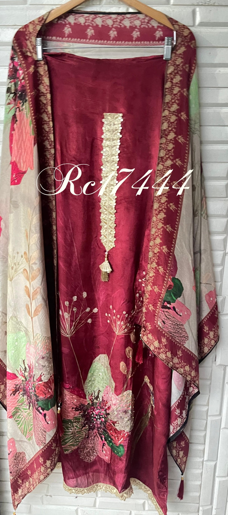 😊muslin crape unstitched shirt with jarkan and zari embroidered kurta Patti