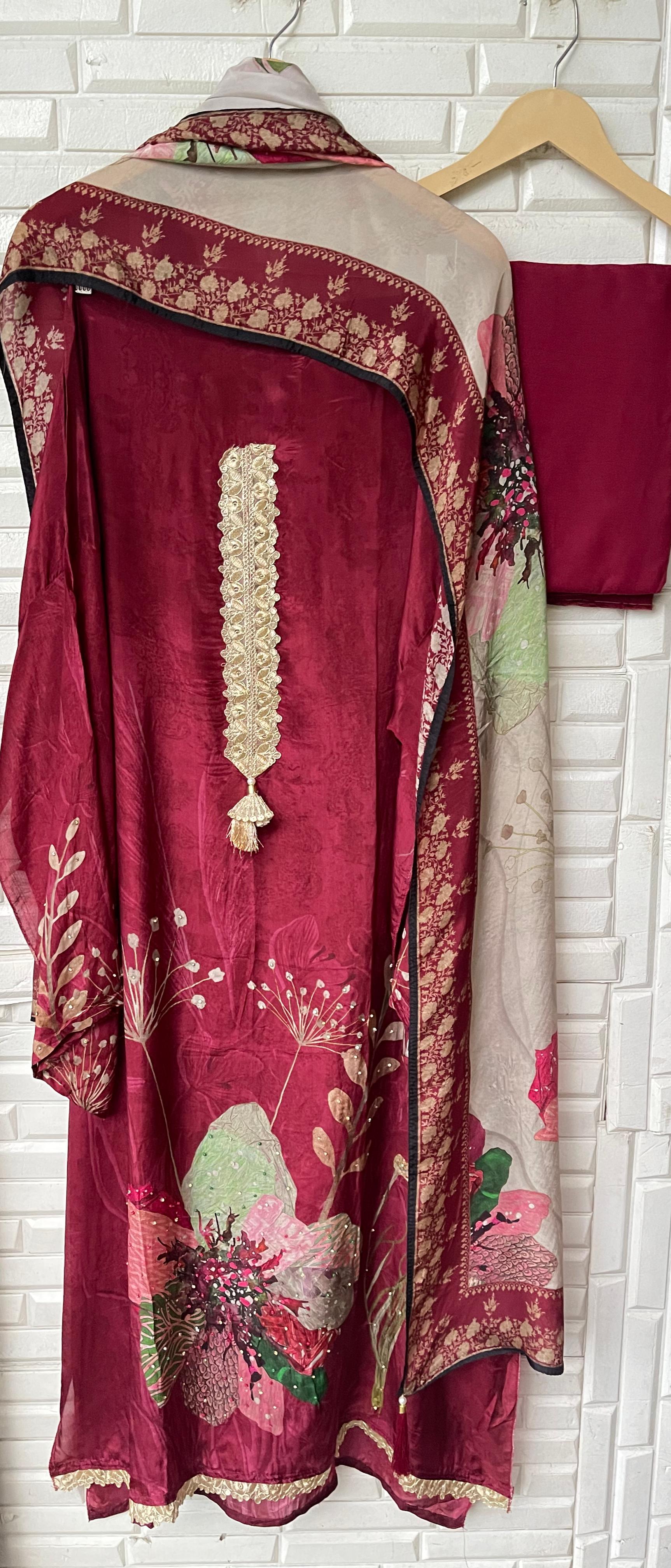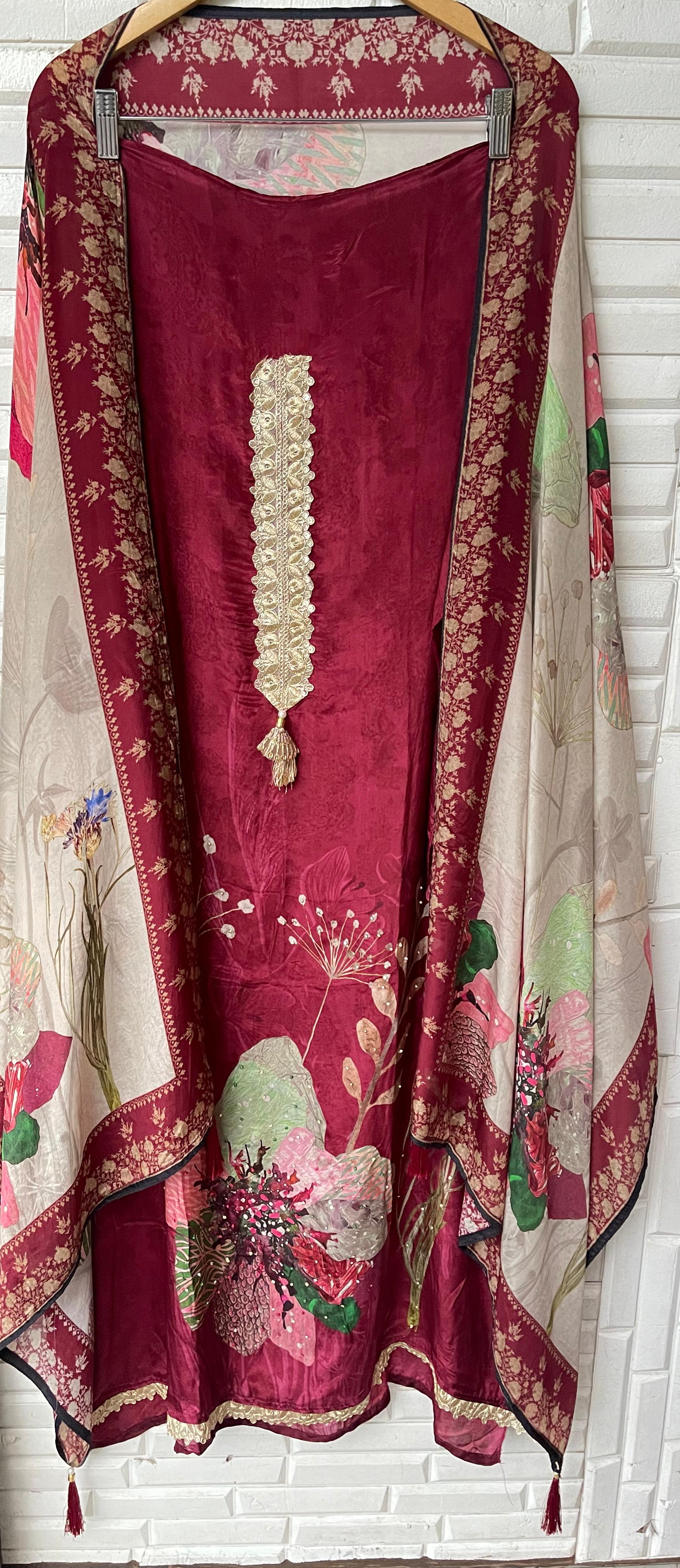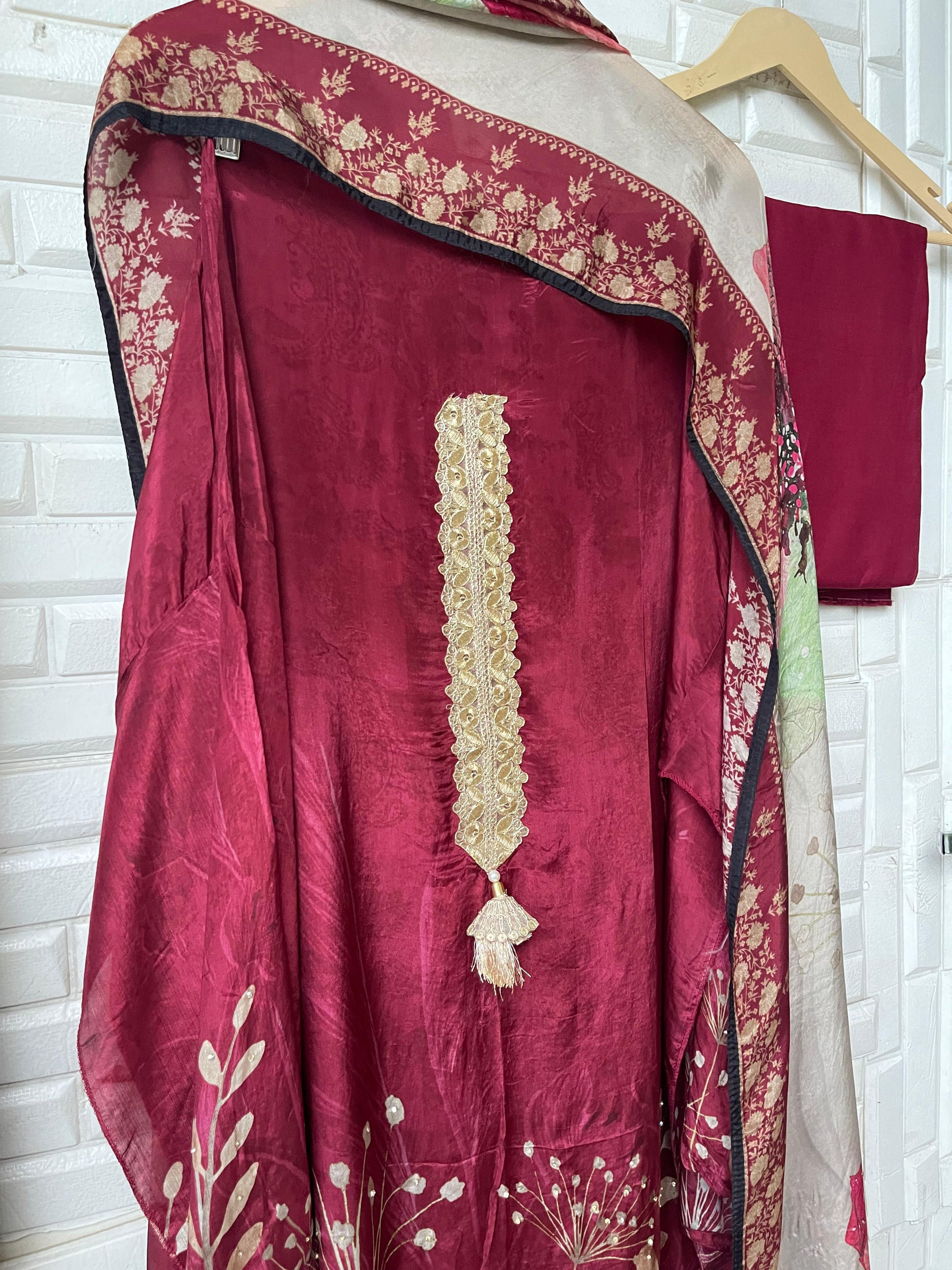 😊muslin crape unstitched shirt with jarkan and zari embroidered kurta Patti