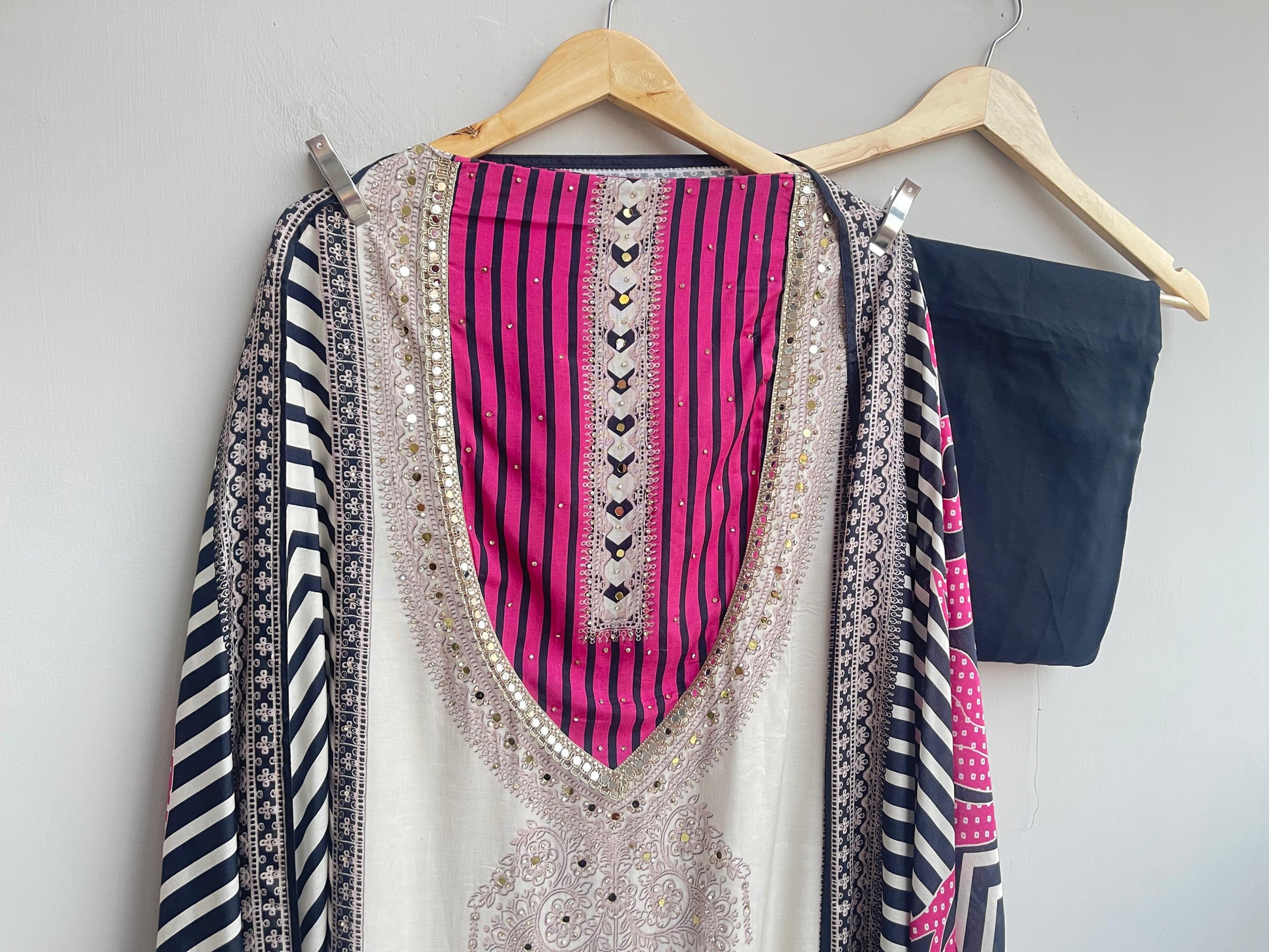 π muslin printed fabric unstitched shirt with mirror work and swarowski and highlighting