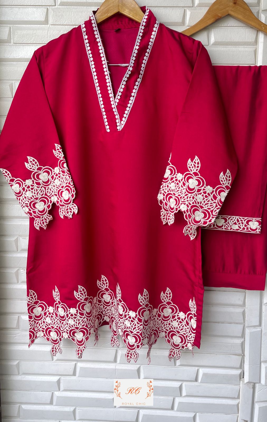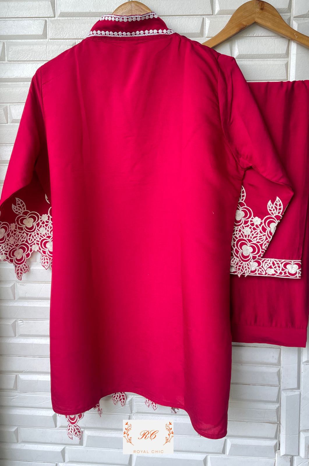 π Muslin fabric fully stitched coord set shirt with crotia lace plus resham work cutwork and attached lining